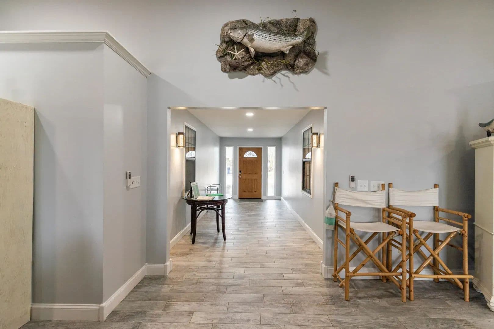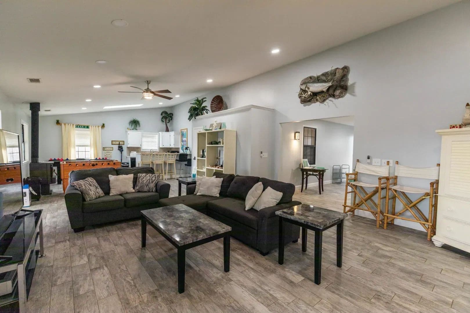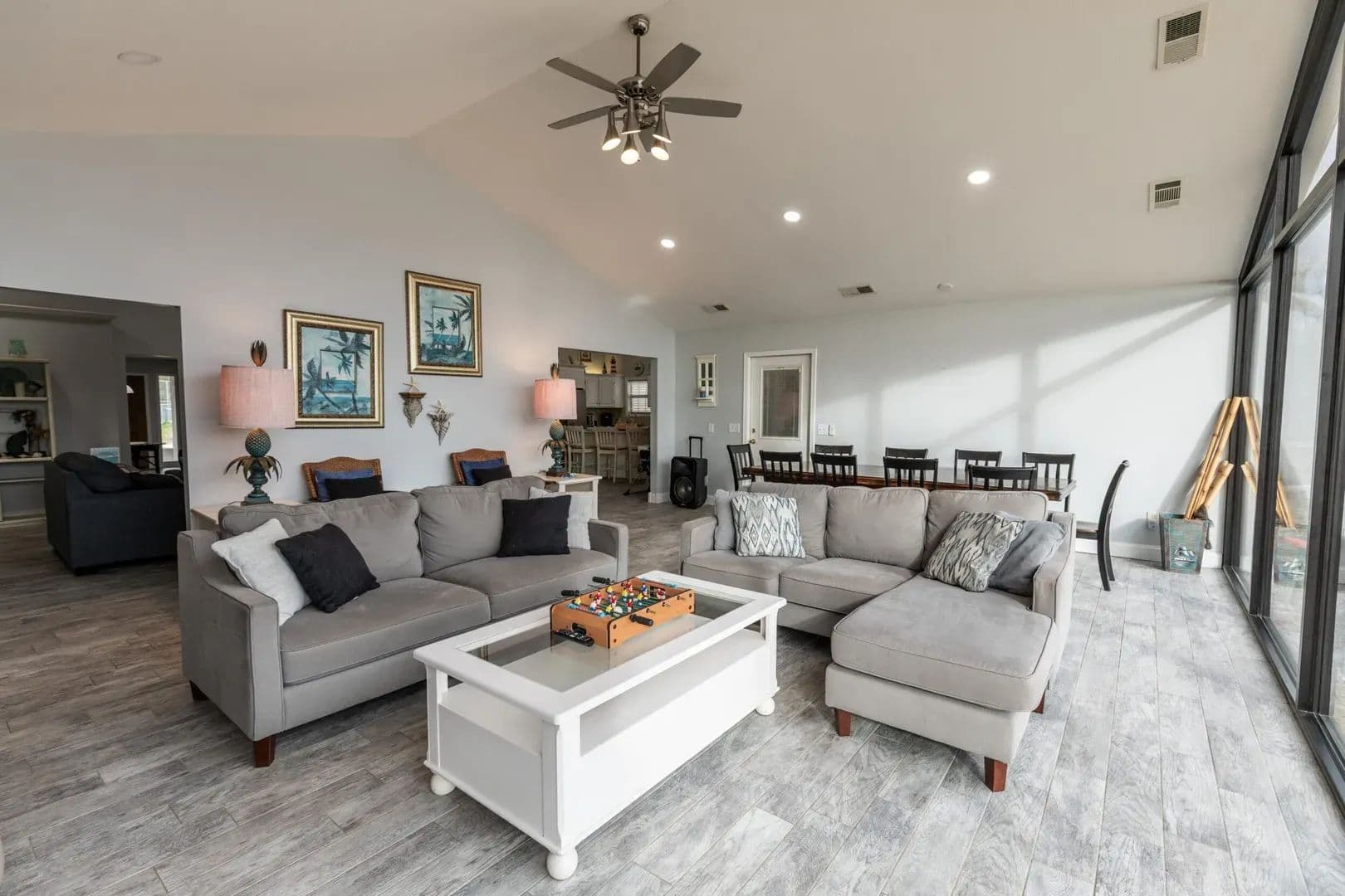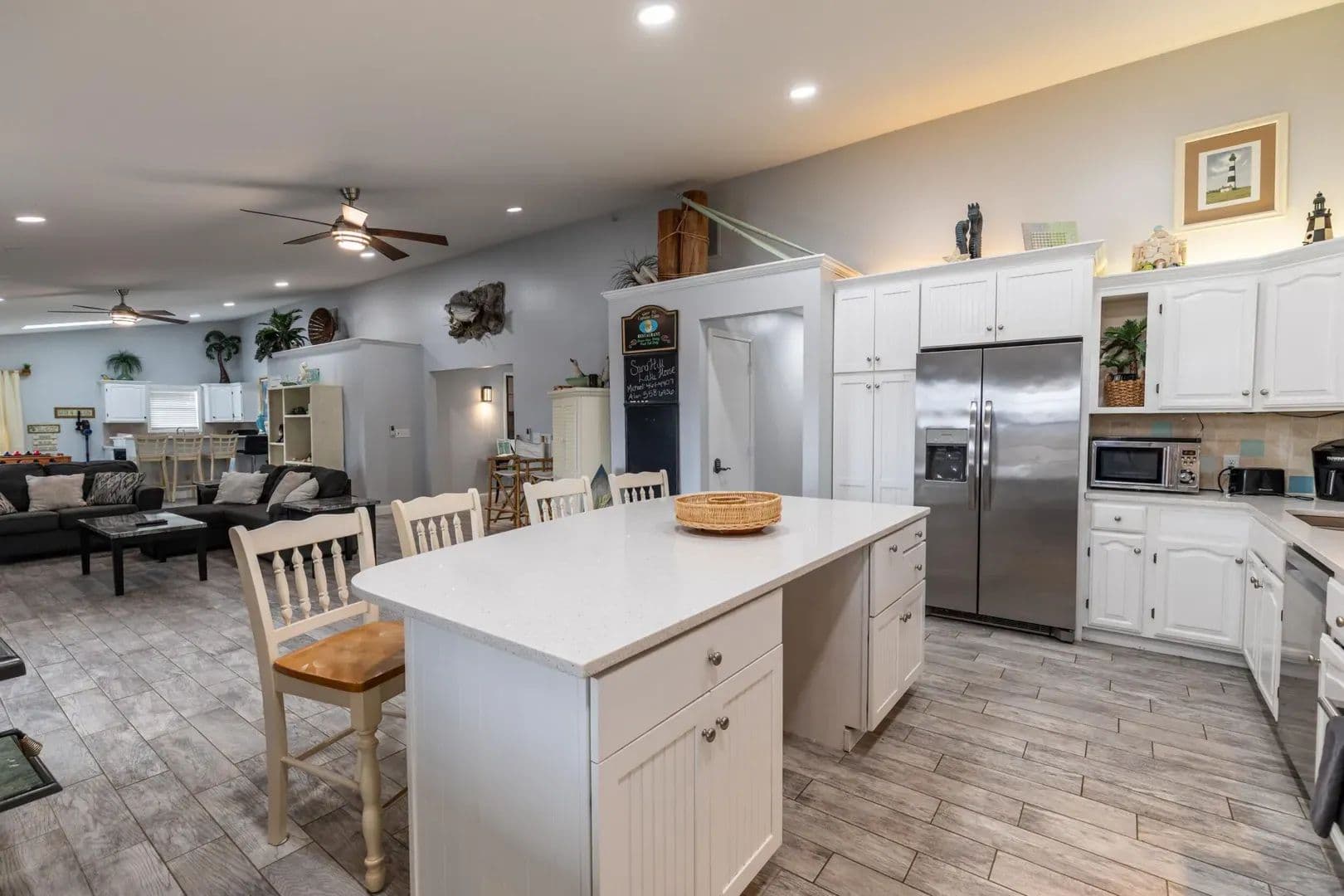 Designed for both private retreats and Airbnb success, this fully furnished 6-bedroom, 3.5-bath home offers stunning lake views from the open-concept living area. The kitchen boasts granite countertops, stainless steel appliances, and a gas stovetop, seamlessly flowing into a wet bar and entertainment space. Cozy up by one of the two fireplace stoves, or step into the hot tub room, which leads directly to the sandy beach. A screened-in outdoor patio allows for year-round enjoyment, while multiple TVs, foosball, and air hockey ensure indoor entertainment for guests of all ages.