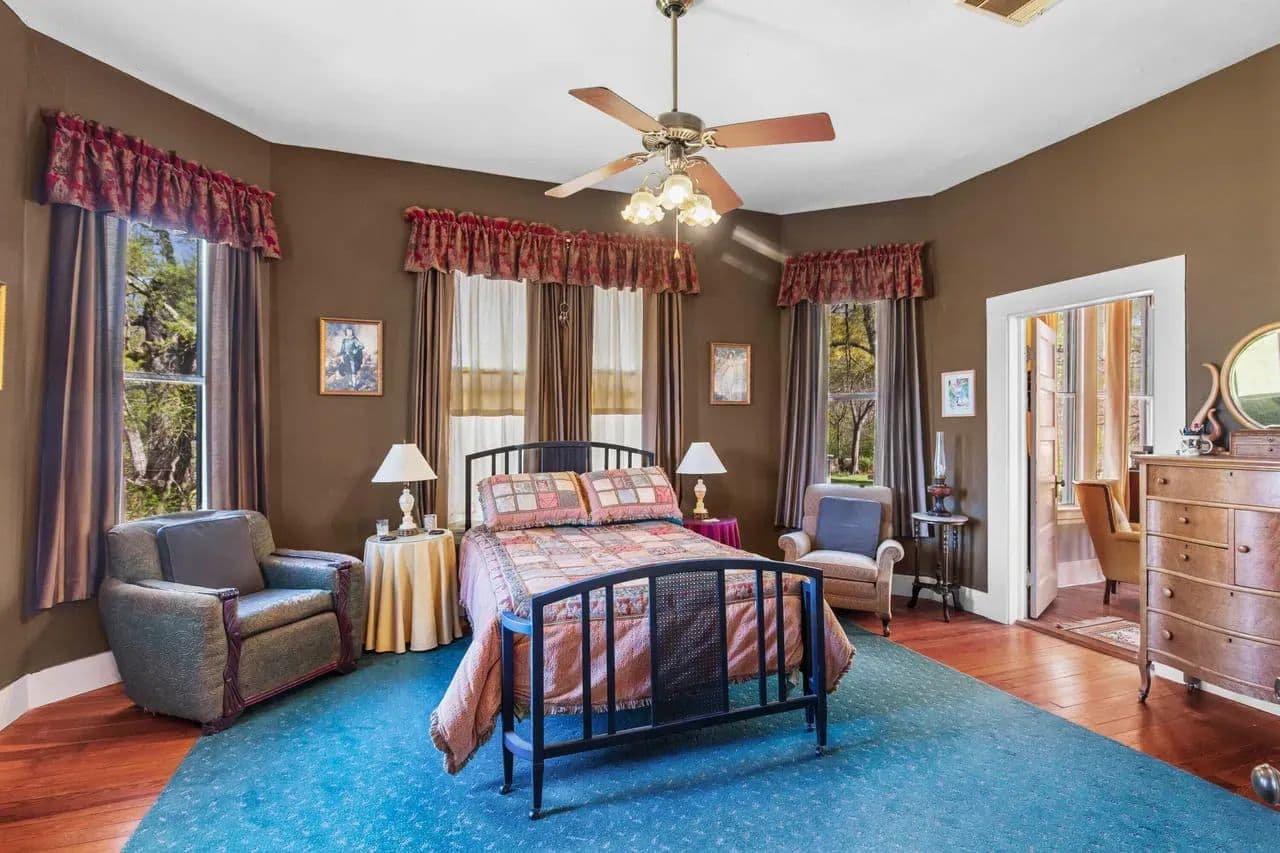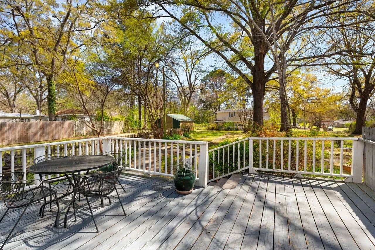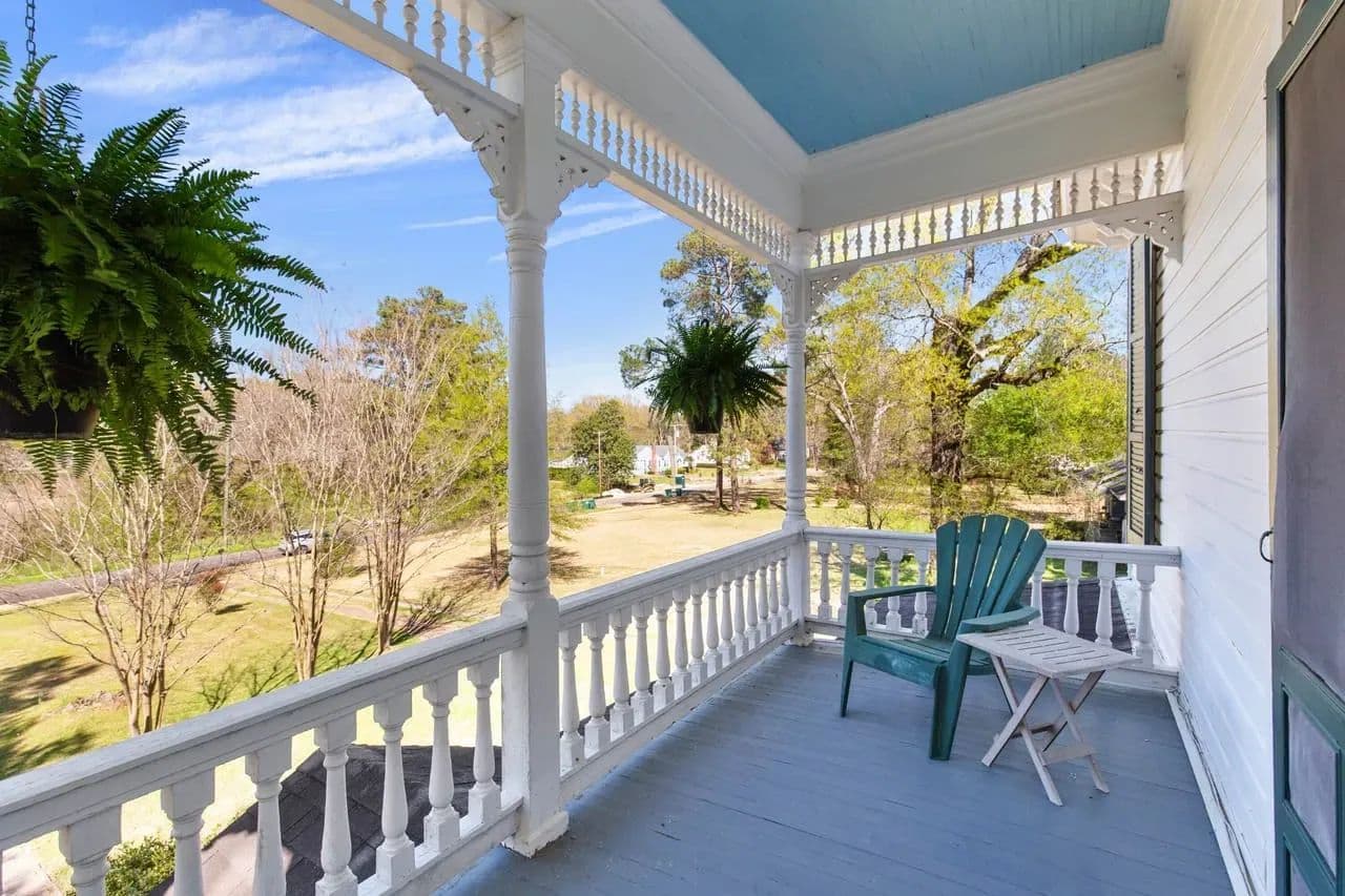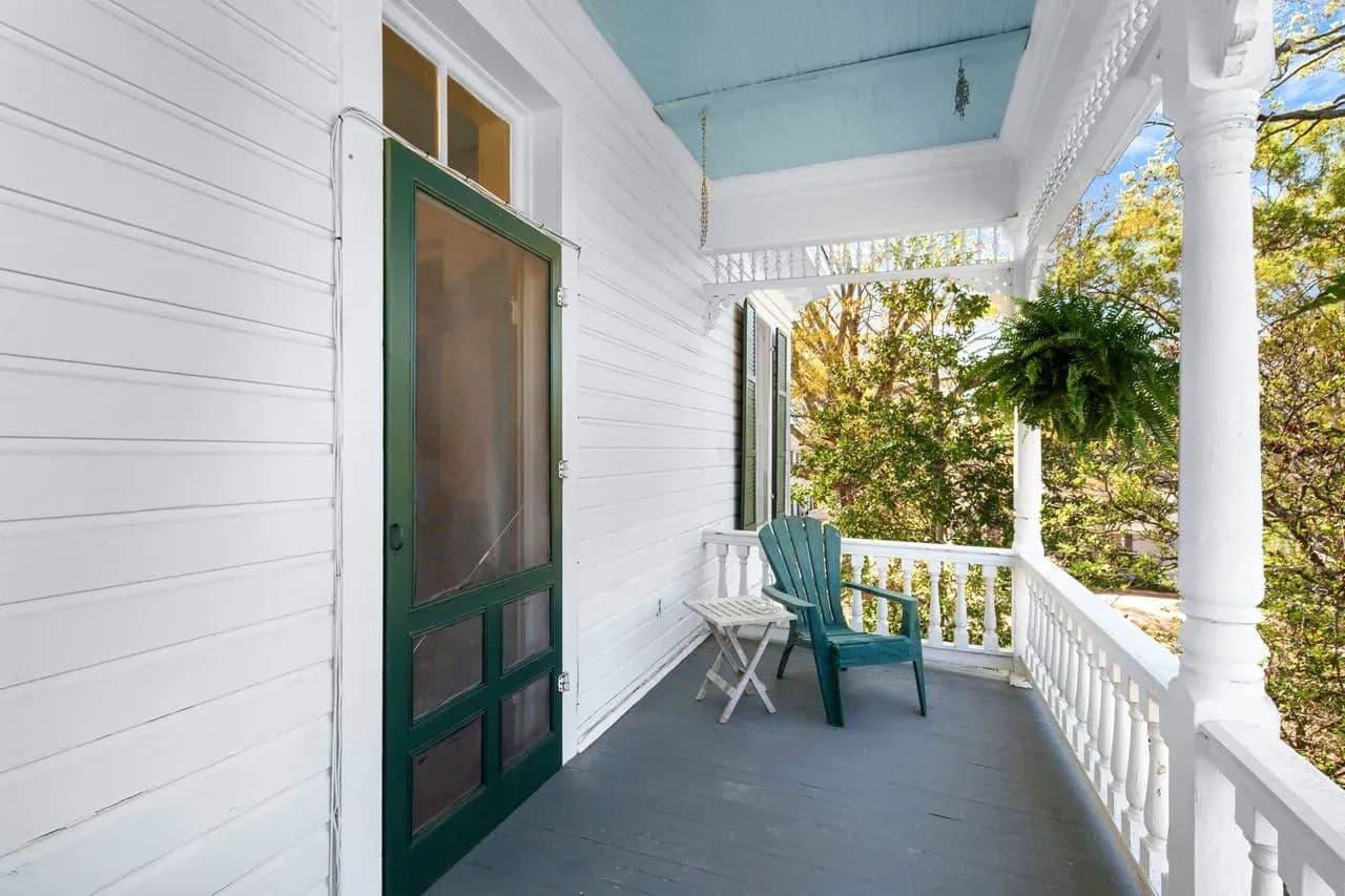 Outside, there are multiple options for relaxation. You can enjoy the tranquility of the back patio under the old oak trees, sit on the front porch, or enjoy from the upstairs balcony. Each offers unique way to appreciate the character this property.