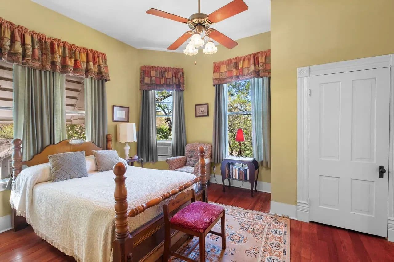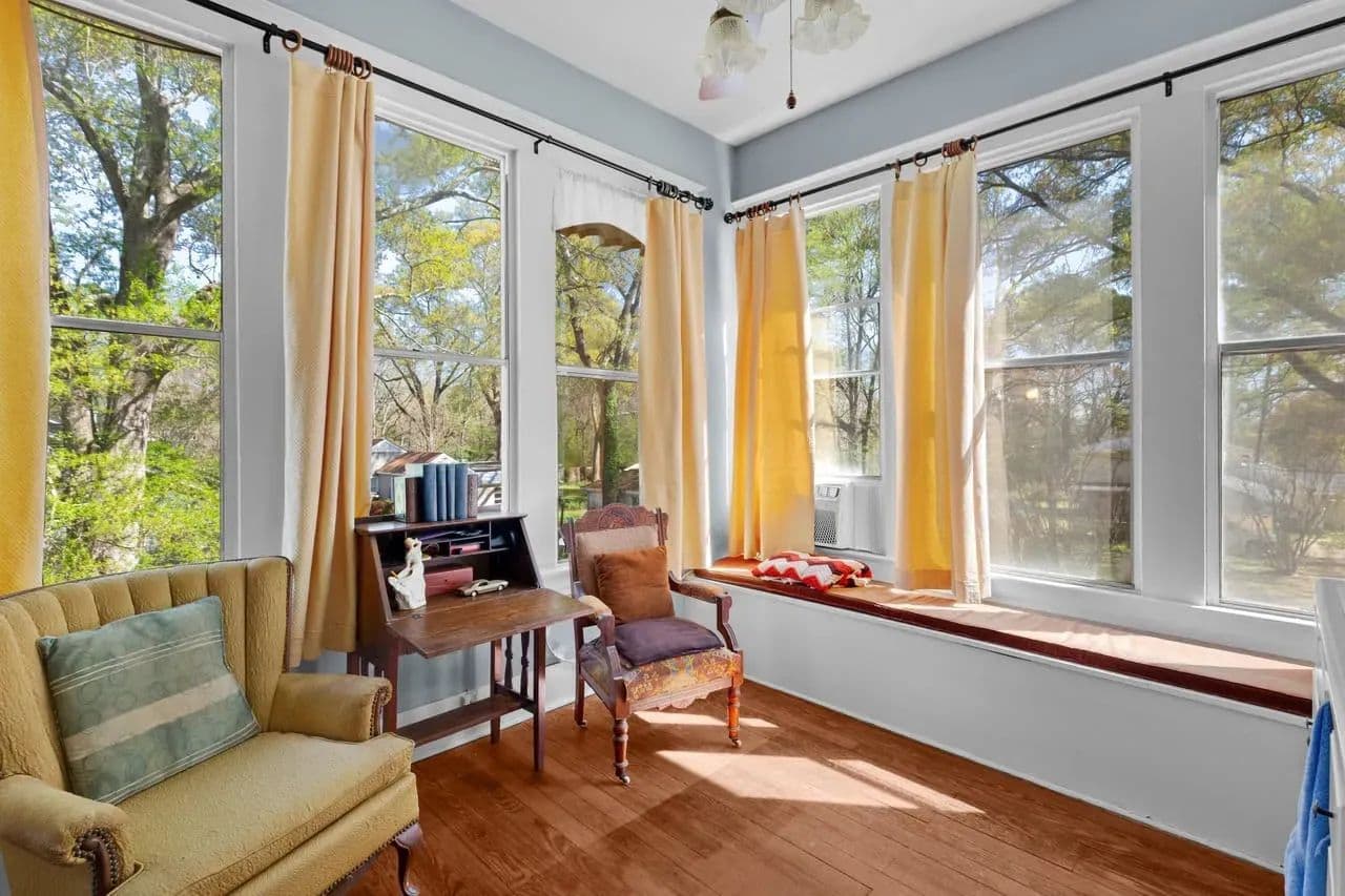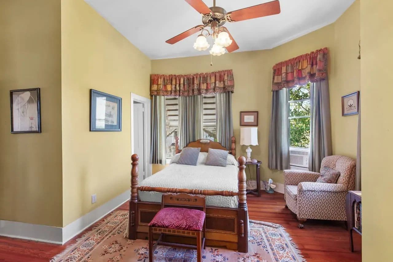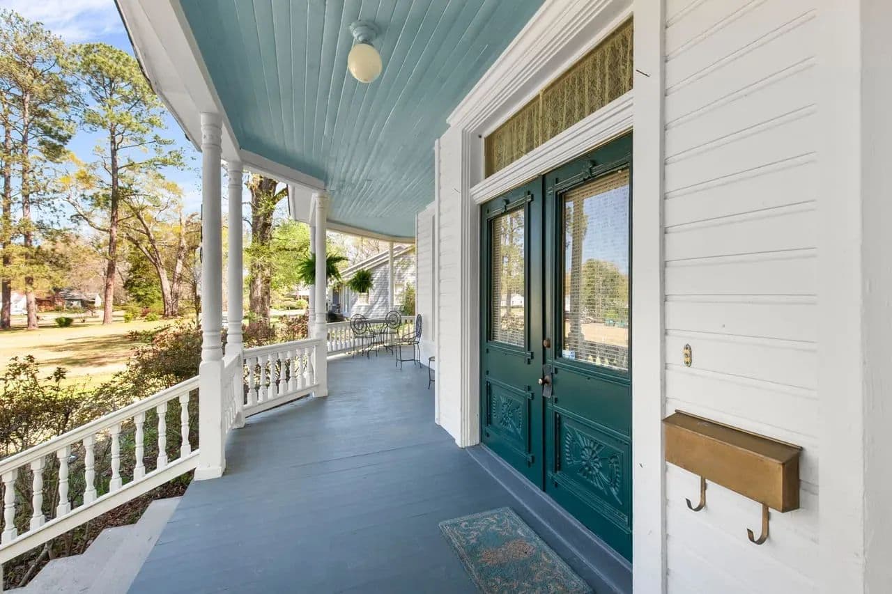 Outside, there are multiple options for relaxation. You can enjoy the tranquility of the back patio under the old oak trees, sit on the front porch, or enjoy from the upstairs balcony. Each offers unique way to appreciate the character this property.