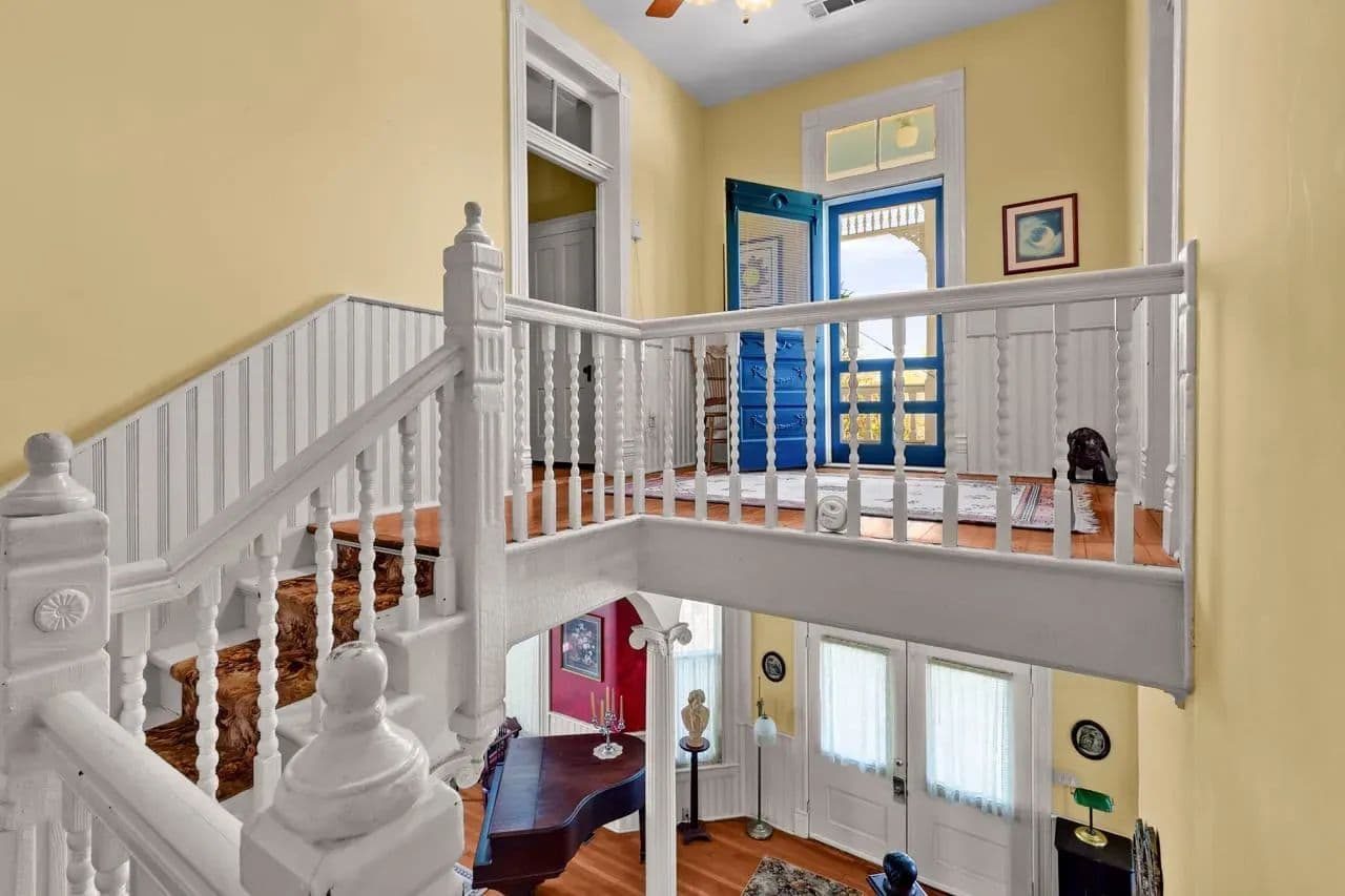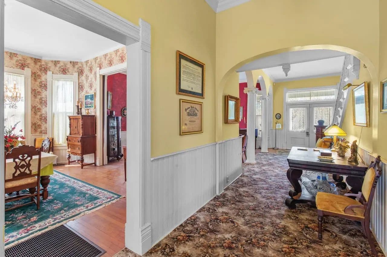 Upon entering, you are greeted by a stunning vintage staircase that leads to three upstairs bedrooms, balcony and office. To the right of the staircase just off the charming foyer, is the living room, ideal for entertaining guests. The dining room, accessed from the foyer, features beautiful original pocket doors. The architecture throughout the house is truly magnificent.