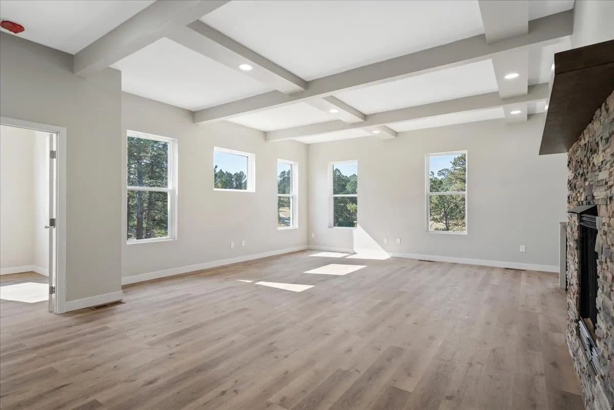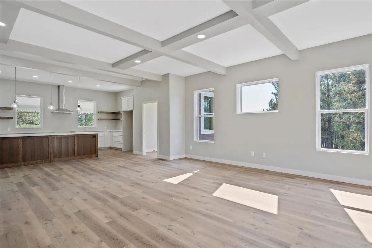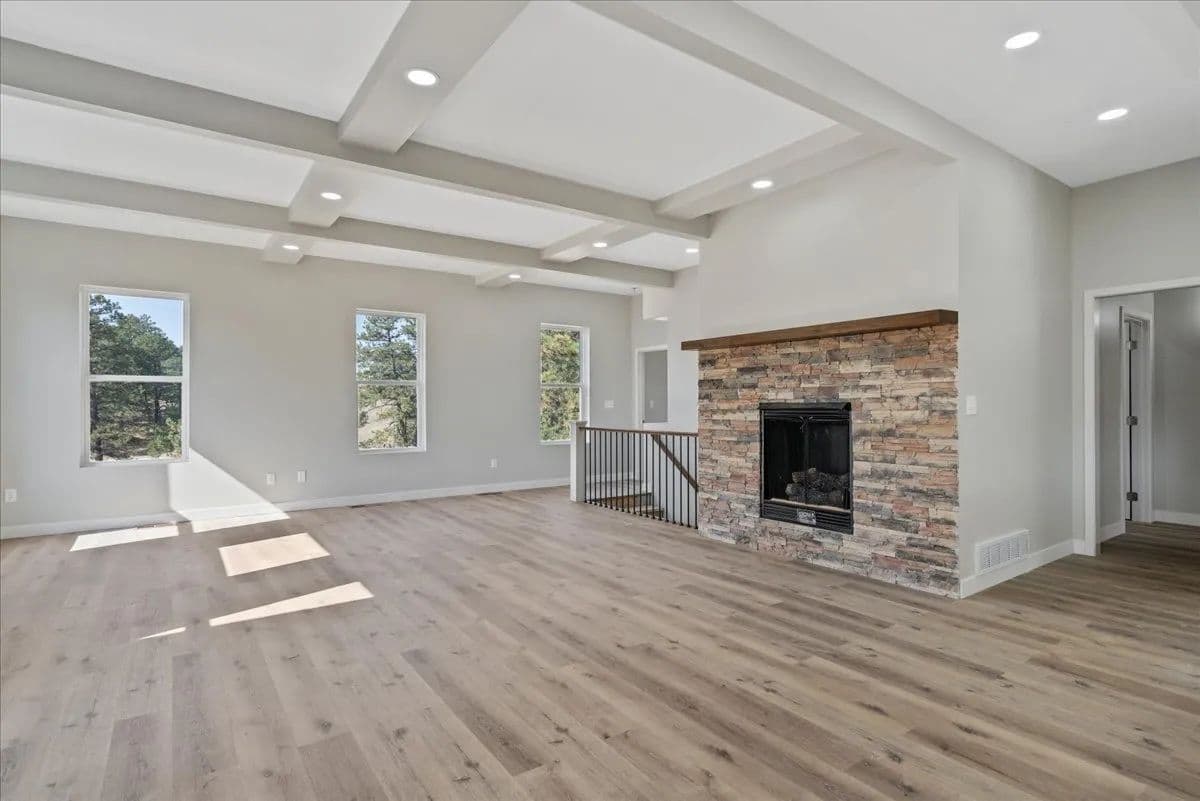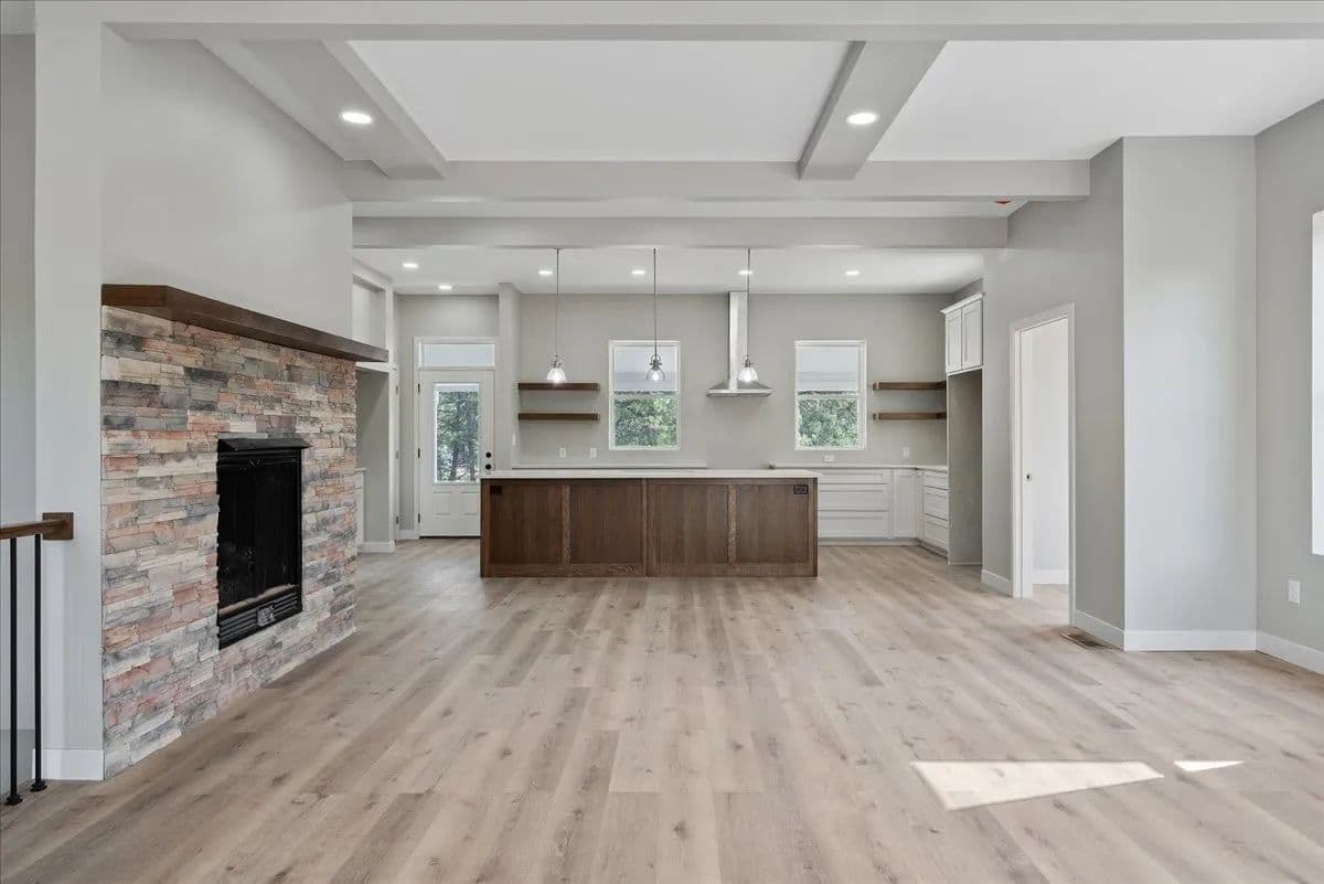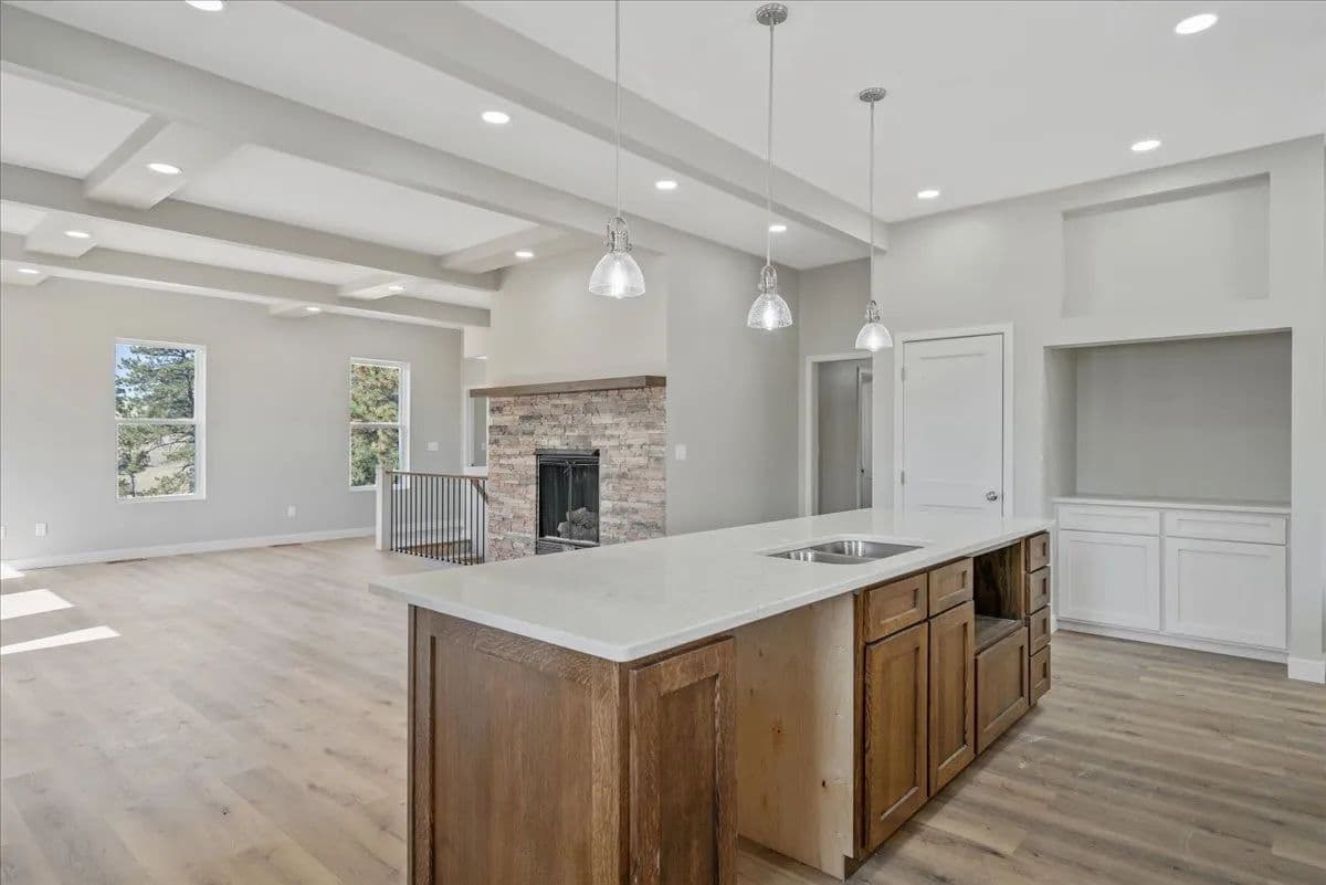 Living Spaces: Enter through the inviting wrap-around Trex deck into a sophisticated interior that exudes warmth and style. A charming coffee bar greets you to the right, perfect for morning routines or evening relaxation. The gourmet kitchen awaits to the left, adorned with custom white cabinetry, a gas stovetop oven, and an oversized fridge space. The centerpiece of this culinary haven is a stunning oak island bar with quartersawn oak trim, granite countertops, and pendant lighting. This space is perfect for culinary creations, casual dining, and entertaining guests. The open-concept kitchen flows seamlessly into an upstairs living room featuring coffered ceilings, an abundance of windows that flood the space with natural light, and a striking stone wall with a gas fireplace, creating an ambiance of warmth and elegance.