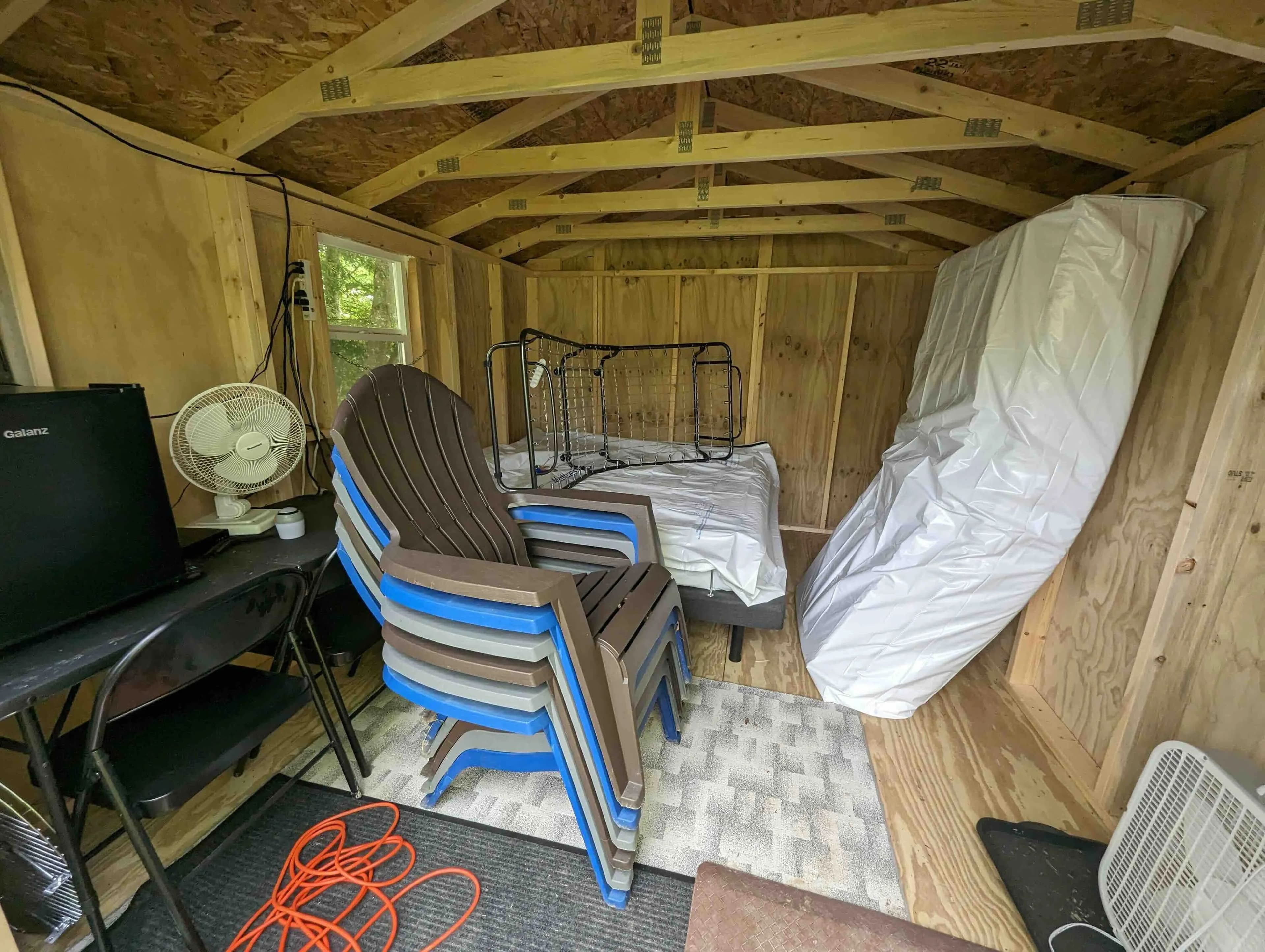At the heart of the property is a 14-ft deep pond with a center island, located next to the second campsite, which features two cabins, each equipped with a bed, TV, refrigerator, and air conditioning. There's also a graveled area for multiple RVs overlooking the water, making this perfect setup for hosting friends and family.