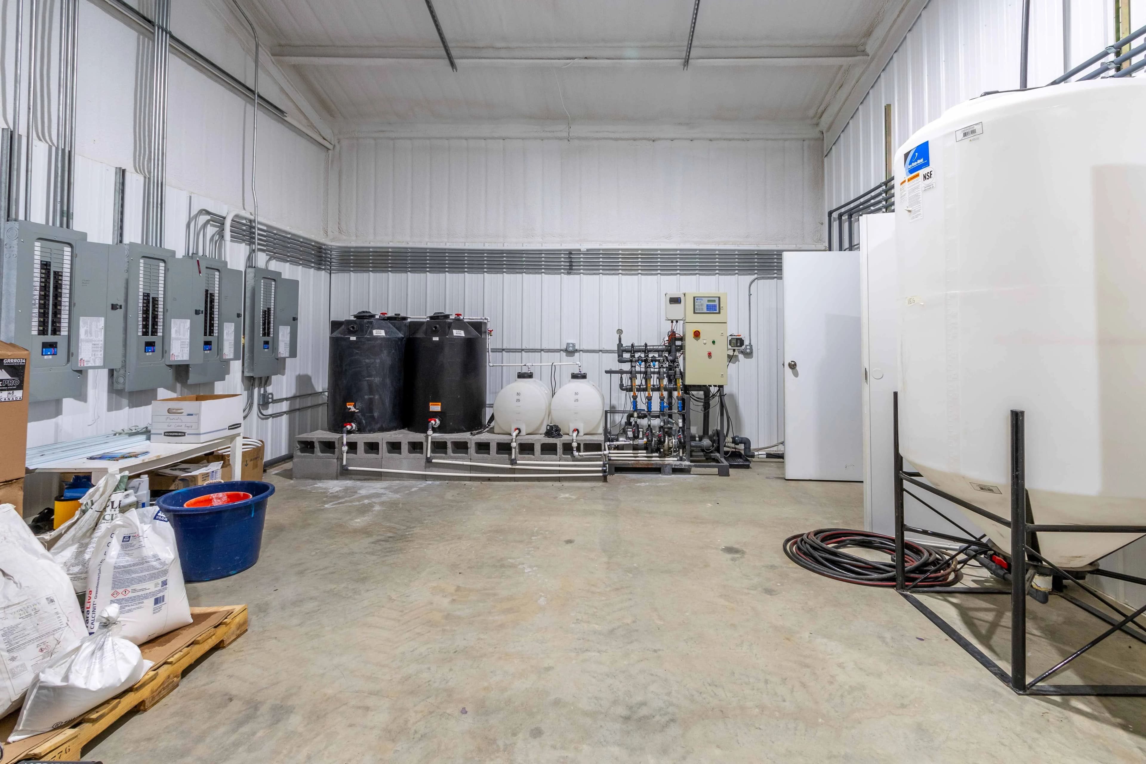 The irrigation room features a 2,500 GPD reverse osmosis system, a 2,500-gallon storage tank, a Hanna Instruments HI 10000 Fertigator, and multiple nutrient tanks, ensuring the production of pure water and precise feeding. A specialized dry room maintains harvest security with precise temperature and humidity control.