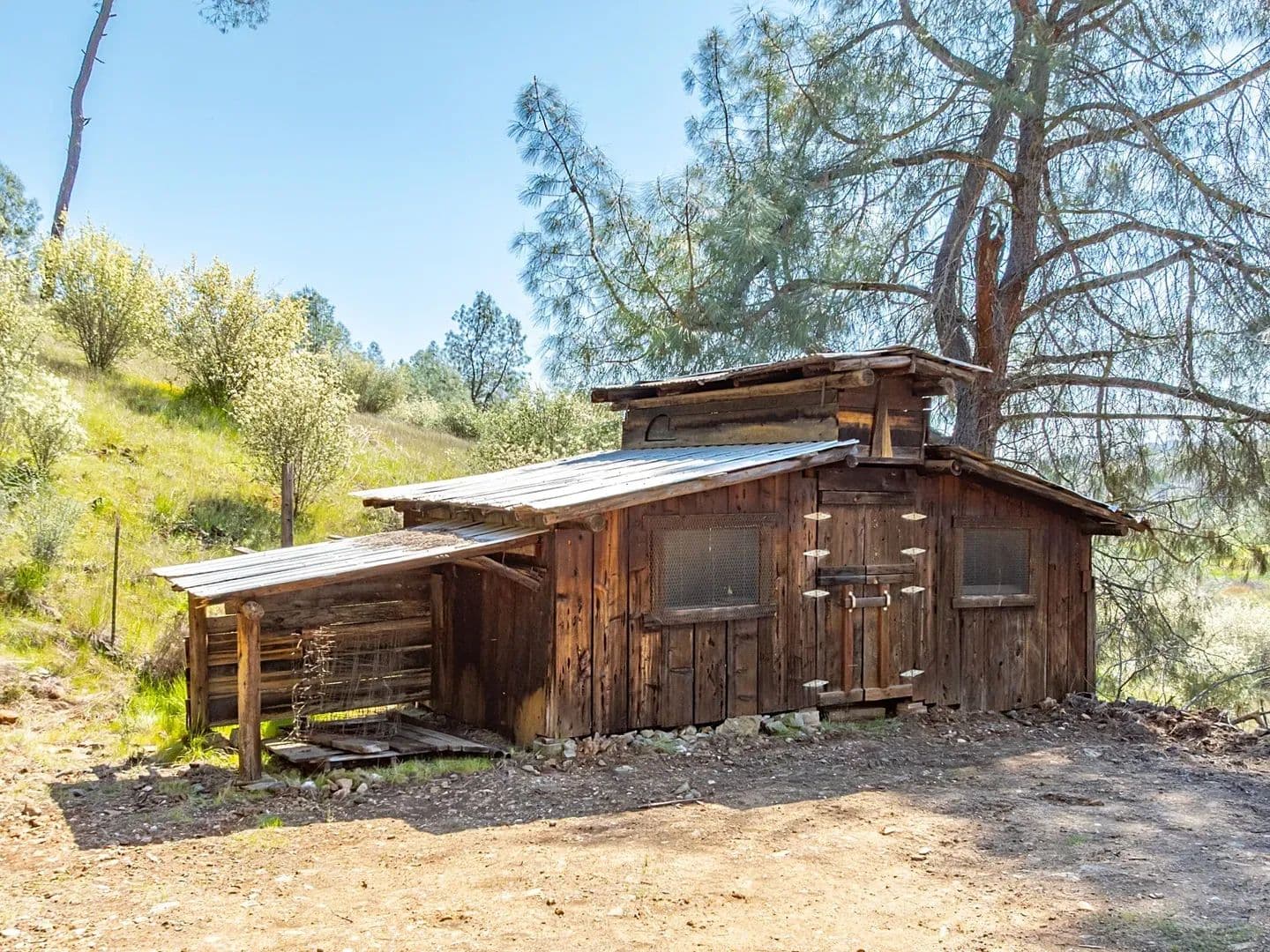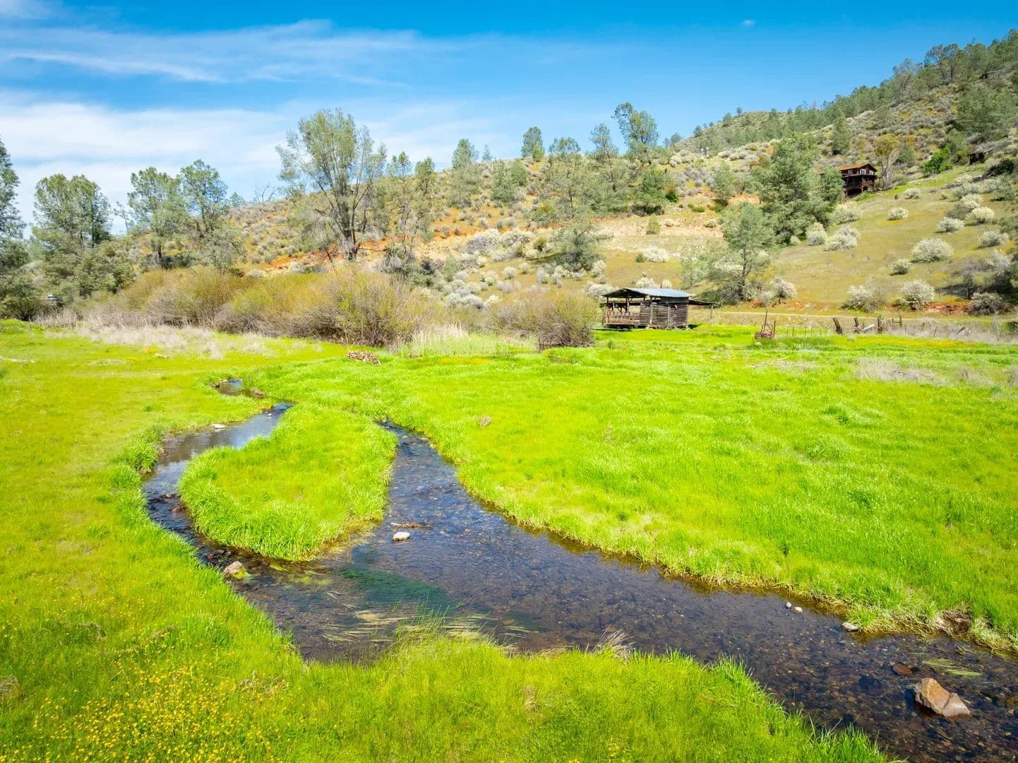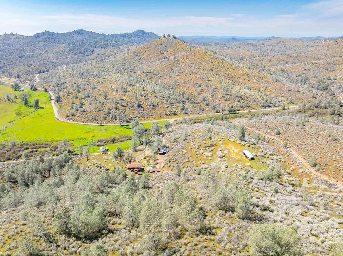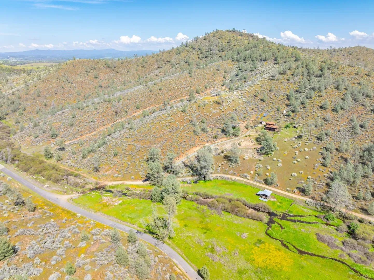 This property ranges from 1,000’ – 1,280 and is adjacent to public land on three sides. The property has convenient, well-maintained access via Red Hills Road and Six Bit Ranch Road. The gravel driveway to the ranch center features tree-covered rolling hills, valleys and expansive vistas. A second internal road provides access to a hilltop pad and another outbuilding, providing expansive vistas of the area. The property includes a beautiful creek along Six Bit Gulch winding through the lower meadow area and ending in nearby Lake Don Pedro. A quartz mine is on site and a variety of native conifers, other trees and vegetation populate the land. APN: 064-190-002-000