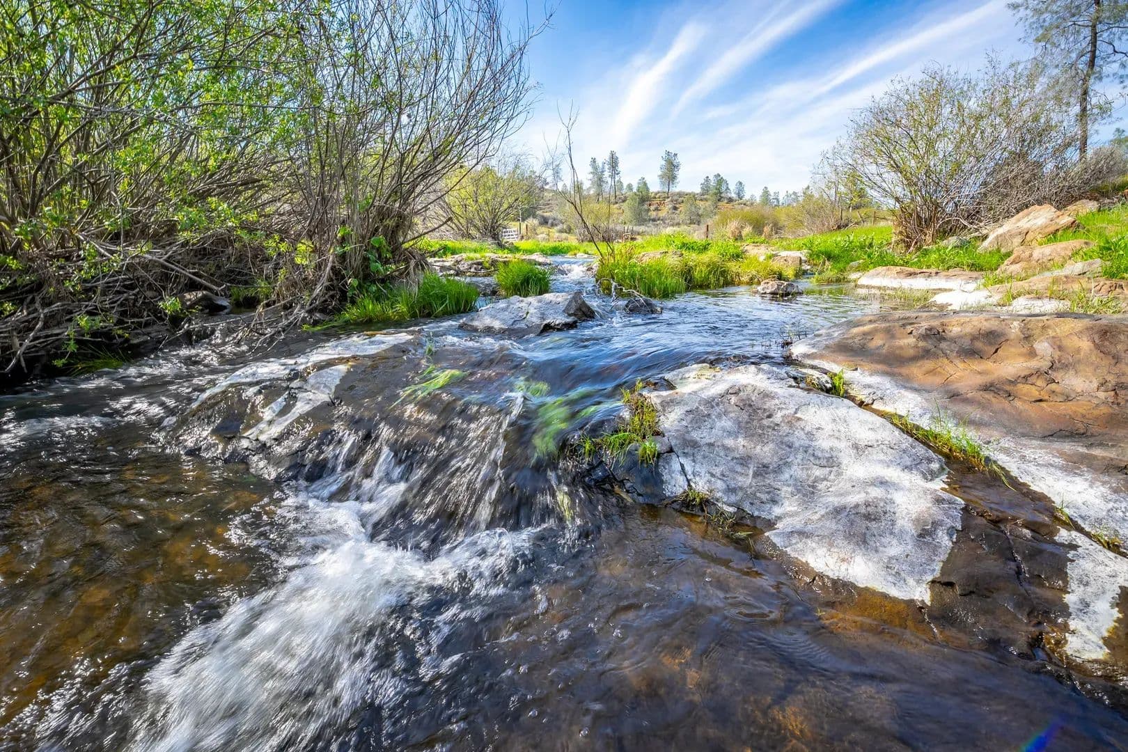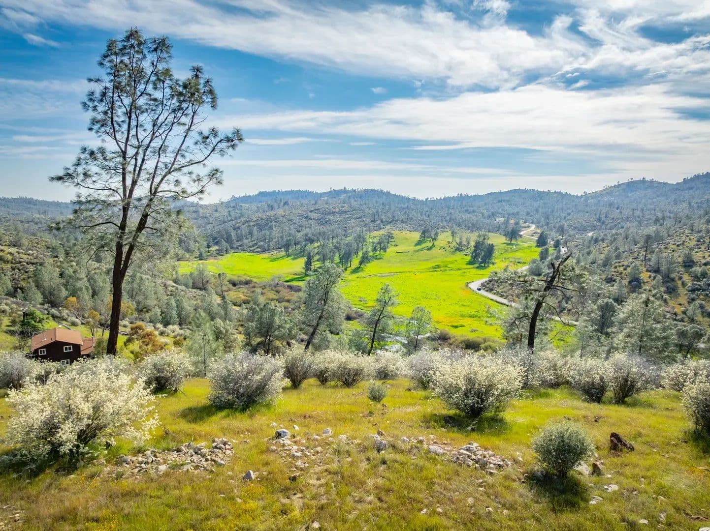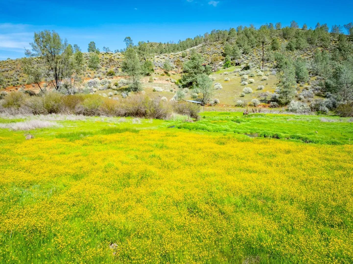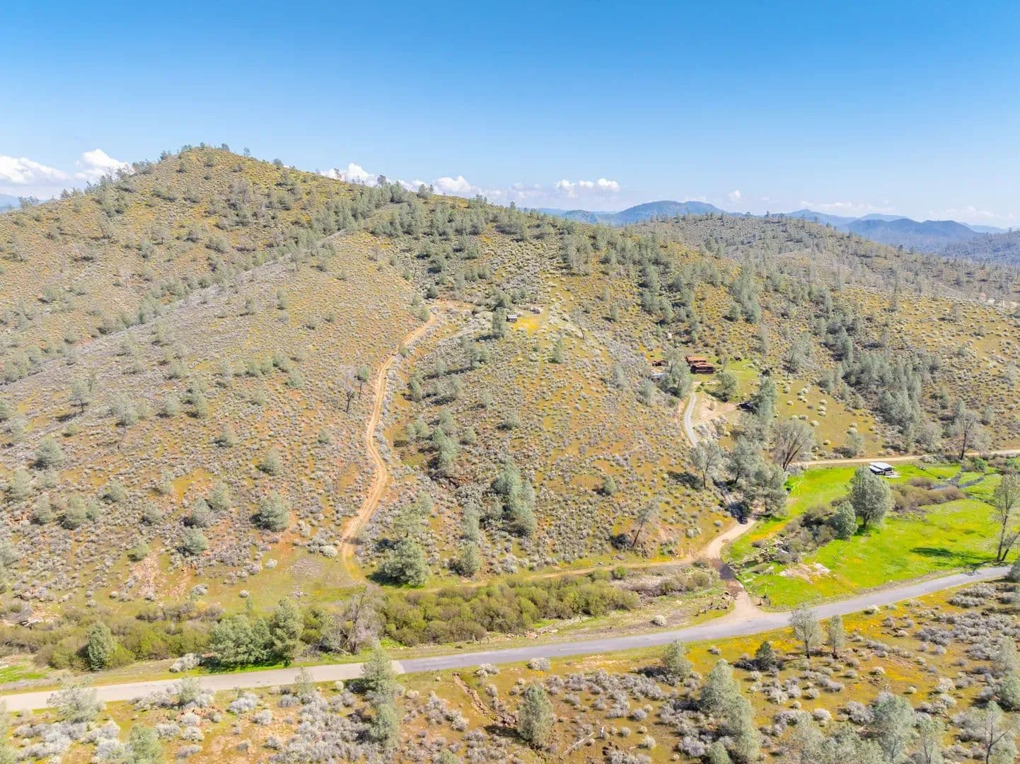 This property ranges from 1,000’ – 1,280 and is adjacent to public land on three sides. The property has convenient, well-maintained access via Red Hills Road and Six Bit Ranch Road. The gravel driveway to the ranch center features tree-covered rolling hills, valleys and expansive vistas. A second internal road provides access to a hilltop pad and another outbuilding, providing expansive vistas of the area. The property includes a beautiful creek along Six Bit Gulch winding through the lower meadow area and ending in nearby Lake Don Pedro. A quartz mine is on site and a variety of native conifers, other trees and vegetation populate the land. APN: 064-190-002-000