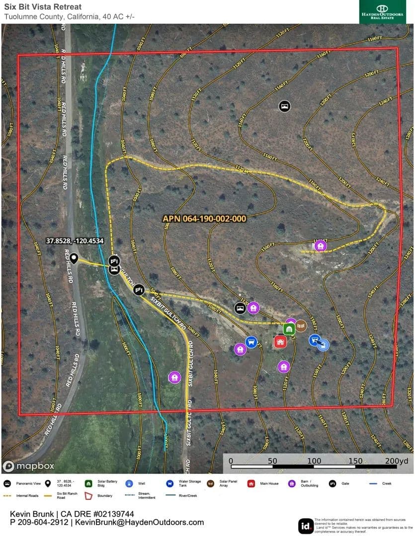 Six Bit Vista Retreat is a 40-acre property near the town of Chinese Camp in historic Tuolumne County. Minutes from CA-120, this turnkey property includes a home, barns, creek, outbuildings and more. In the scenic Red Hills area, the property offers public road access, great water sources and striking views of the area foothills. This quiet retreat property is centrally located between Groveland and Oakdale with many recreational opportunities. Land NOTE: This property was impacted by the Cal-Fire “6-5 Fire” that began on 9/2/25 with some outbuildings being burned. The home is intact along with the solar power system. Contact the agent for more updates.
