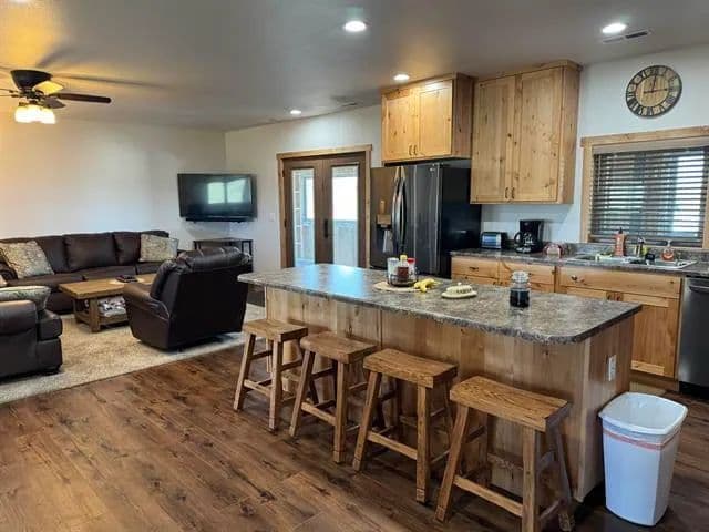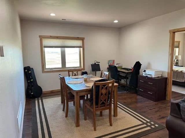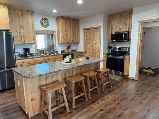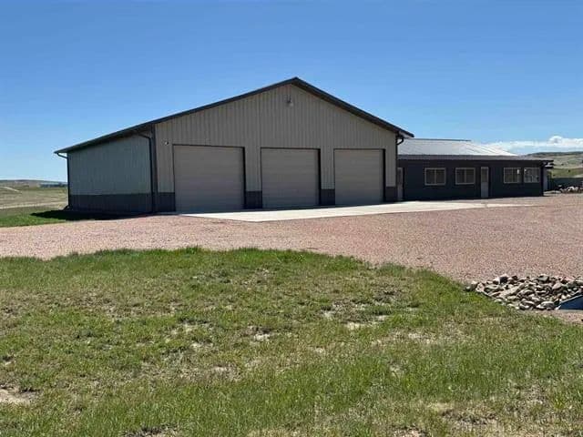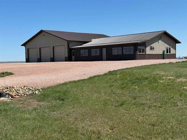 Discover a conveniently located ranchette nestled on over five acres, just a short fifteen-minute drive from Rapid City, SD! Quality "Cleary" Built Barndo- minium Style home boasting two bedrooms, two baths, and a spacious attached garage/shop. Relish in the low-maintenance lifestyle offered by this quality-built residence, featuring metal exterior construction and ample parking space including an RV. The expansive acreage showcases lush grass, a frost-free water hydrant, and the potential for fencing to accommodate two horses, in line with covenants. Step into the inviting 1,440 sq. ft. interior, designed with an open floor plan that bathes the living spaces in natural light. Adorned with Alder cabinets, doors, and trim work, the home boasts Anderson windows, plush carpeting in bedrooms and living areas, and luxury vinyl flooring throughout. The kitchen is a chef's delight, featuring a convenient island serving/prep area, stainless steel appliances, and a generous pantry.