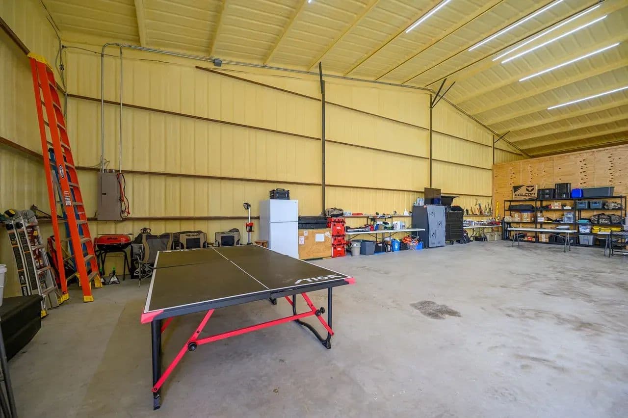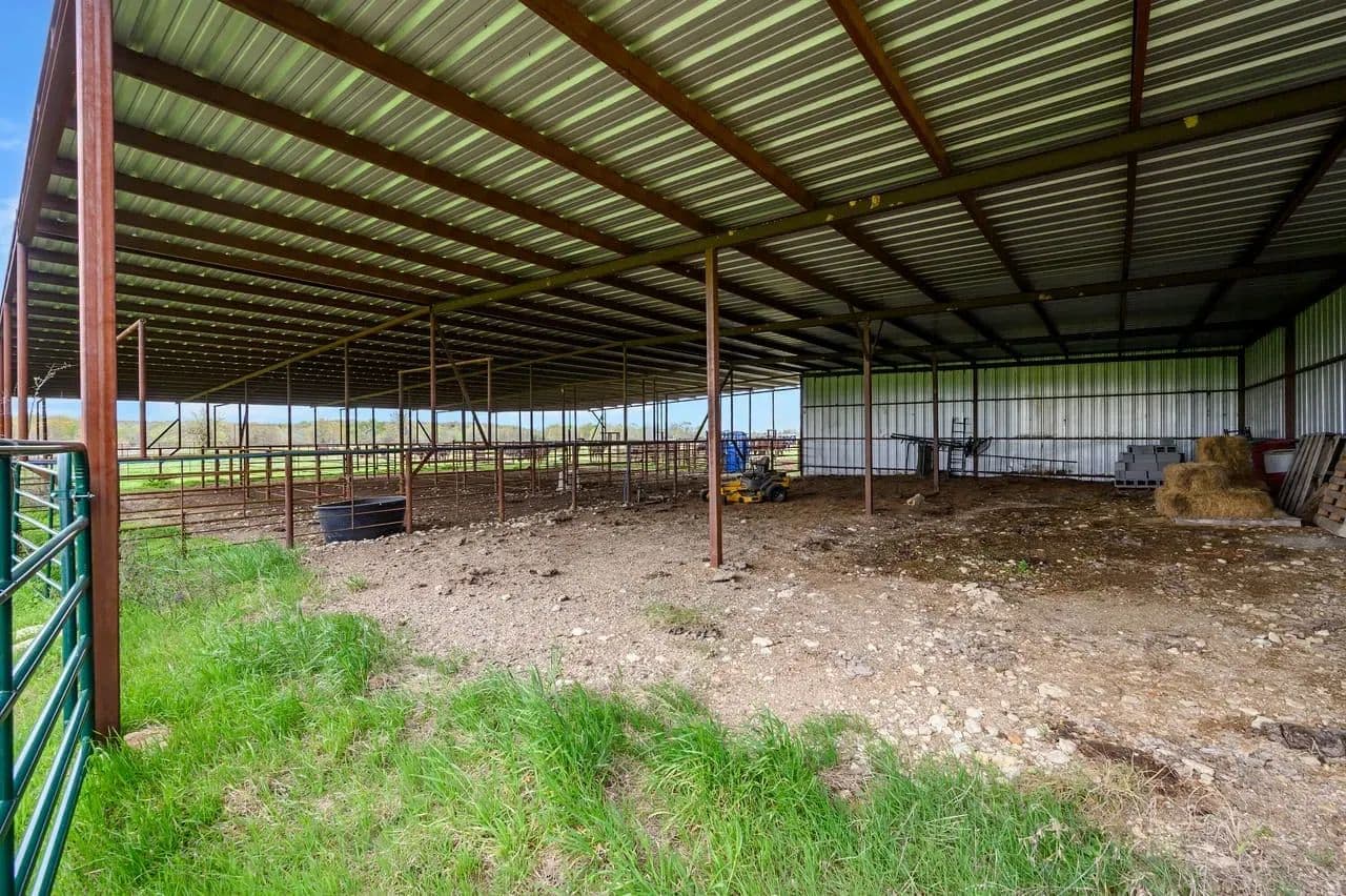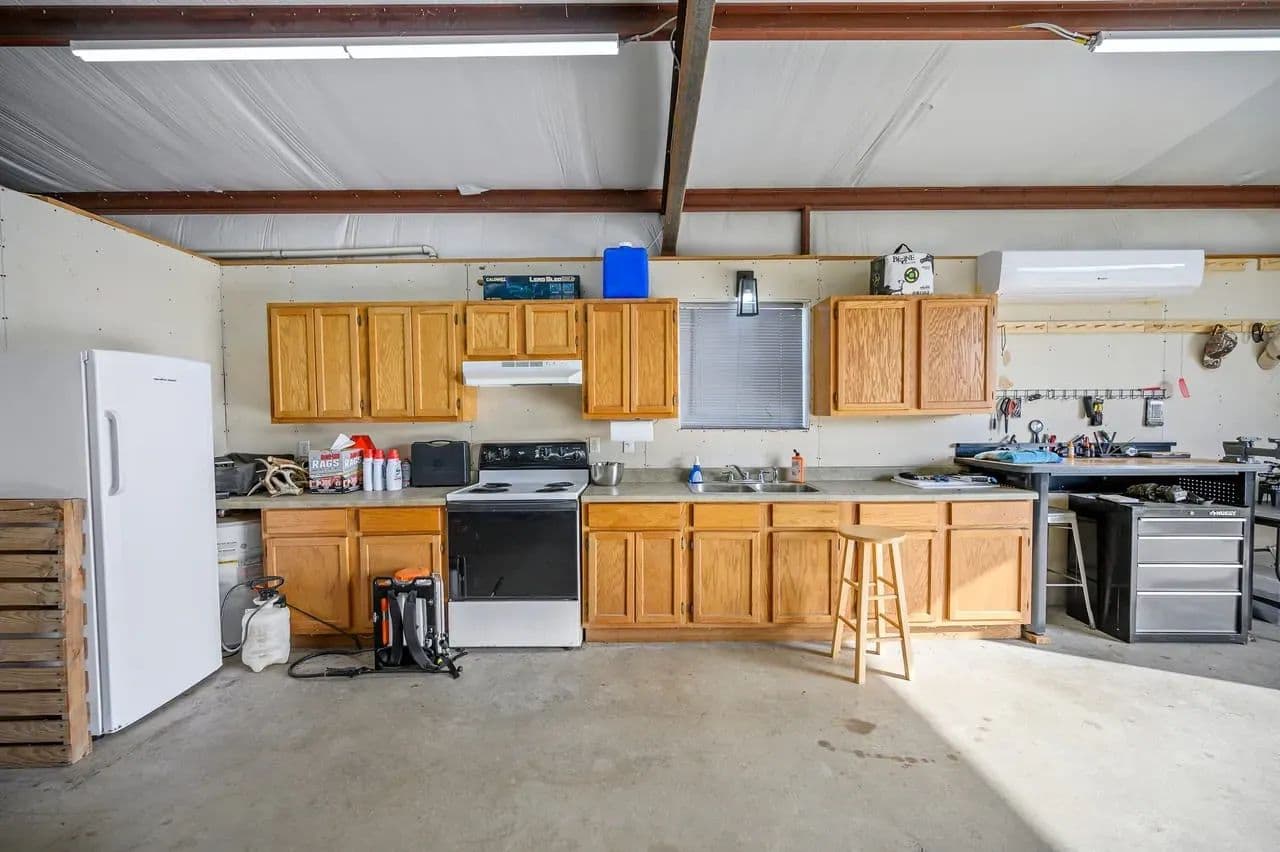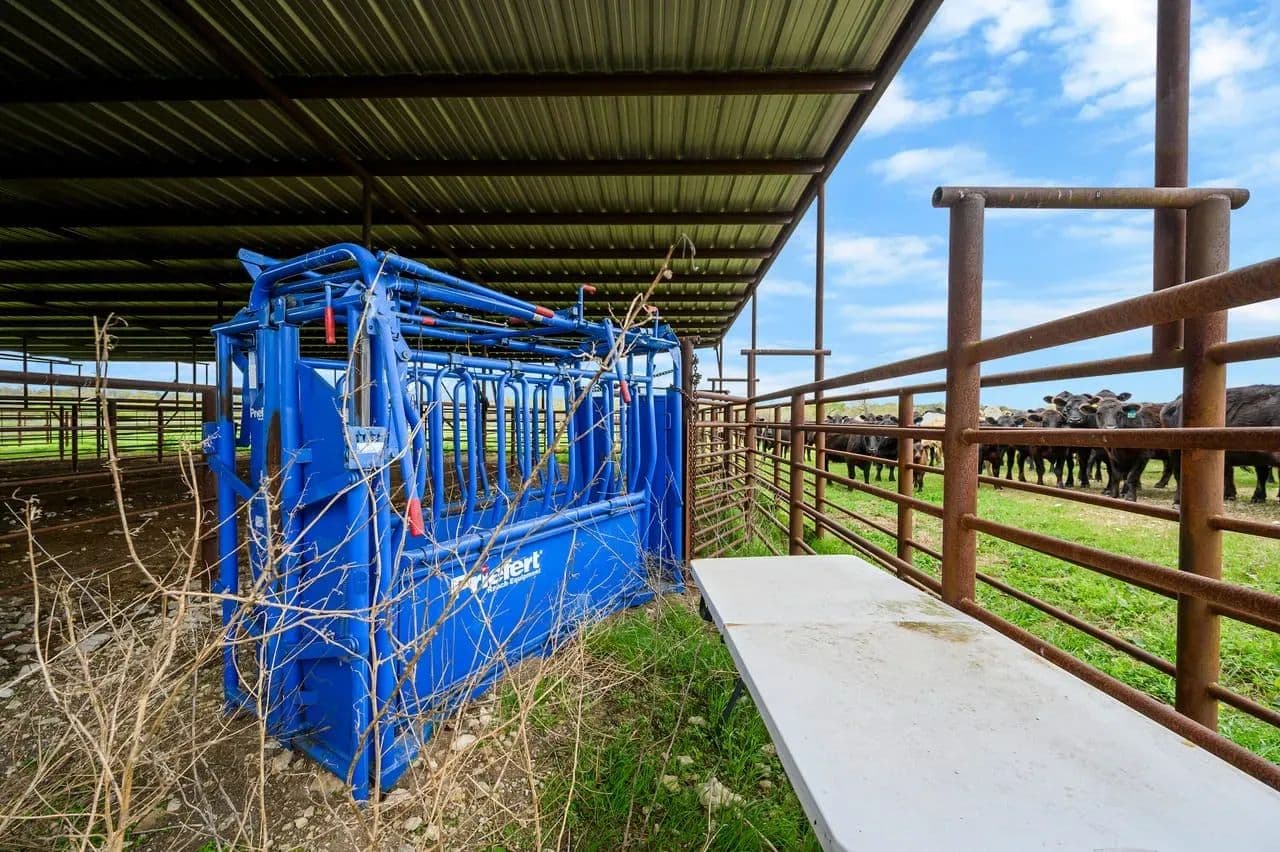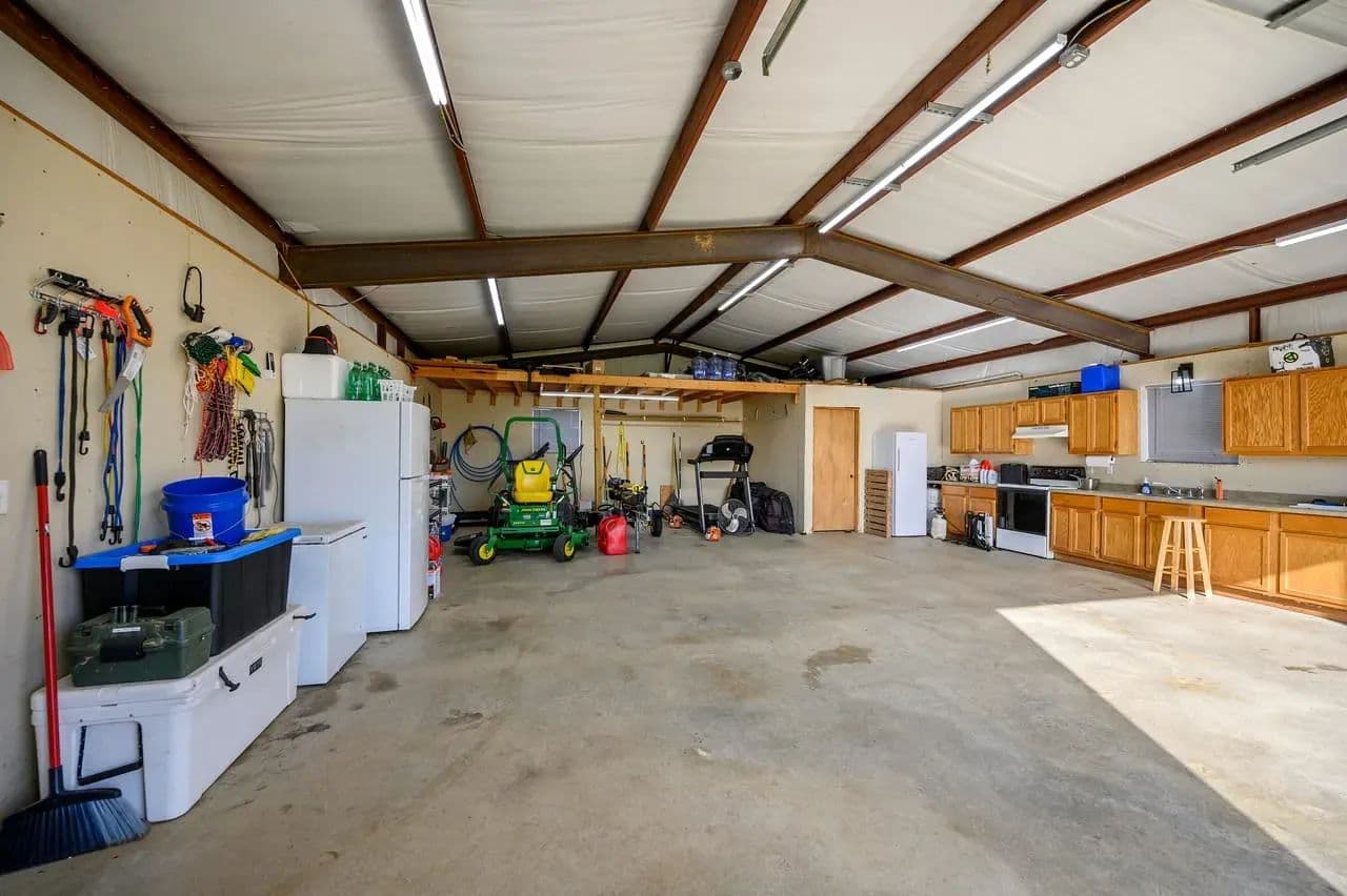 Utility Buildings: There is a large 75 x 100 steel frame utility building featuring climate-controlled heat & air, overhead LED lighting, overhead fixed windows provide additional natural light, 1-inch-thick spray blown insulation allowing a safe, reliable and cost-effective long-term storage option. This insulation seals in gaps and lowers energy consumption creating a more stable indoor efficient environment. This large metal equipment barn is ideal for storing your tractors, mowers, rakes and bailers. The utility building area including 16 ft walls and three14 ft rollup doors, built in shelving and a concrete floor is an amazing storage space and can handle all equipment storage needs. The smaller versatile 30 x 40 utility shop also includes spray insulation, climate controlled with electricity, LED lighting, heat and air system, and is currently utilized as a combination storage/workshop, but also includes a kitchen, stove, sink and bathroom which could be converted into additional living quarters. This structure fits a stereotypical barn image and could be repurposed into a barndominium. The large cattle barn includes 1 set of cattle shoots with electricity/lights, water trough and newly installed water well.