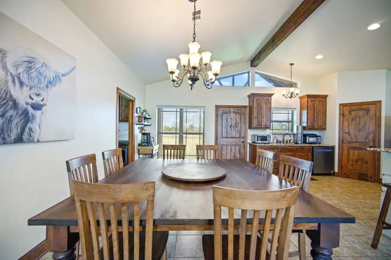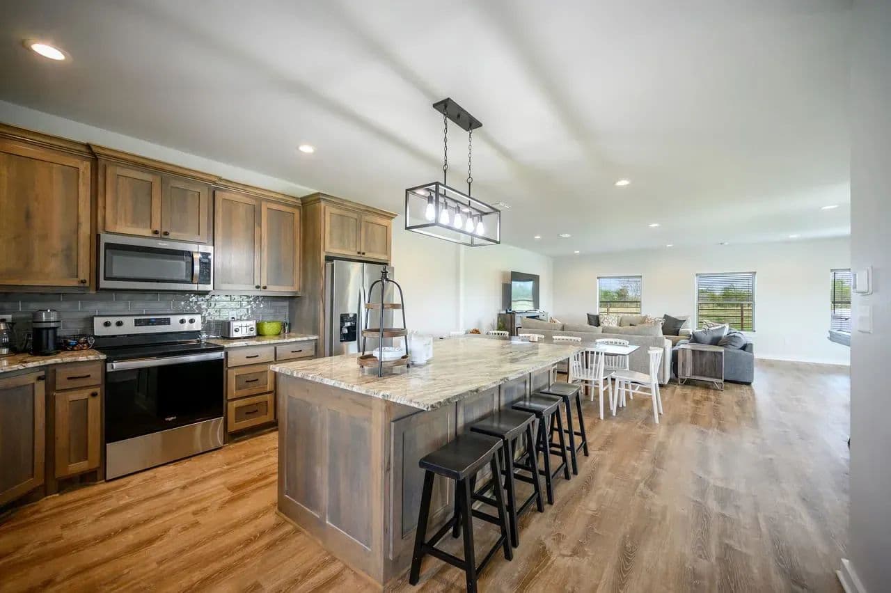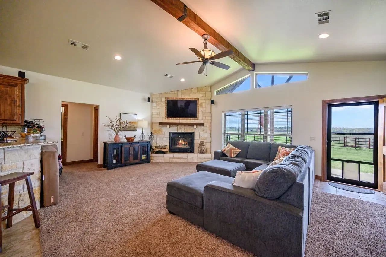 This open concept living and dining area blends into the heart of the home fully showcasing the functionally designed kitchen. Enjoy a spacious oversized Austin Rock Island with custom crafted sleek granite U-shaped countertops, custom cabinetry, and top-of-the-line stainless-steel appliances. The open-concept kitchen which flows seamlessly into the dining and living room, where large picture windows and gable addition flood the space with natural light and frame breathtaking countryside views. Highlights include the wood beam rafter look, the elegant fireplace, custom designed doors, and engineered tile flooring.