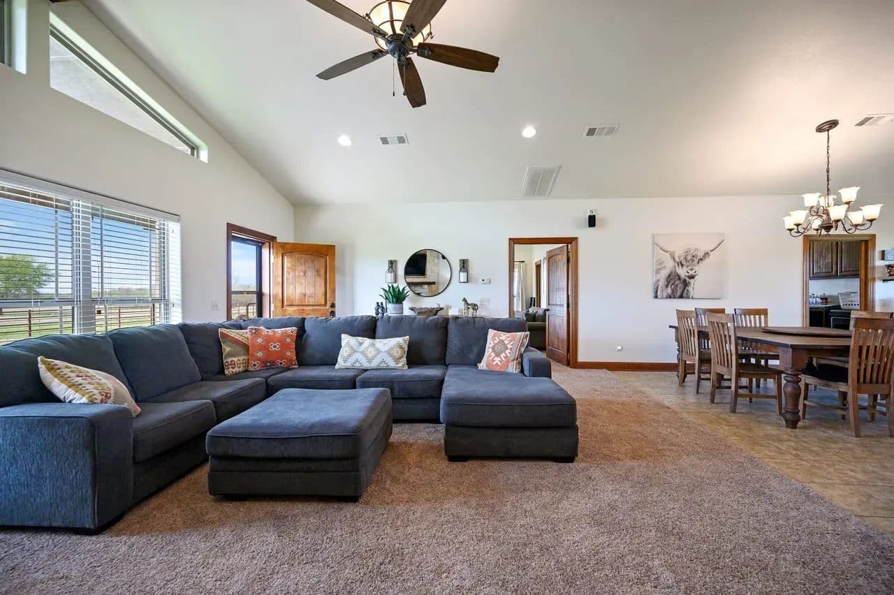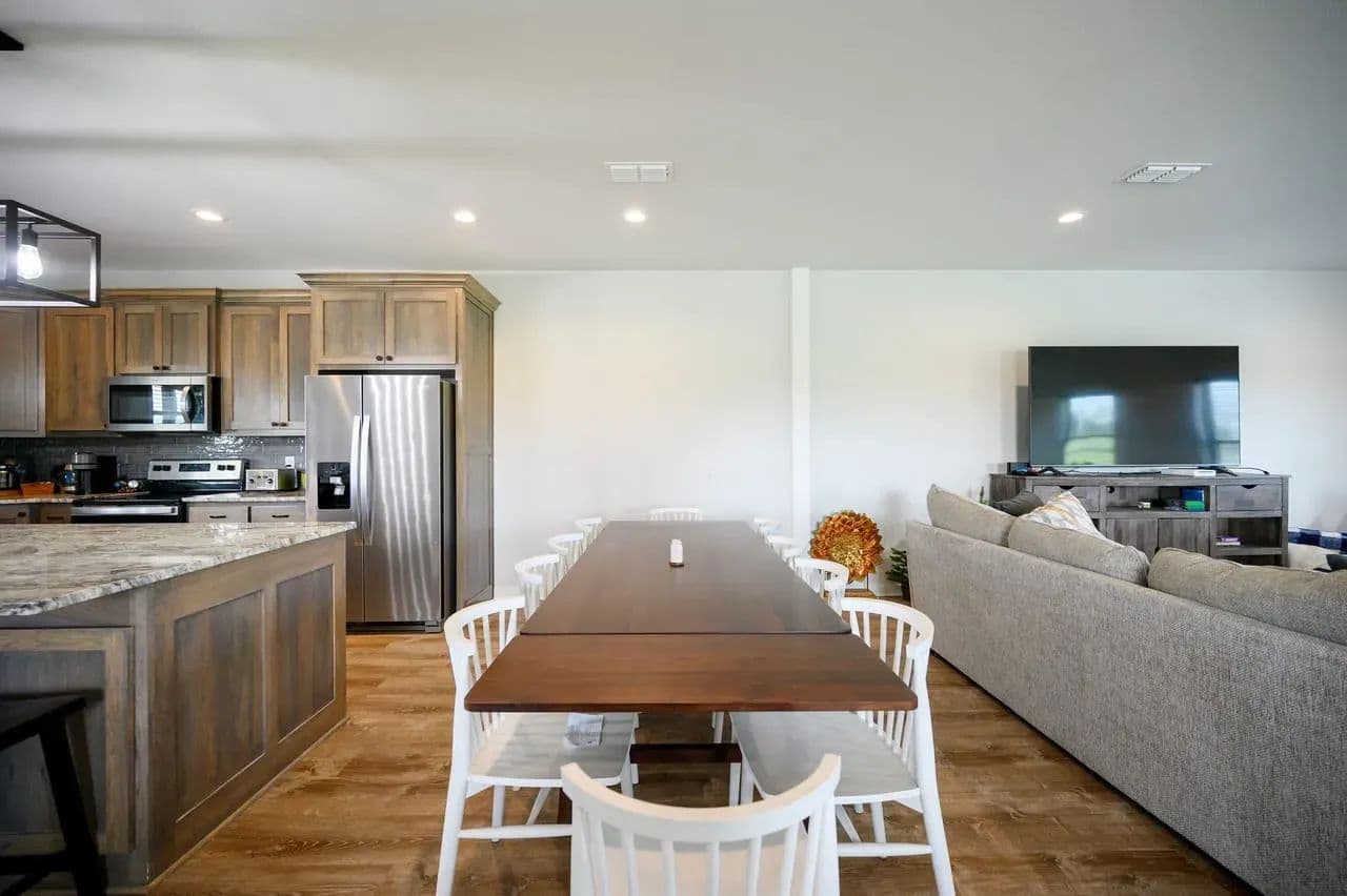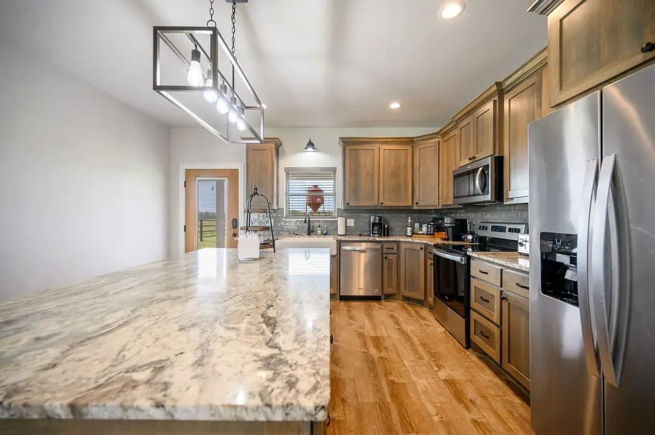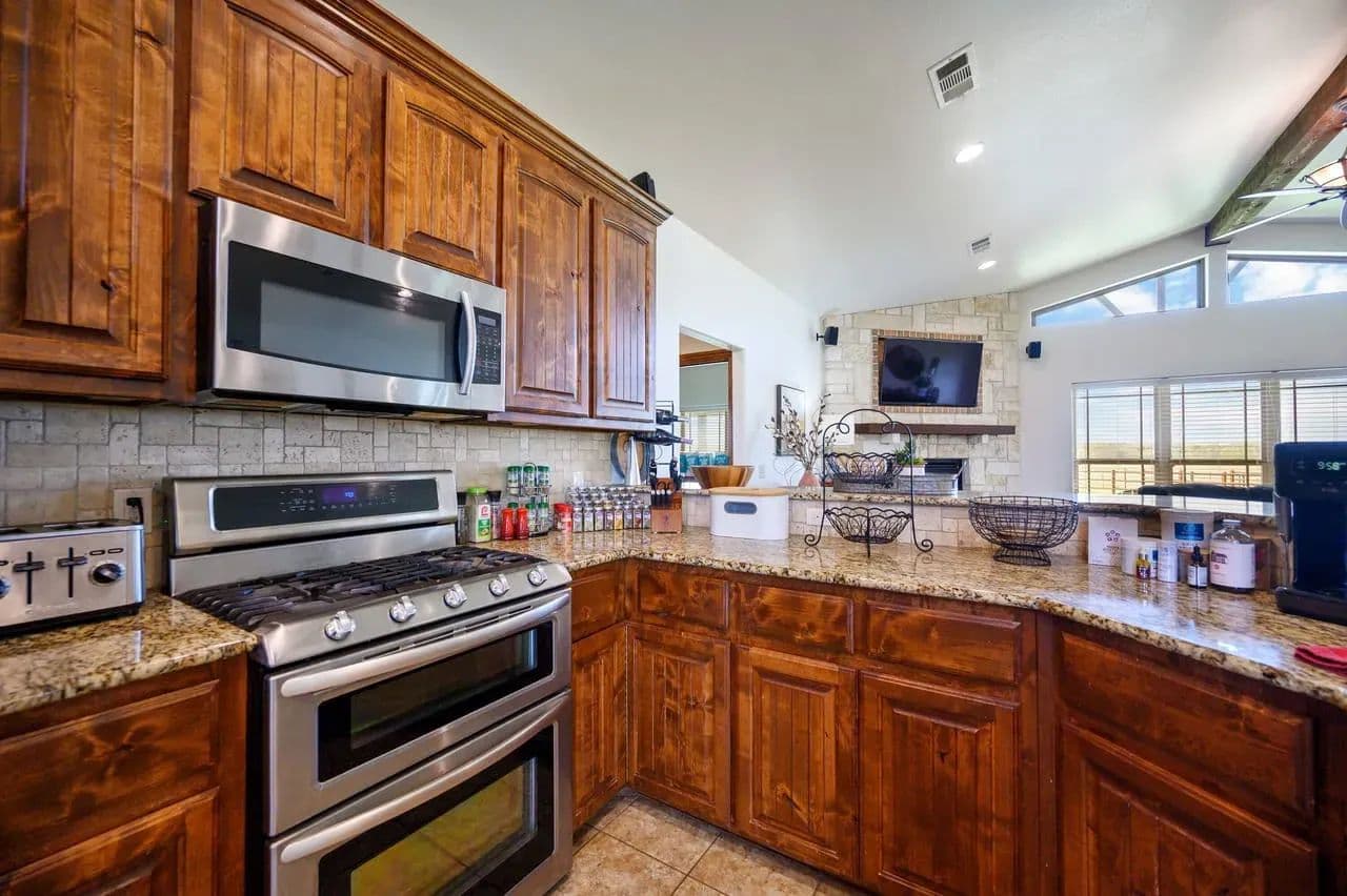 This open concept living and dining area blends into the heart of the home fully showcasing the functionally designed kitchen. Enjoy a spacious oversized Austin Rock Island with custom crafted sleek granite U-shaped countertops, custom cabinetry, and top-of-the-line stainless-steel appliances. The open-concept kitchen which flows seamlessly into the dining and living room, where large picture windows and gable addition flood the space with natural light and frame breathtaking countryside views. Highlights include the wood beam rafter look, the elegant fireplace, custom designed doors, and engineered tile flooring.