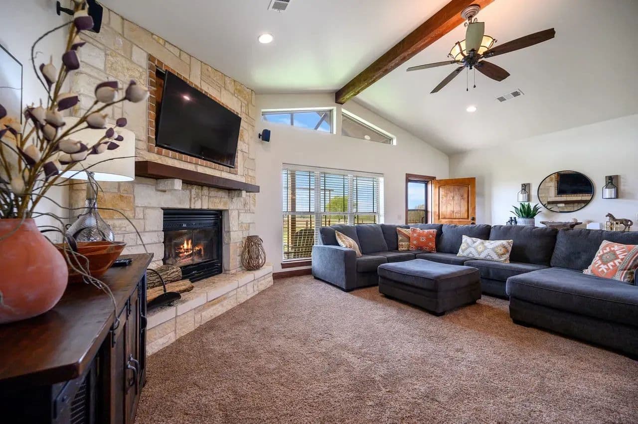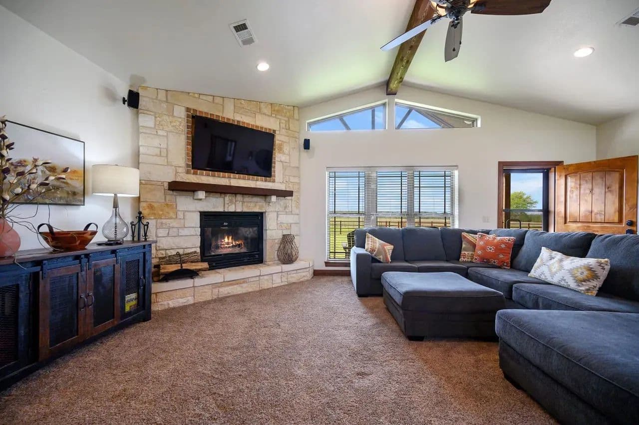 This centerpiece custom gable roof ranch home offers 1944 sq. ft. of thoughtfully custom designed living space, hosting is effortless with this wonderful open-concept elegant ranch home built in 2013, featuring 3 bedrooms and 2 baths. Your eyes are immediately drawn to the Austin Rock wood burning fireplace, accenting the massive space with actual natural timber log and large glowing ember bed. The huge ceramic glass front allows heat to easily transfer into your living space, providing a clear view of the fire from each part of the space.