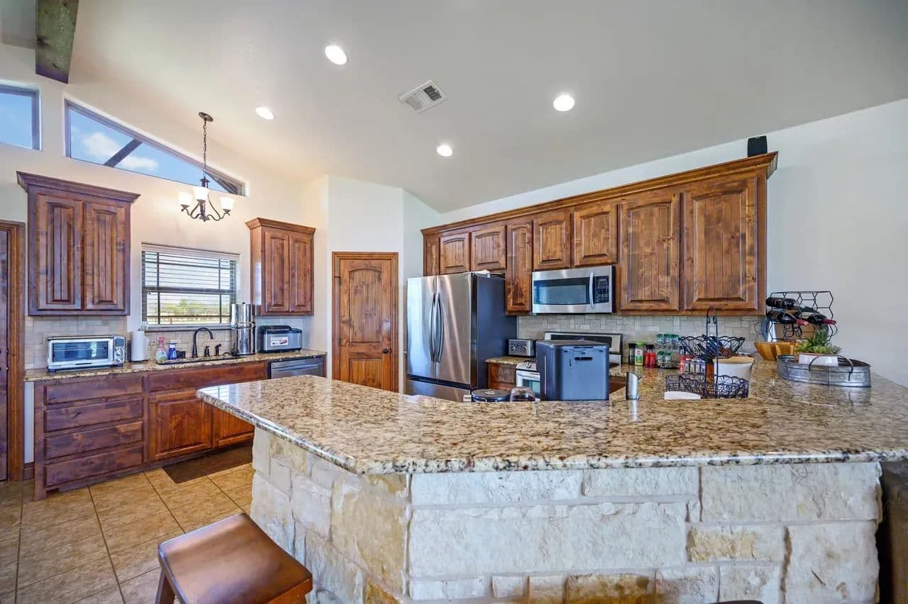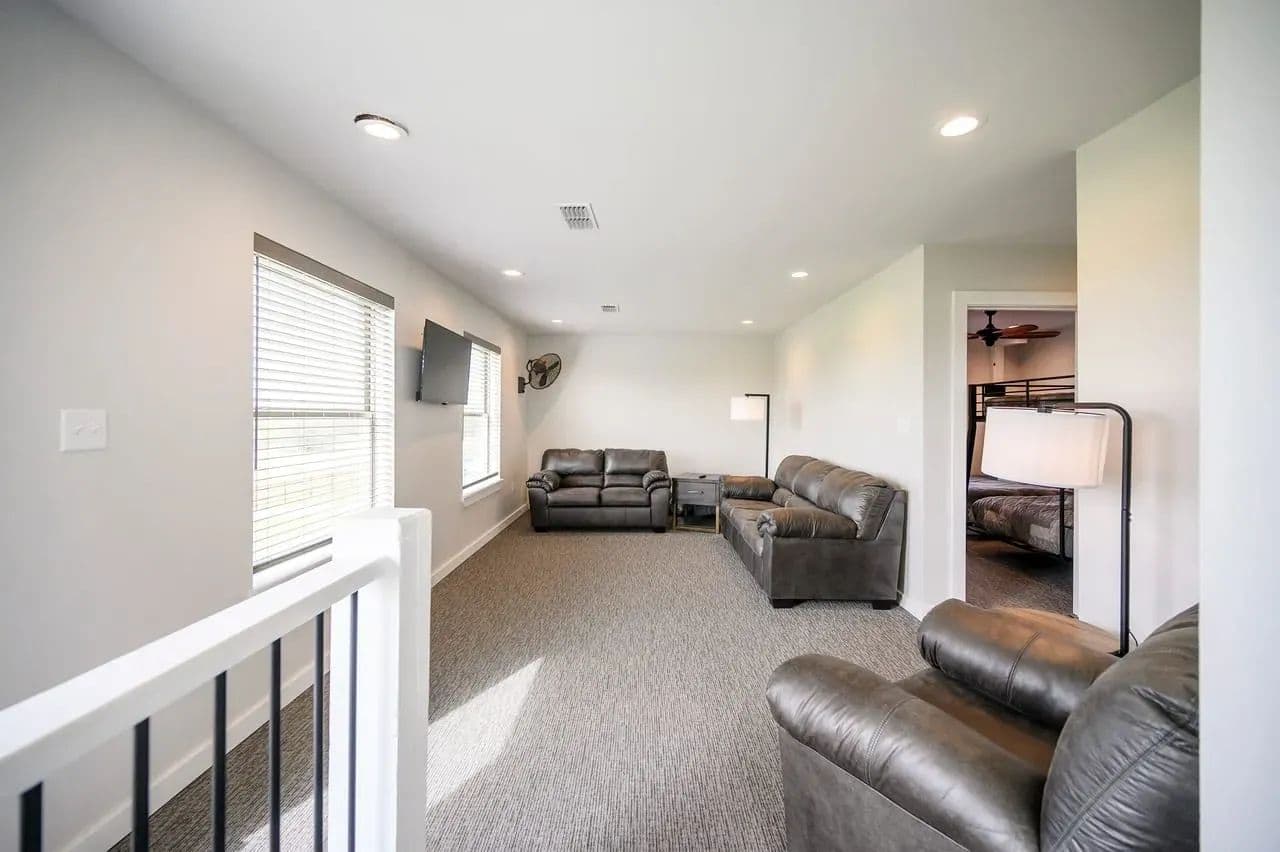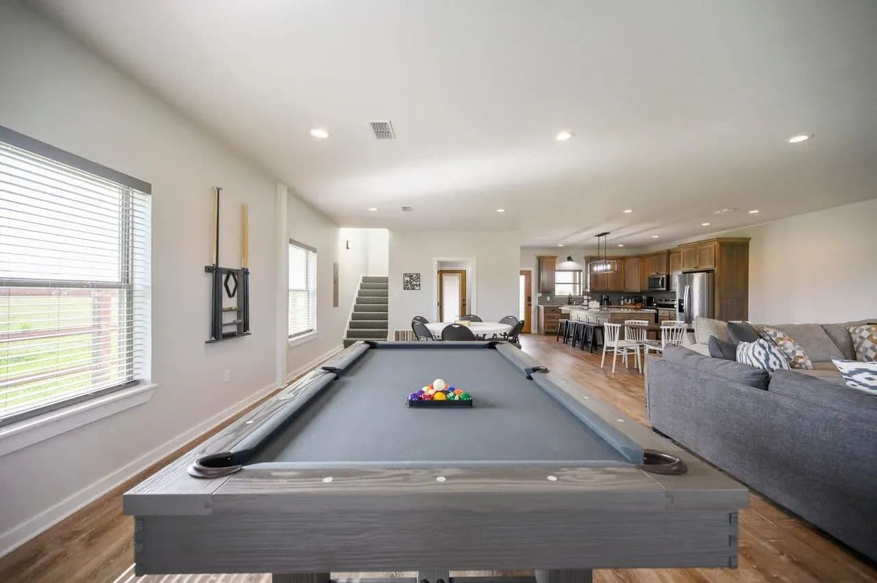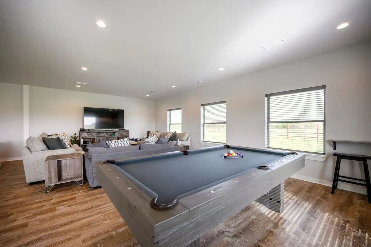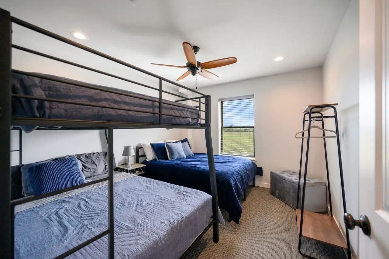 For additional entertainment you will find an amazingly modern 2-story bunk home with 1200 sq. ft on the lower floor boasting a full-service quality kitchen and 1200 sq. ft on the second level, comfortably sleeps 14 and can be expanded to 25. Full-sized quality pool table allows for plenty of entertainment and family fun. This cleverly designed custom bunkhouse with spacious bunkbeds and two primary master bedrooms allows for ideal distribution of space and family management and can serve as a private family retreat. Designed with a blend of modern design and exceptional quality. Every piece was selected to display that it was built with quality to last and a commitment to excellence and craftmanship using only premium high quality sourced materials.