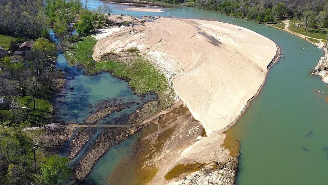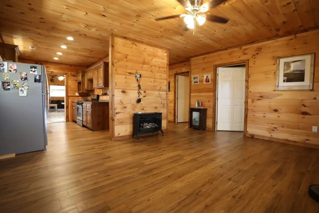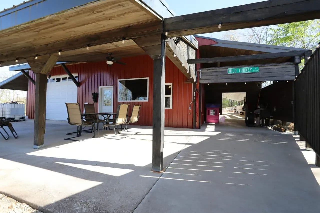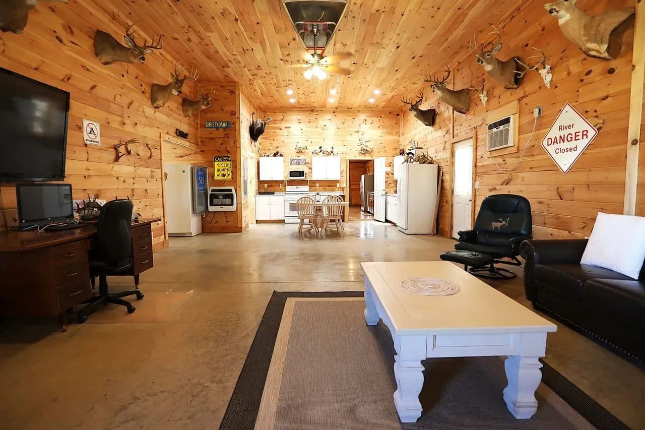 Custom Barndominium w/ private Current River access for sale in Van Buren, Missouri - This unique and versatile build is spacious, efficient and low maintenance, offering a variety of living arrangements for the full time resident or the weekend escape. Located in River Running subdivision, you enjoy private, gated access to one of the top 3 gravel bars along the middle Current, in addition to paid Deer Run privileges. There are essentially 2 homes under one roof: The rear portion of the home offers a full kitchen, living room, formal dining room and an office that could be utilized as another bedroom. The primary bedroom features a generous combo bath / closet complete with WD hookups and ample storage. The river side of the home is set up for river weekends and entertaining, with an additional full kitchen, large living area and 2 more guest suites with full baths and built in bunks easily accommodating 10+ guests. Approx. 2500ft of covered parking for your toys.