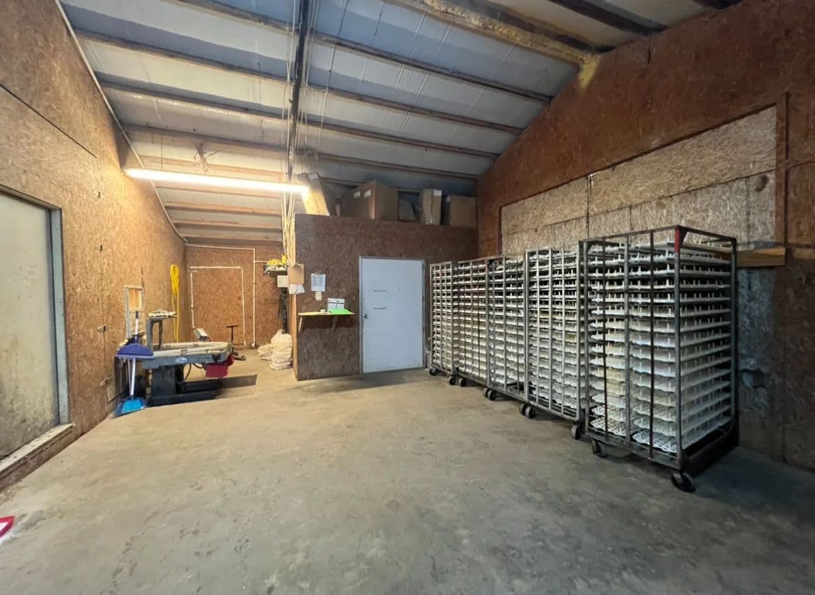 * A large temperature-controlled egg room with cooling units supports daily operations.