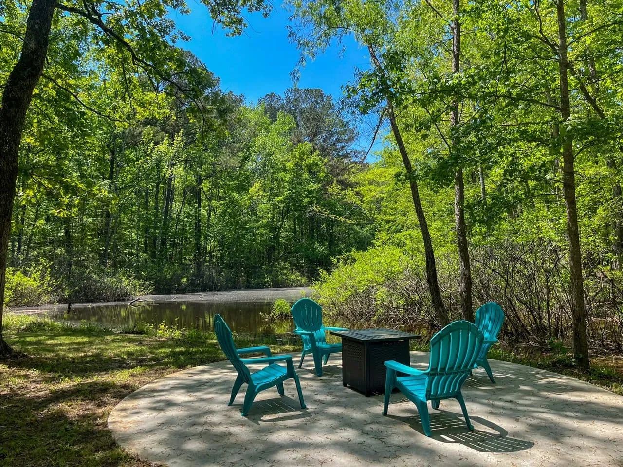 Poured concrete pad near the pond, ready for a cozy outdoor fireplace setup