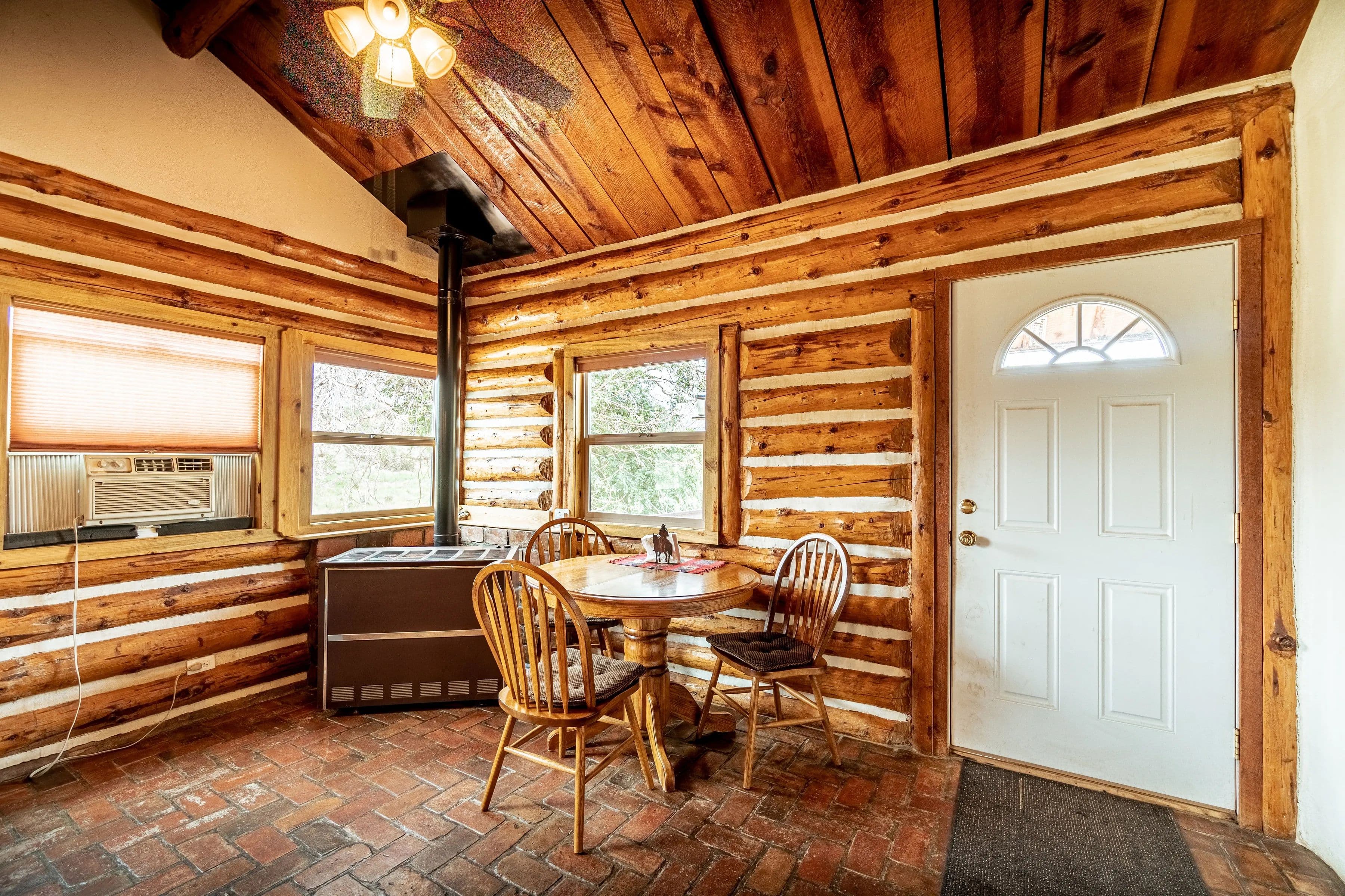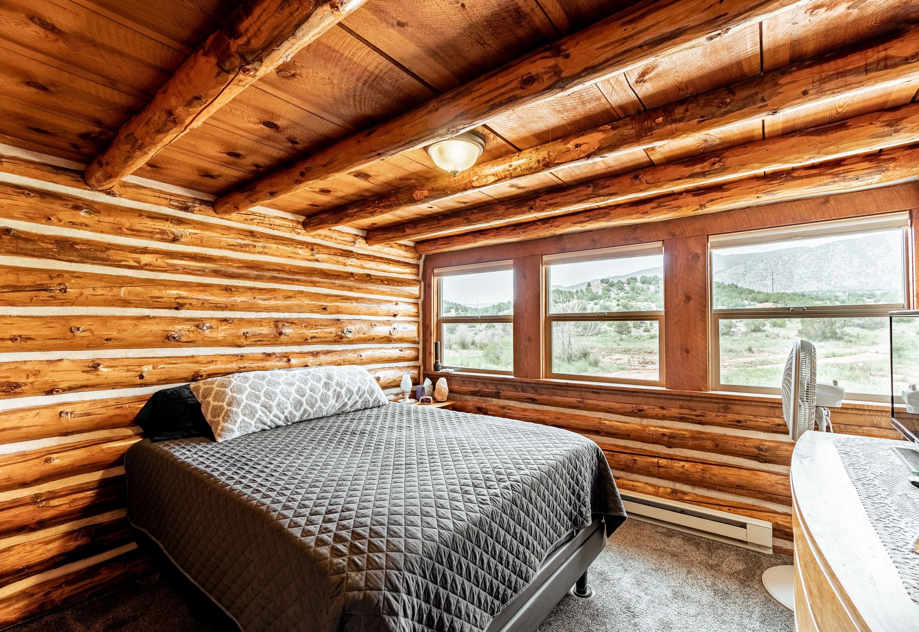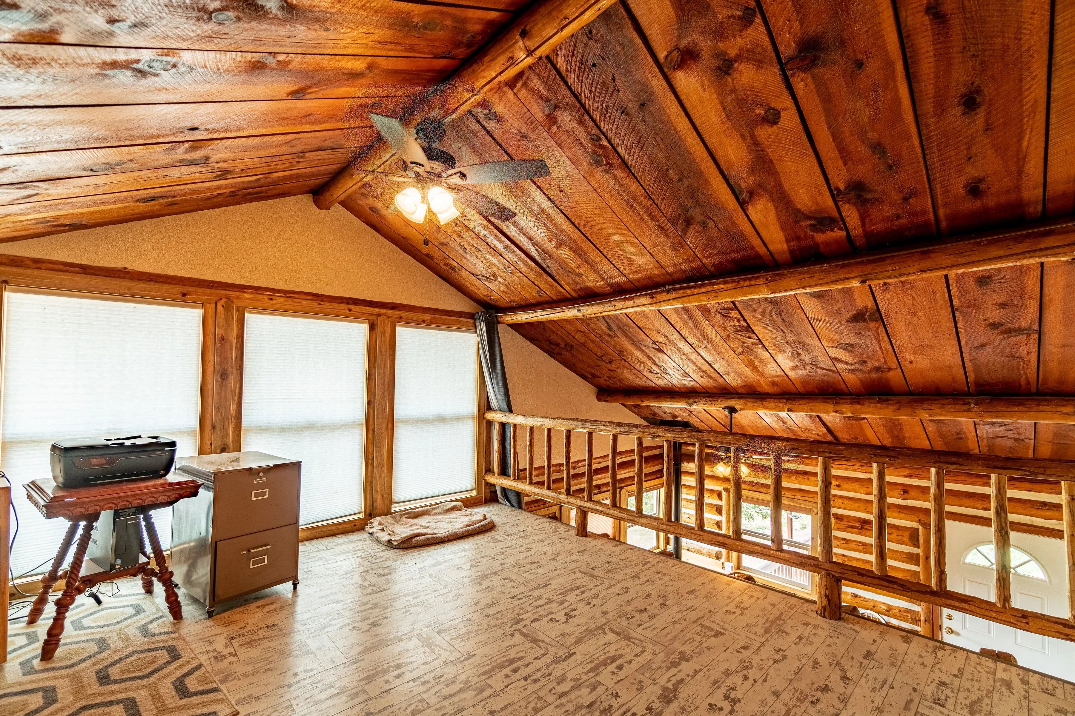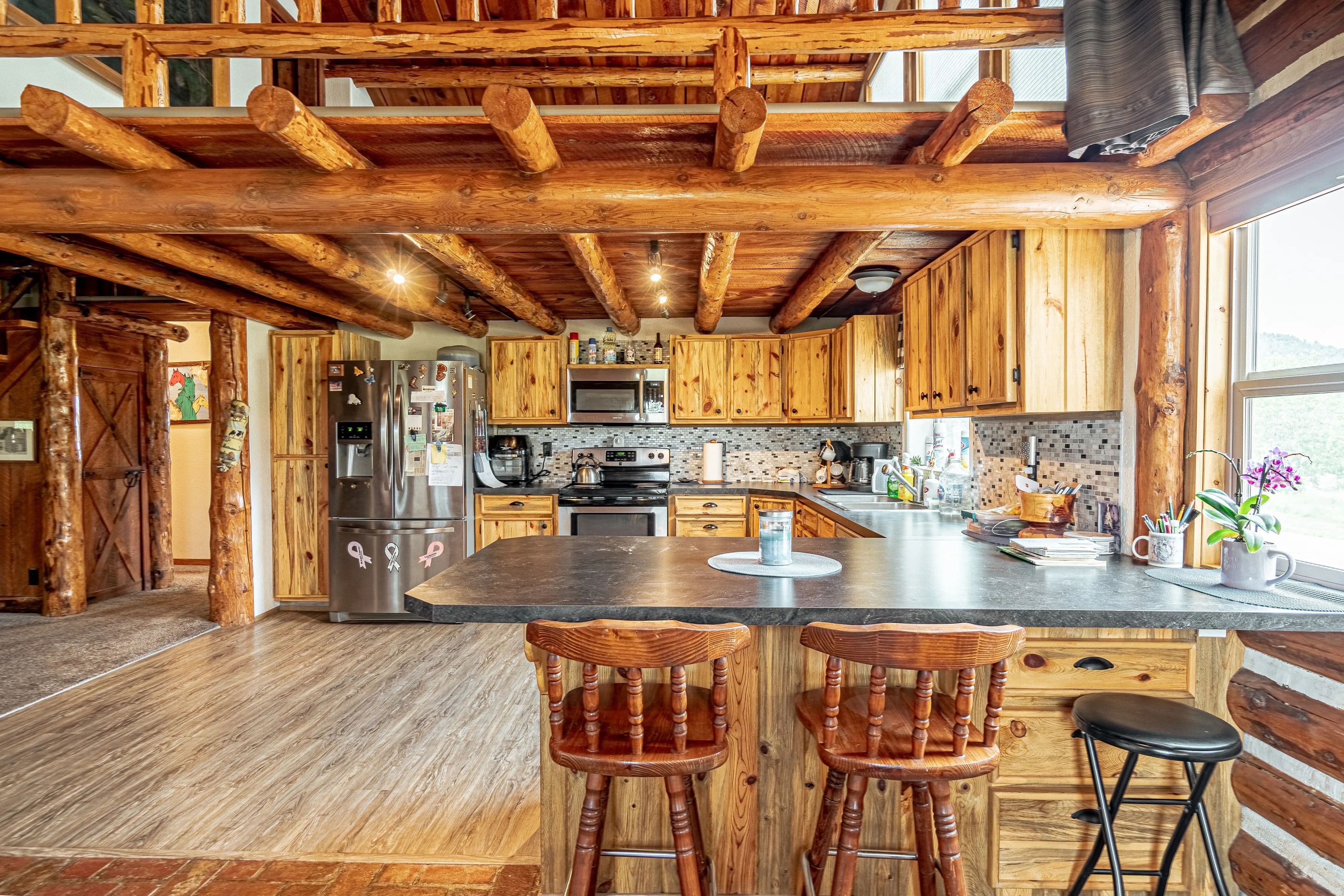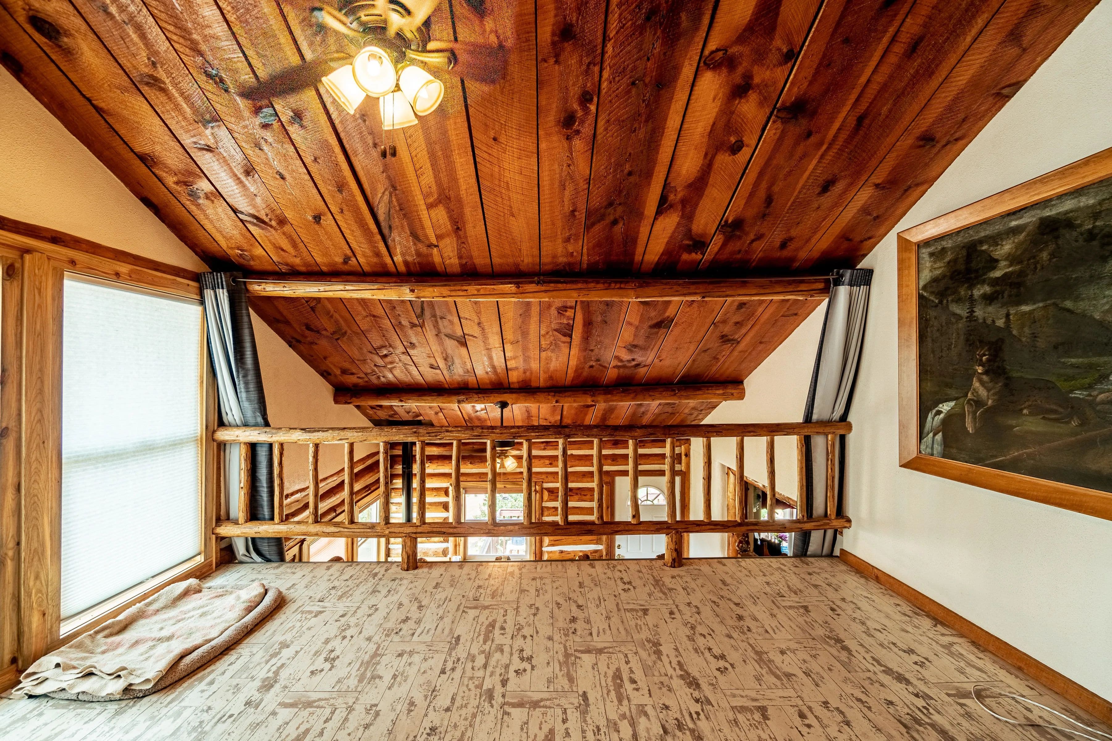 Bedroom #1 is an attractive western style room with exposed wood beam ceilings and custom barn wood closet doors. Bedroom #2 also has exposed log beam ceilings and has a large walk-in closet with additional storage area. As you walk up the log staircase you will enter a large open loft or office area with vaulted tongue and groove ceilings, exposed log beams and a log railing overlooking the main level. The home also has 2 great wooden decks for outdoor entertaining.