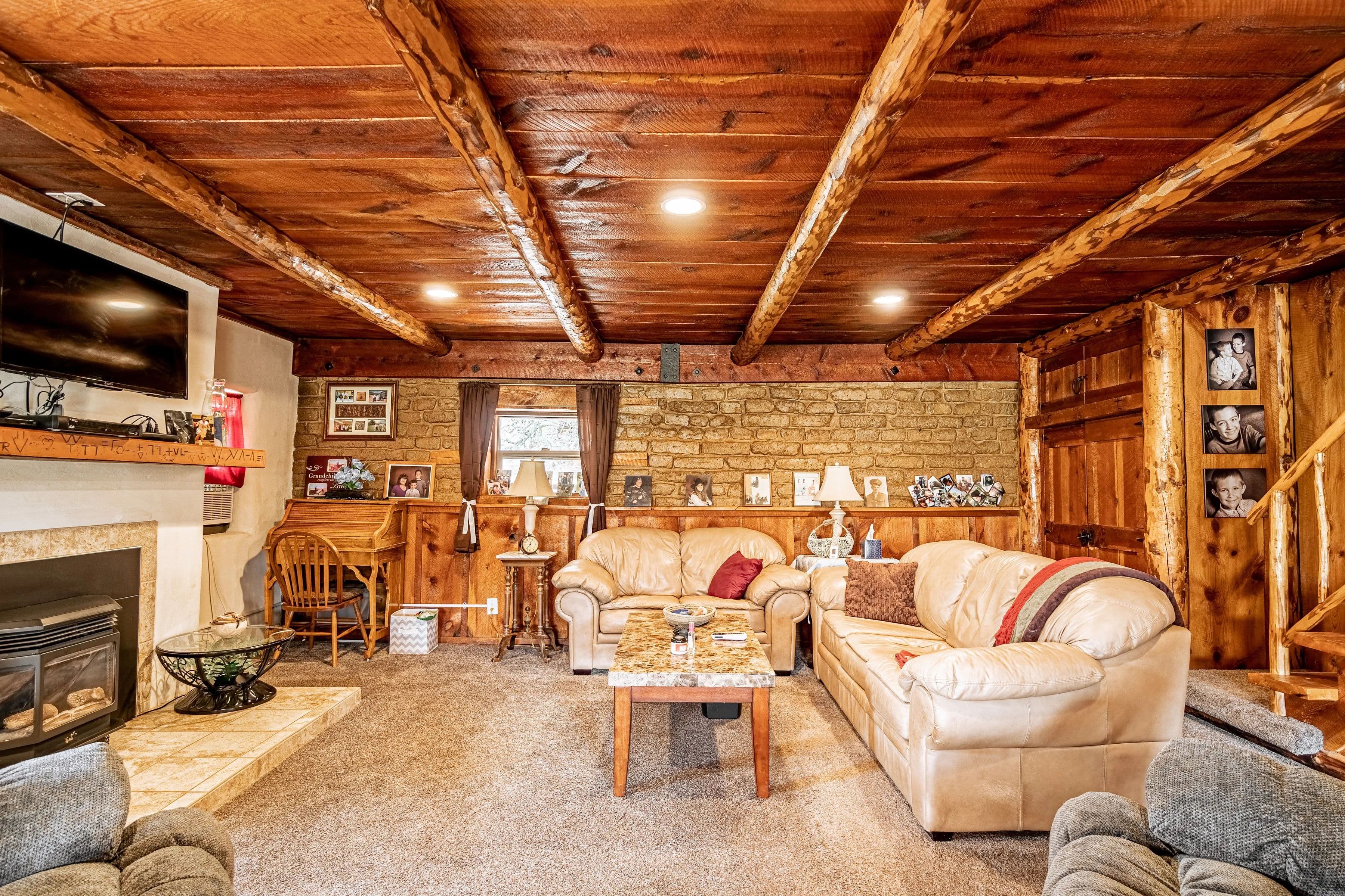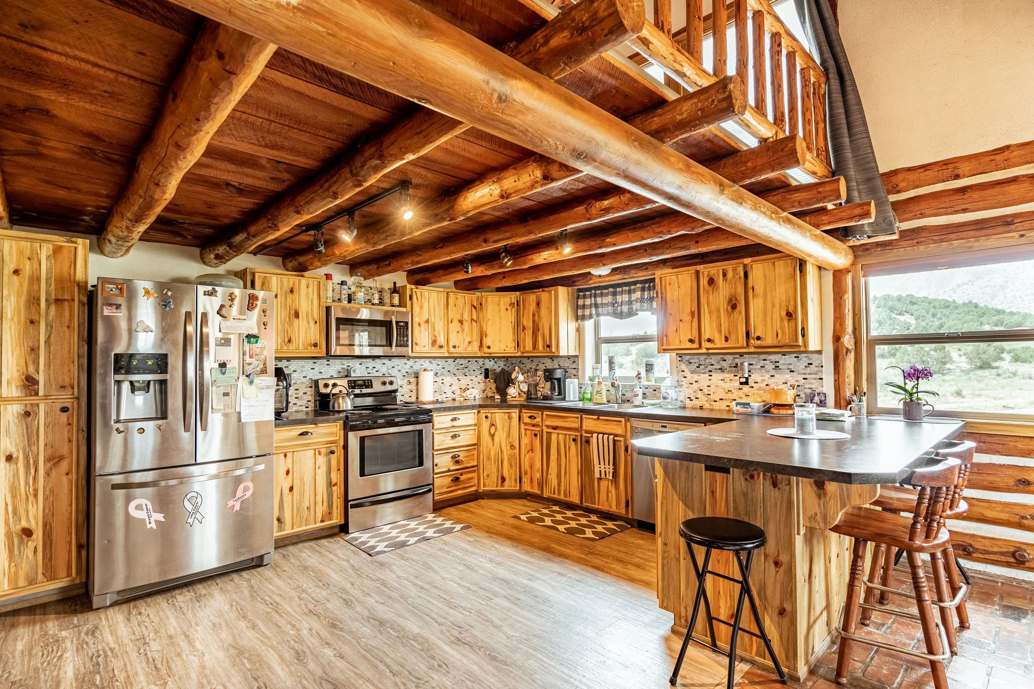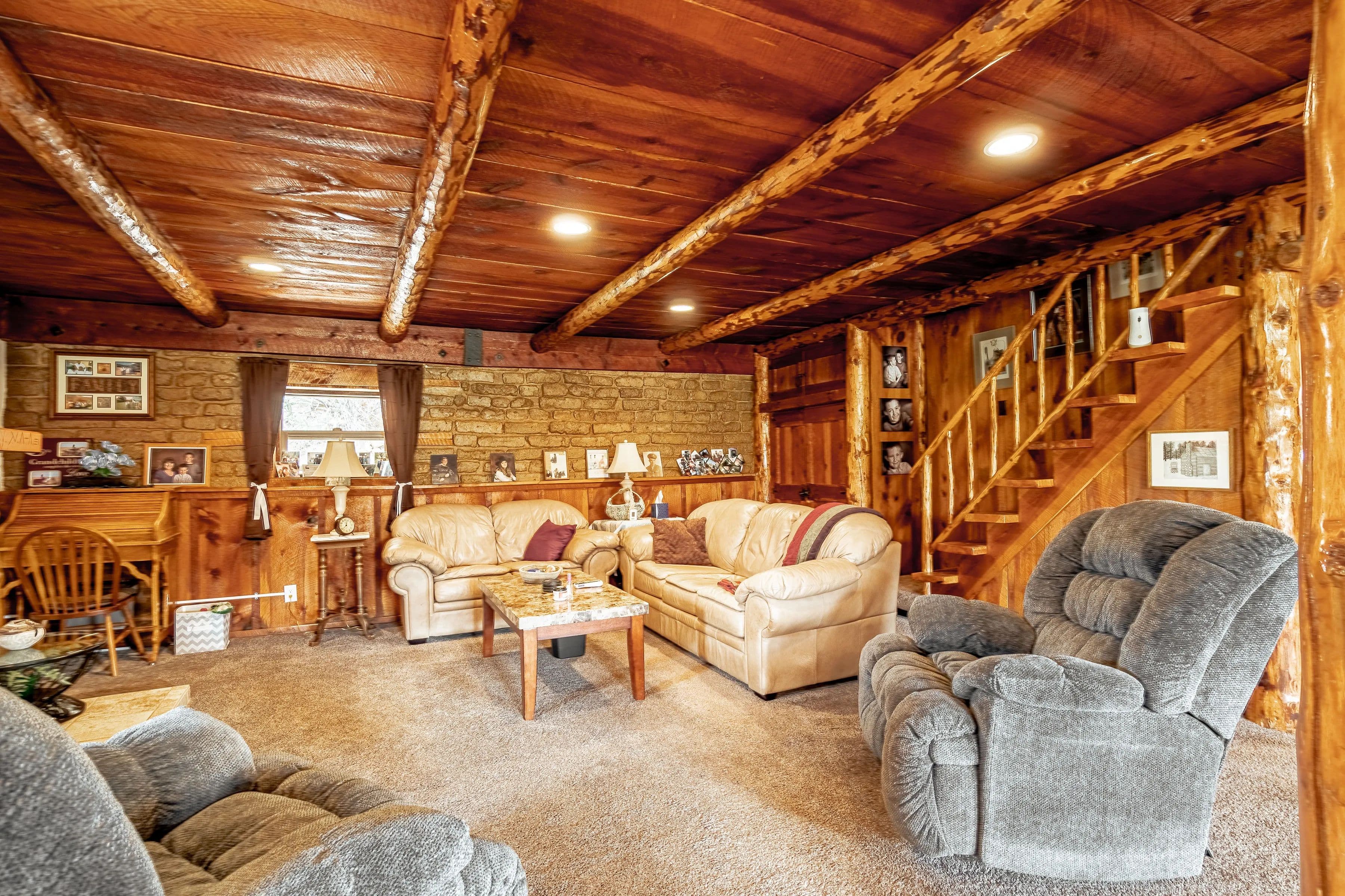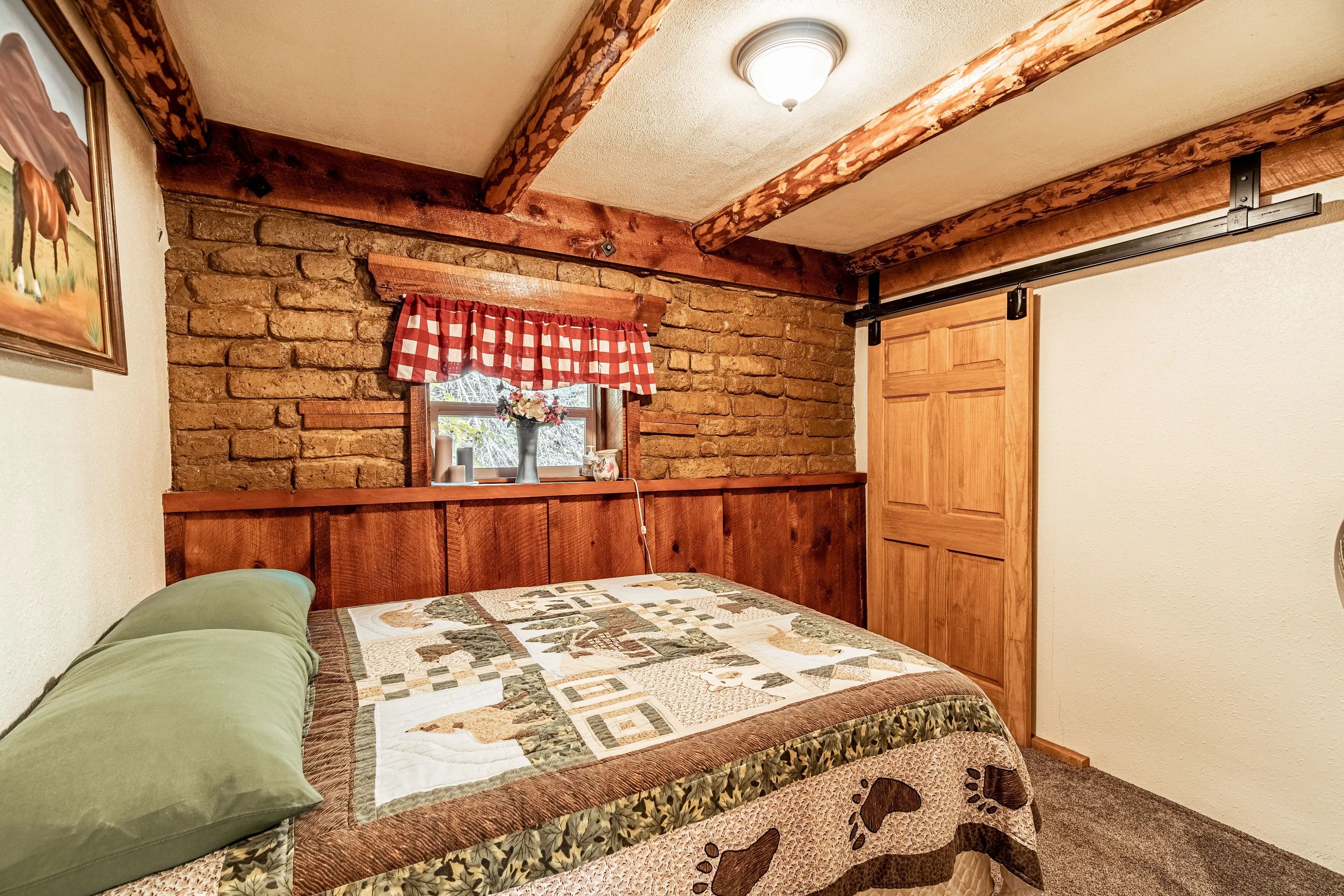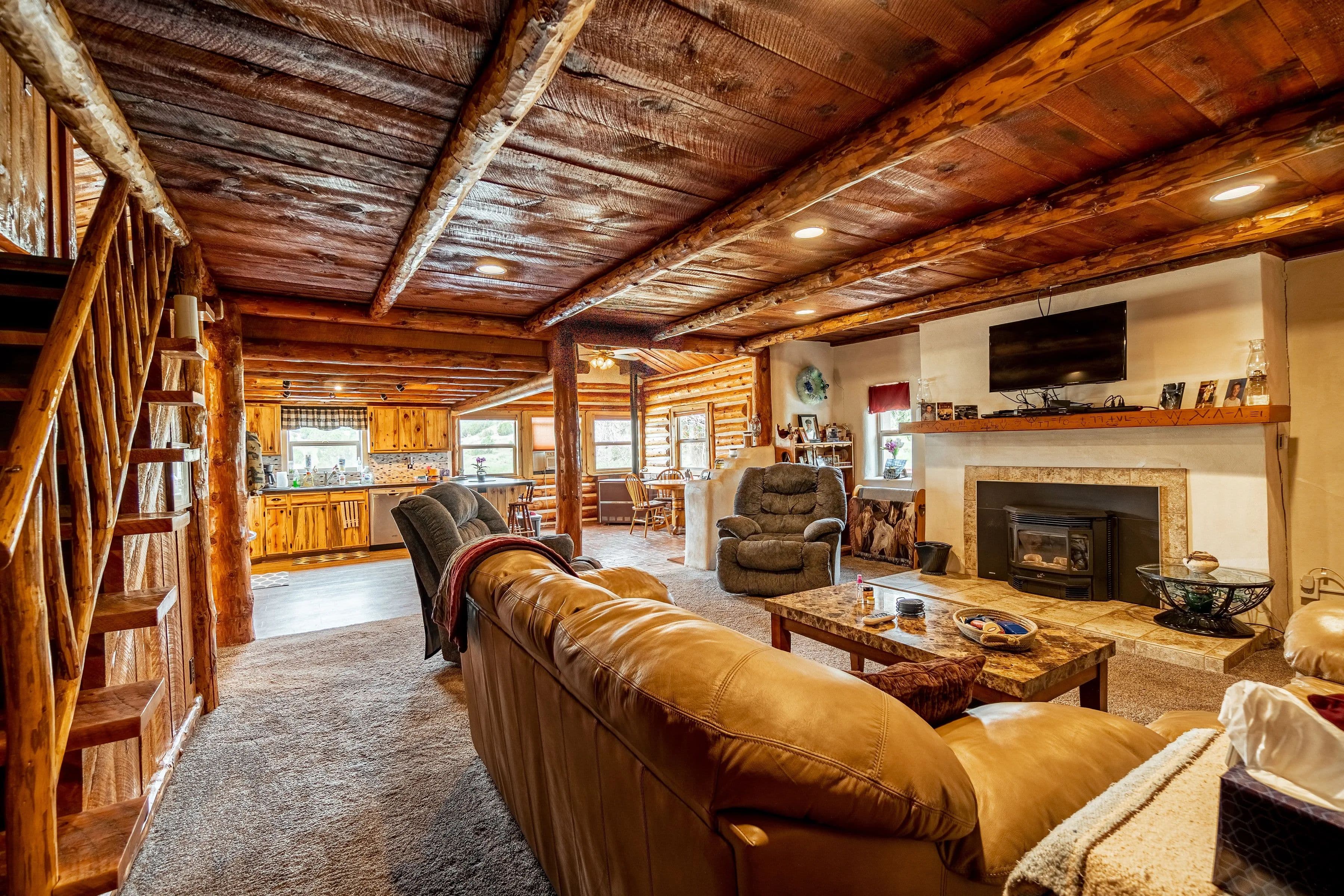 Bedroom #1 is an attractive western style room with exposed wood beam ceilings and custom barn wood closet doors. Bedroom #2 also has exposed log beam ceilings and has a large walk-in closet with additional storage area. As you walk up the log staircase you will enter a large open loft or office area with vaulted tongue and groove ceilings, exposed log beams and a log railing overlooking the main level. The home also has 2 great wooden decks for outdoor entertaining.