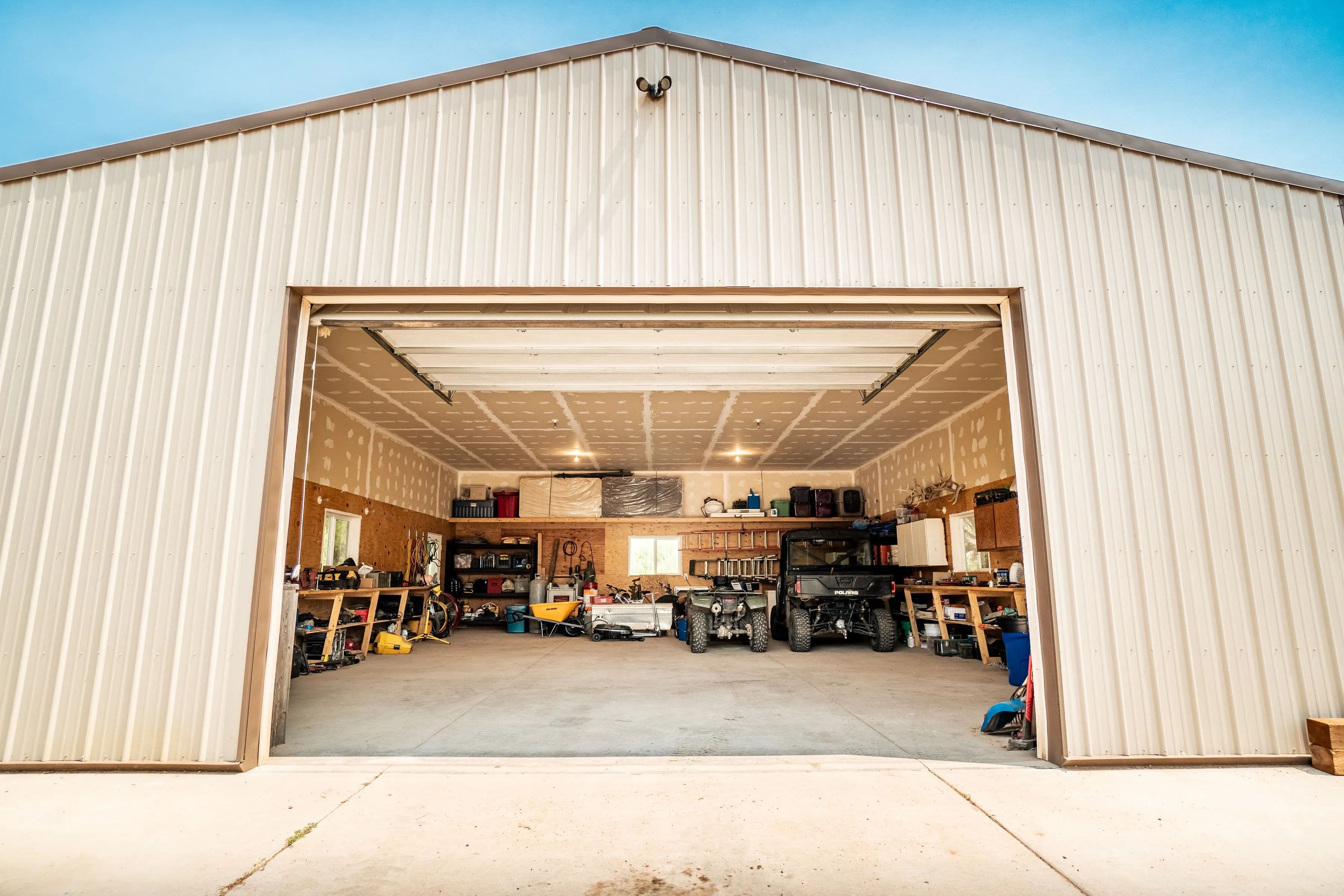 The Workshop/RV Garage is a 32' x 40' fully insulated steel building with 220 power. It features 12' ceilings, built in work benches, cement flooring, and covered 14' awnings on each side.