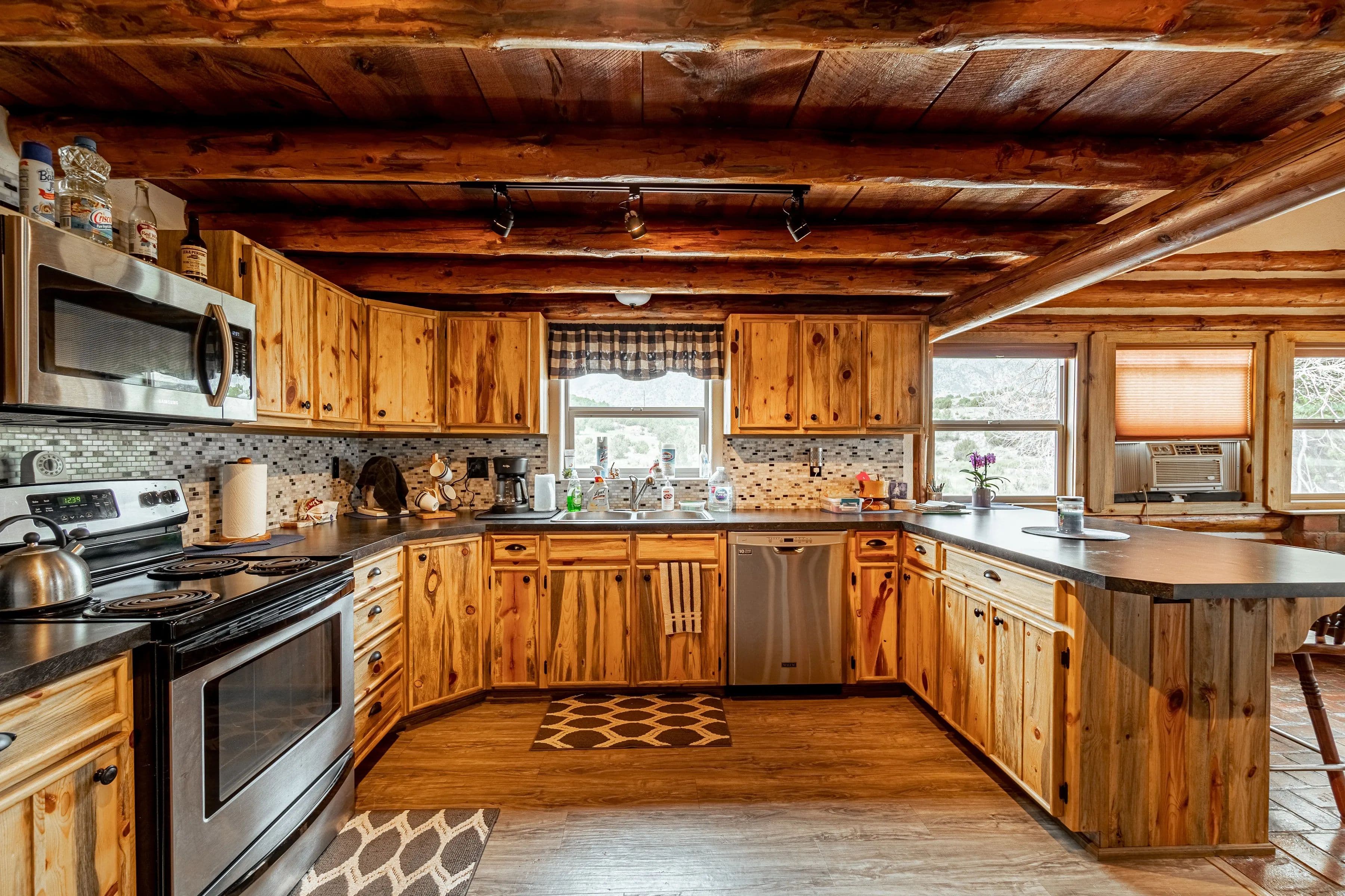 This 1935 log home is a 1589 square foot authentic Colorado log cabin with 2BR and 1 bath and tucked along the scenic canyon hillside. The views of the surrounding mountains and rock formations from this log home are truly awe inspiring. When you enter this cabin, you will be drawn to the wide plank ceilings accented by log beams. This country style cabin has a very open living concept featuring an eat in kitchen with attractive beetle kill pine cabinets accented by a tile backsplash. The appliances are stainless steel, and the flooring is laminate wood. The walk out dining area features custom brick flooring, chinked log walls and a wood burning fireplace. The spacious living room has a pellet stove fireplace with tile hearth and a custom wood mantel. The living room also has some of the original exposed stone walls providing some great character.
