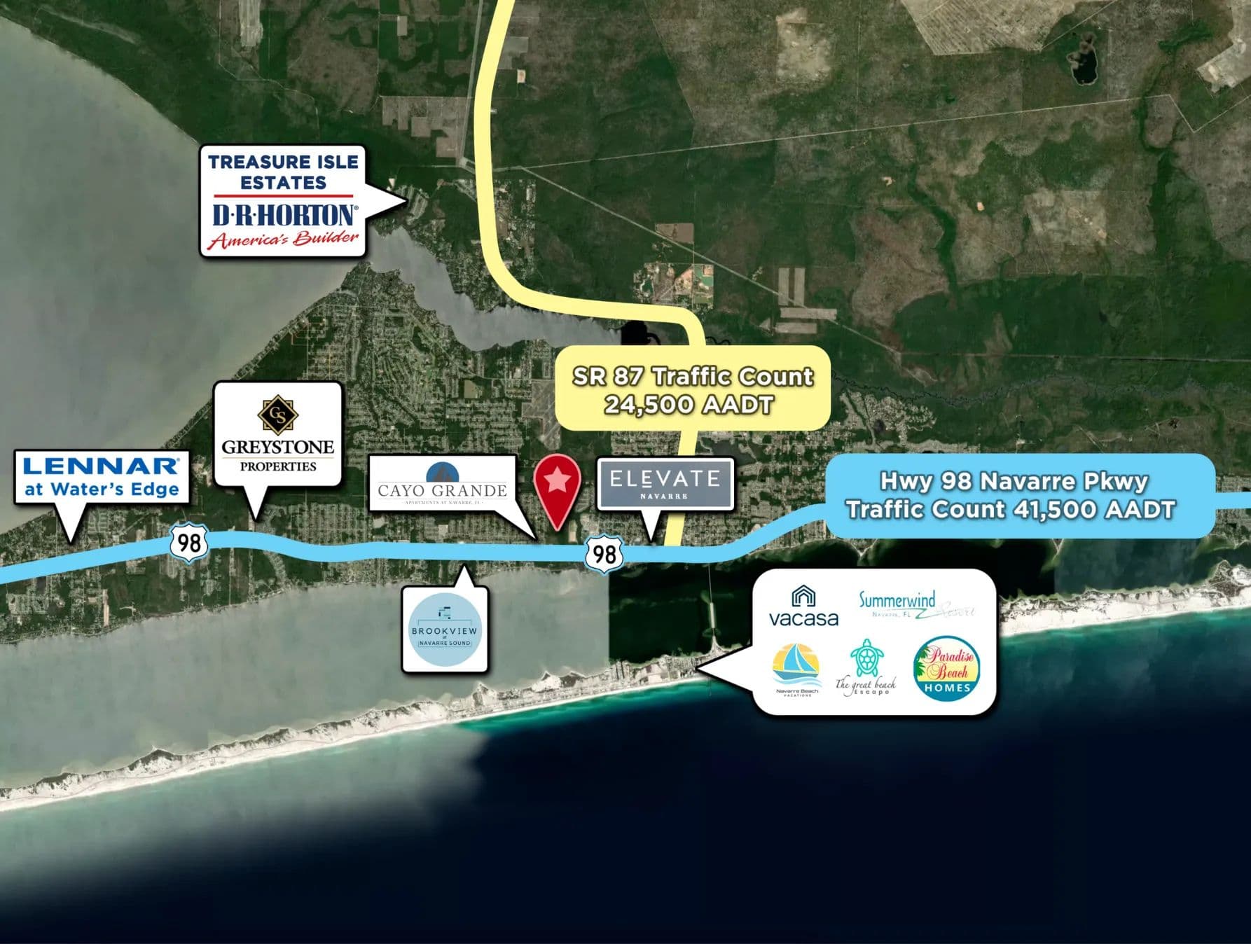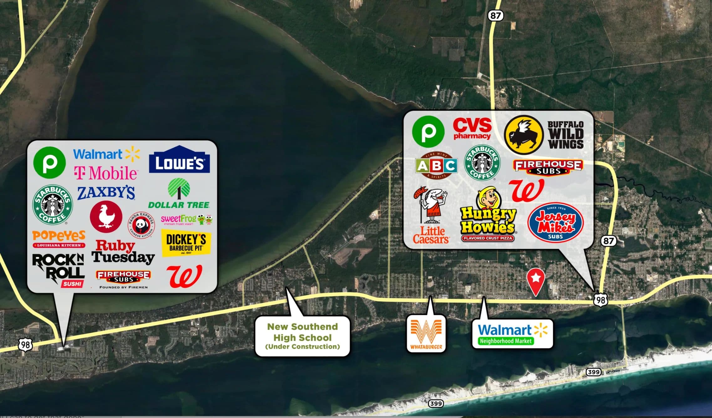 This 34.39-acre parcel along Navarre Parkway (U.S. Highway 98) offers excellent visibility and access in one of the nation’s fastest-growing counties. With a Future Land Use designation of Planned Business District (PBD), the property allows for flexible residential, commercial, or mixed-use development with a maximum of 375 dwelling units and an average density of 13.95 units per acre.