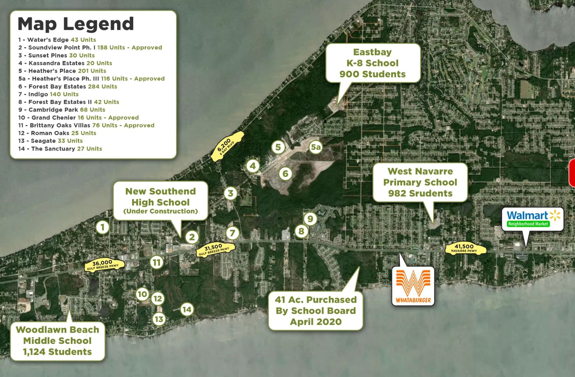 Currently wooded and undeveloped, the site is strategically located near established neighborhoods, commercial centers, and the Holley-Navarre Water Systems reclaimed wastewater facility.The Santa Rosa County market has experienced a 19% population increase in the past decade, making it one of the fastest-growing regions in the U.S. With increasing demand for housing, commercial space, and recreational developments, this property provides an unmatched opportunity for investors and developers looking to capitalize on the region’s rapid growth. The combination of strategic location, zoning flexibility, and natural site features makes this property an ideal choice for large-scale development.