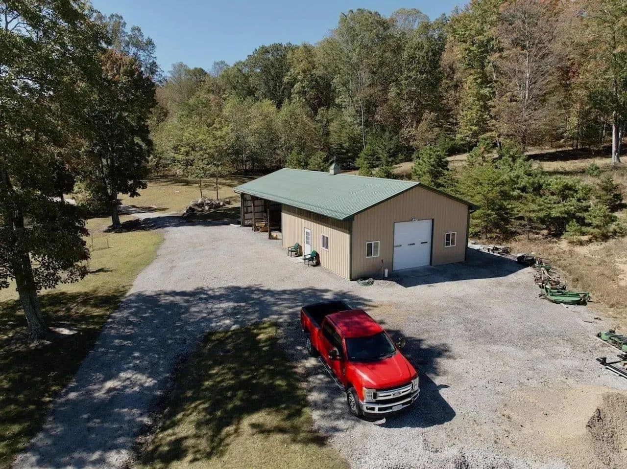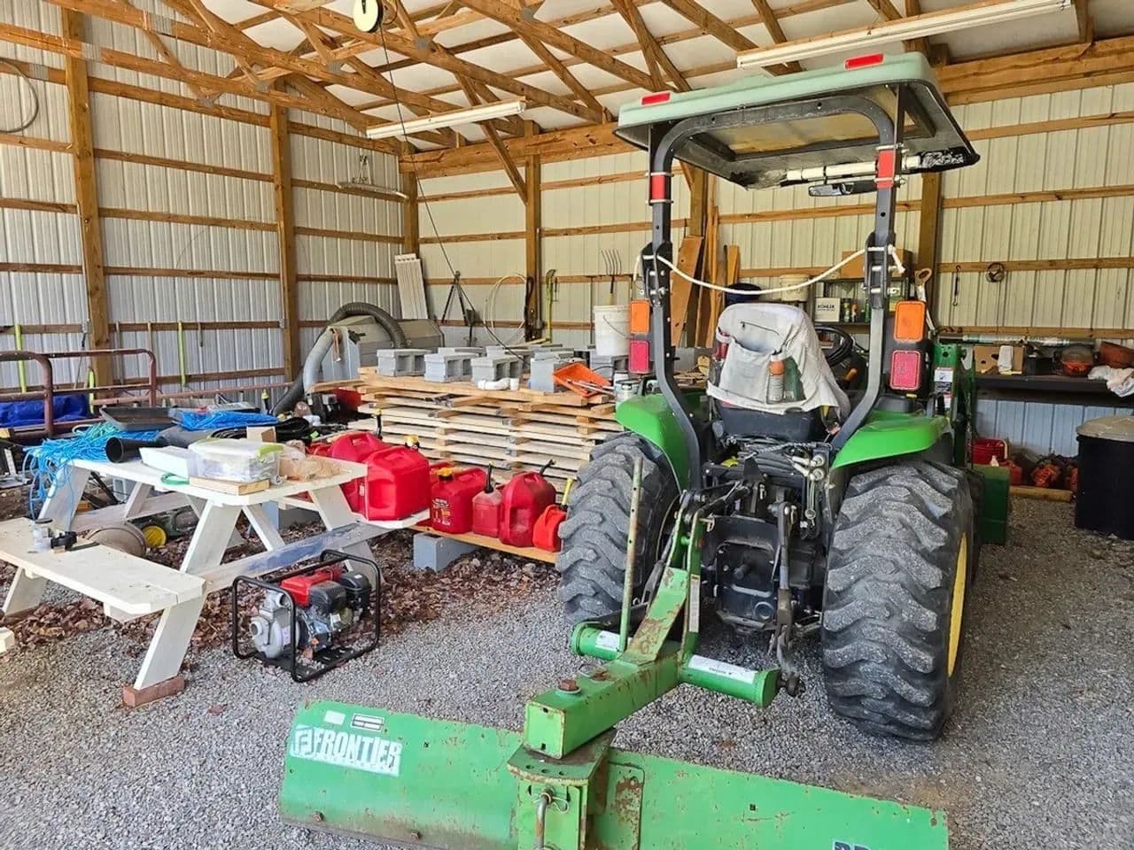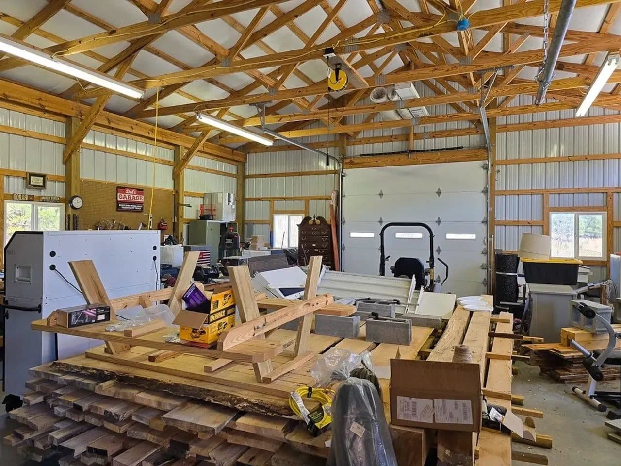 Custom-built workshop/garage complete with tools, lumber, a tractor with implements, and a low-mileage F-250 pickup—all included