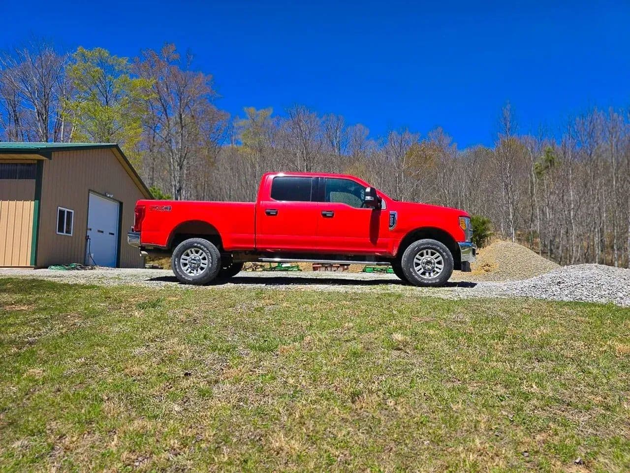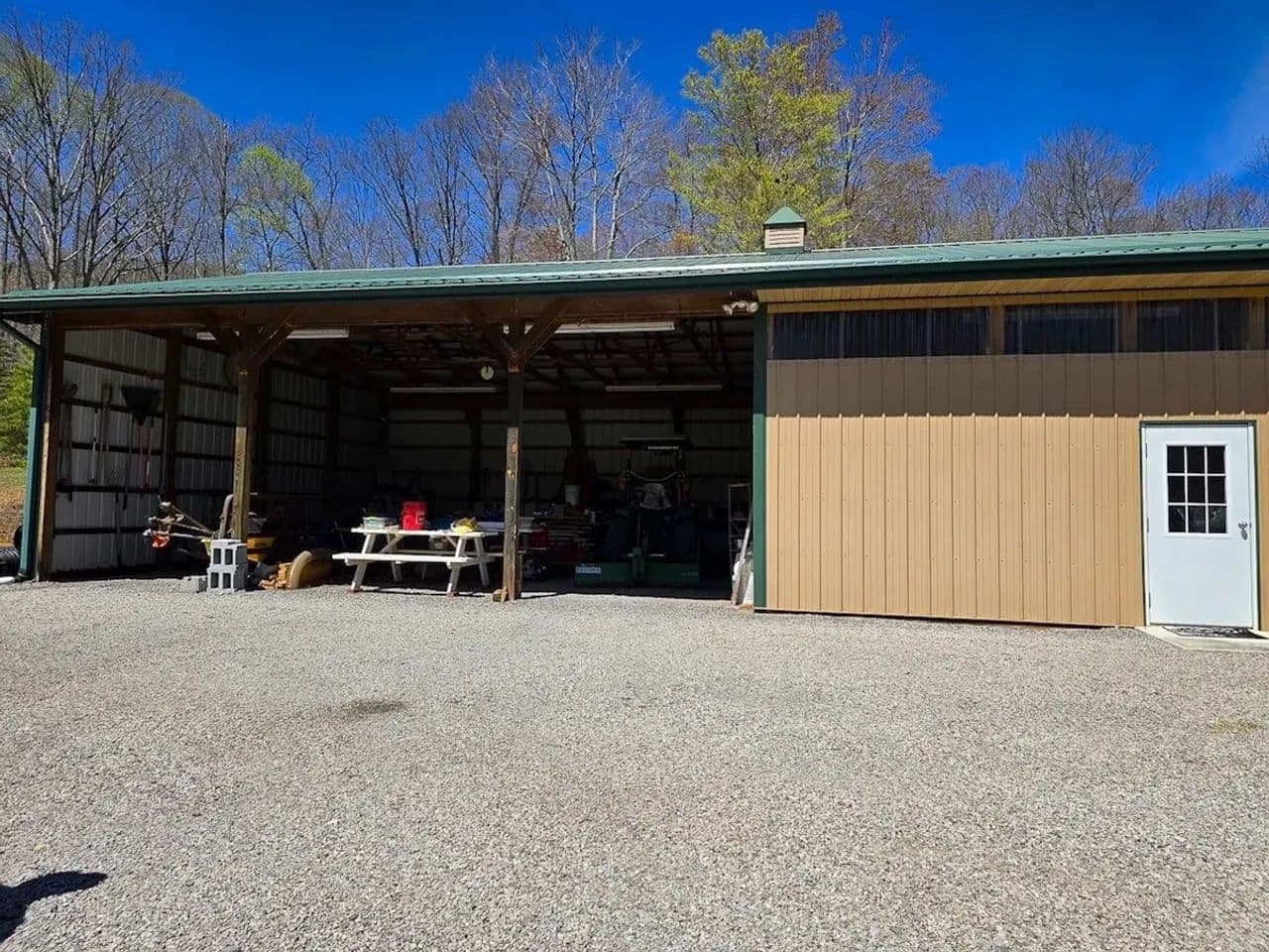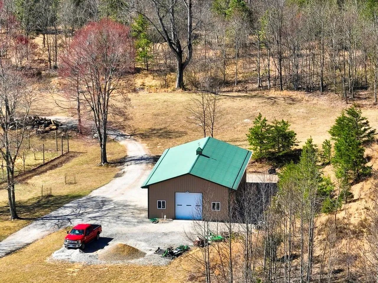 Custom-built workshop/garage complete with tools, lumber, a tractor with implements, and a low-mileage F-250 pickup—all included