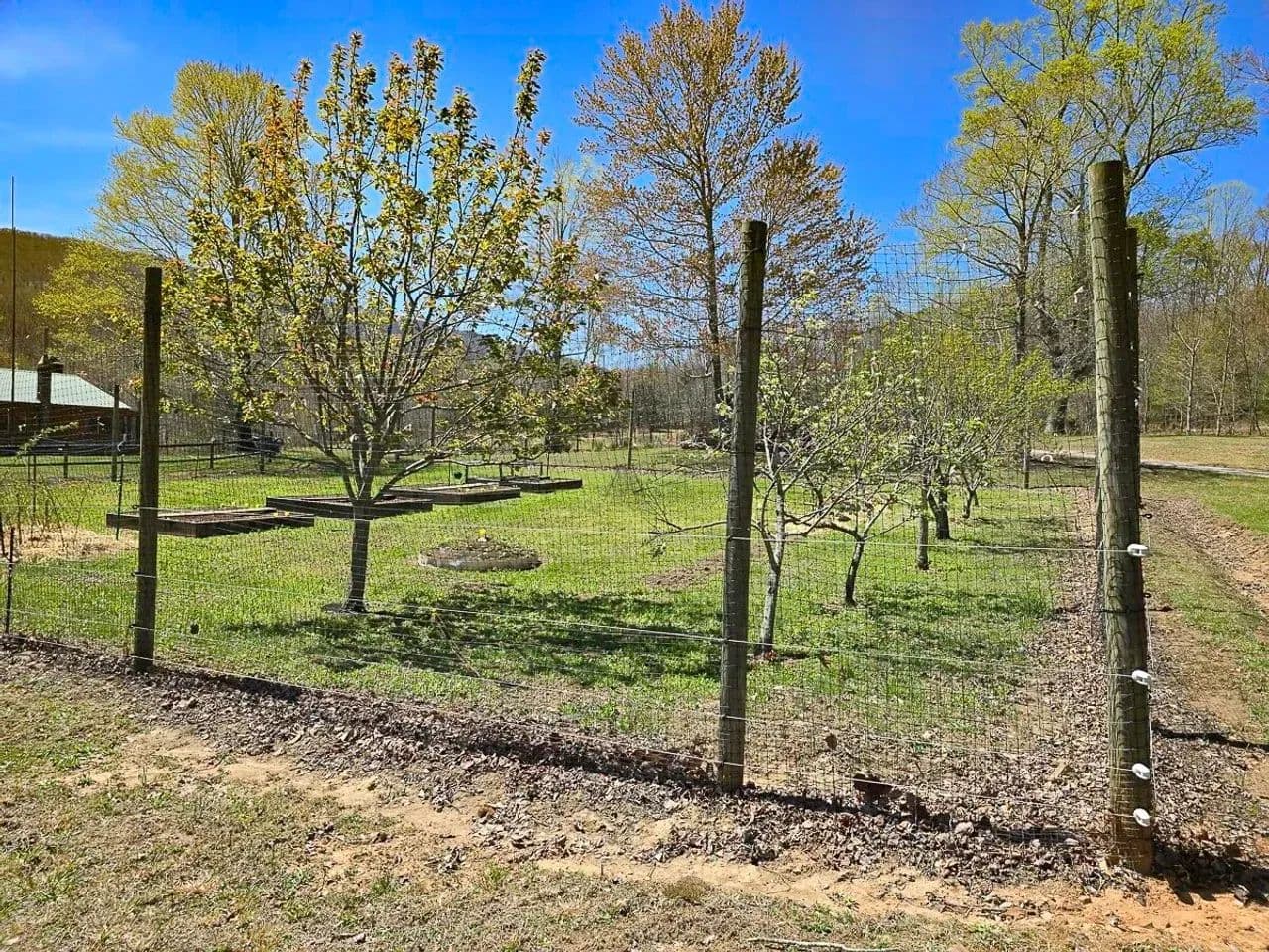 High-fenced gardens with fruit trees and vegetables