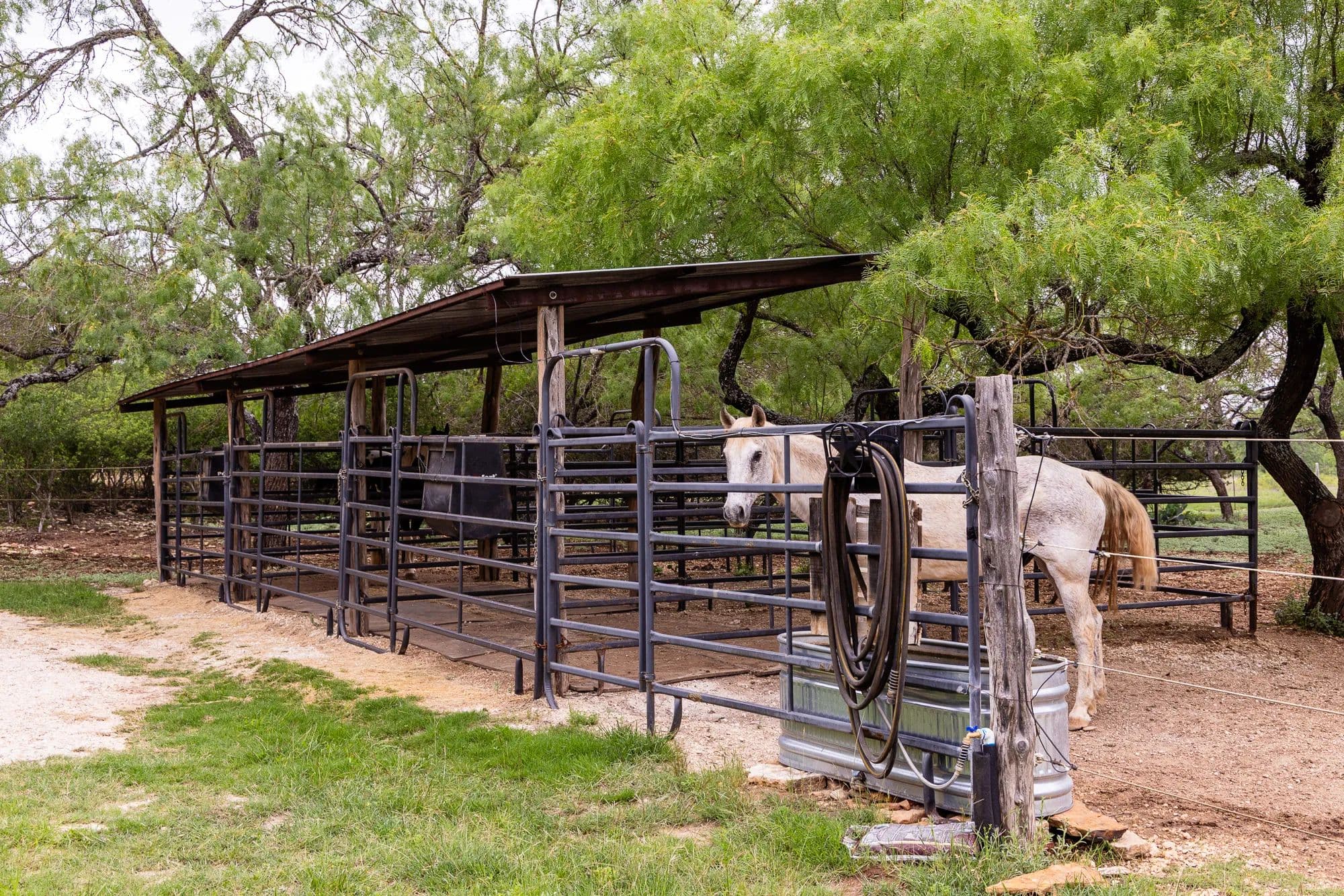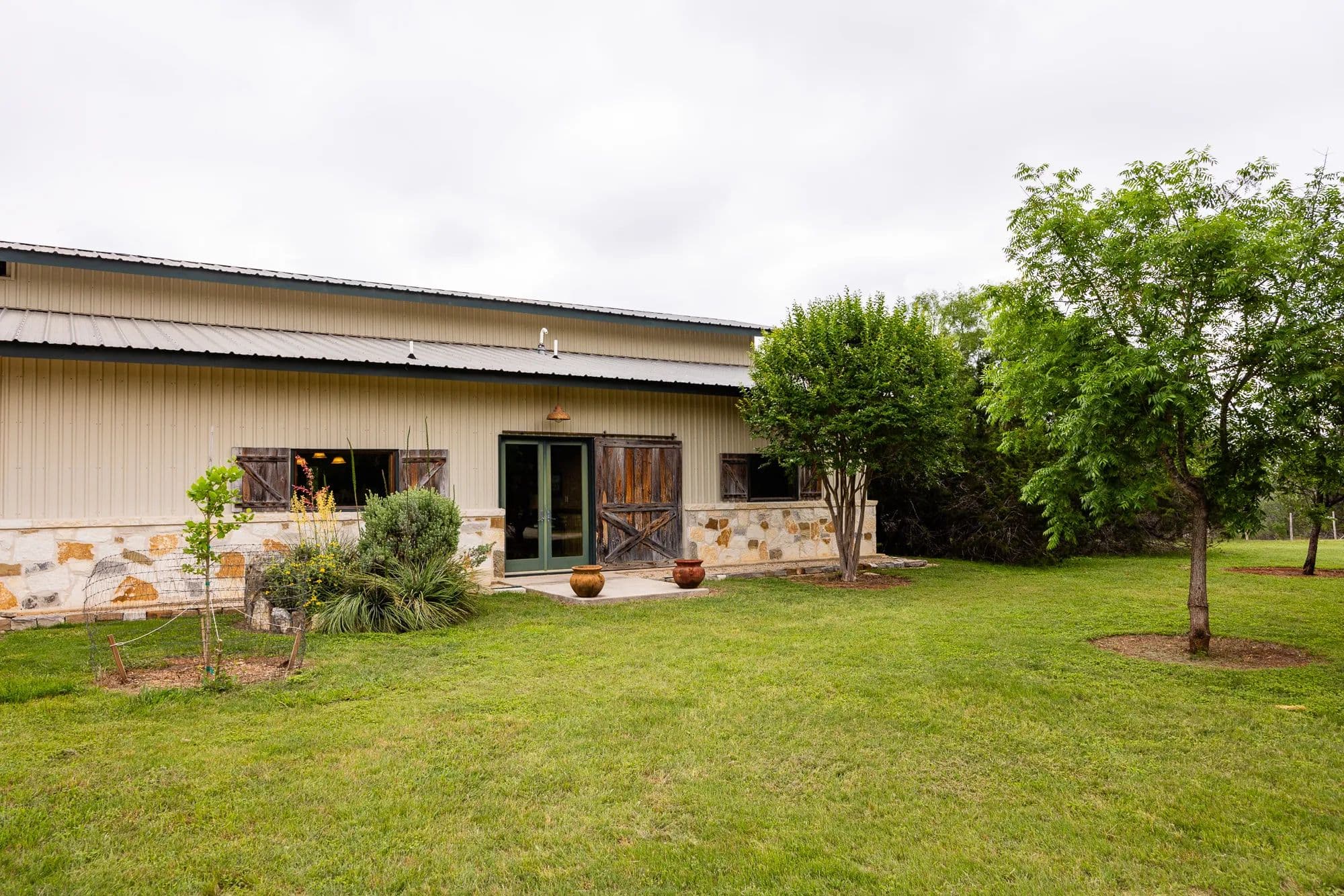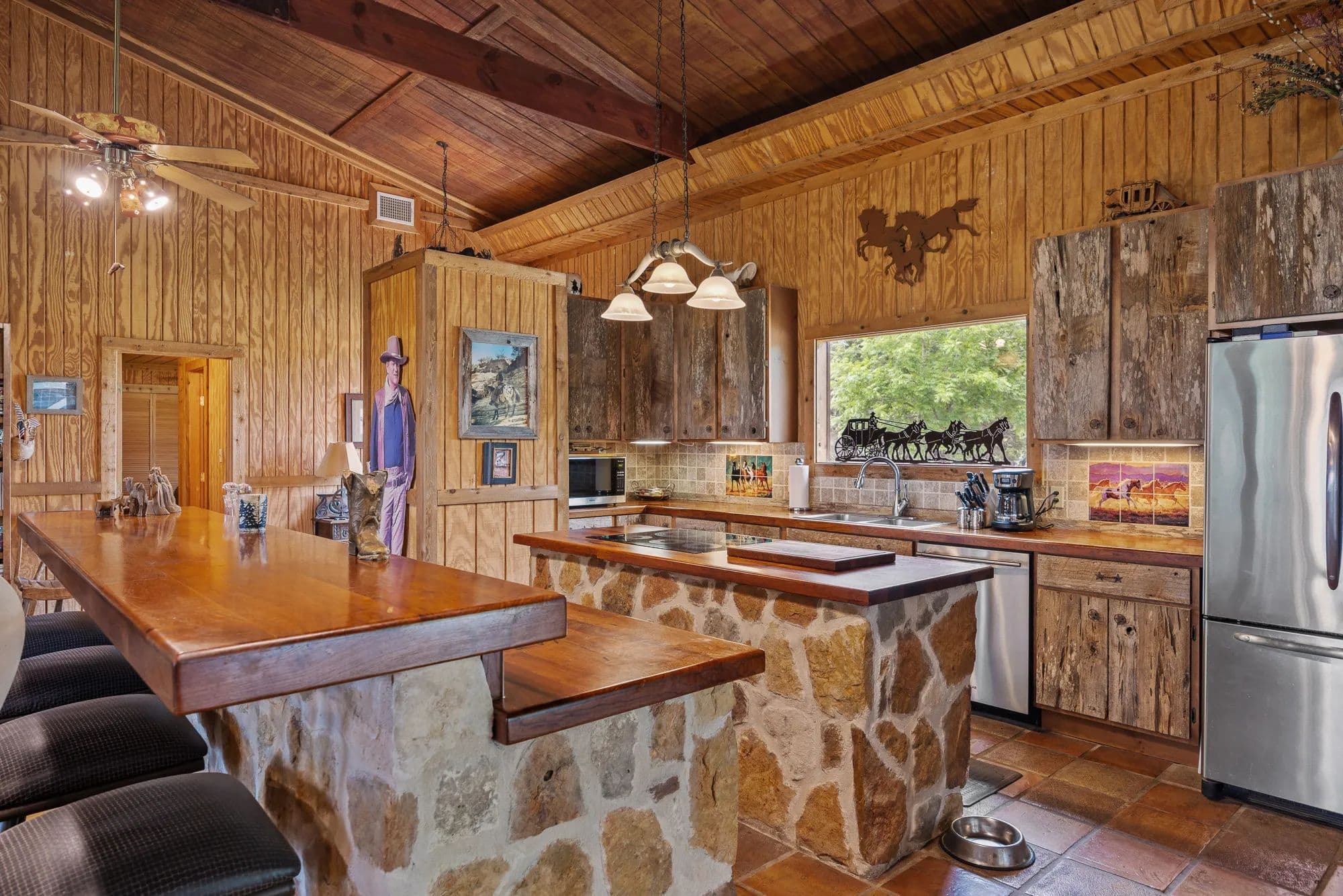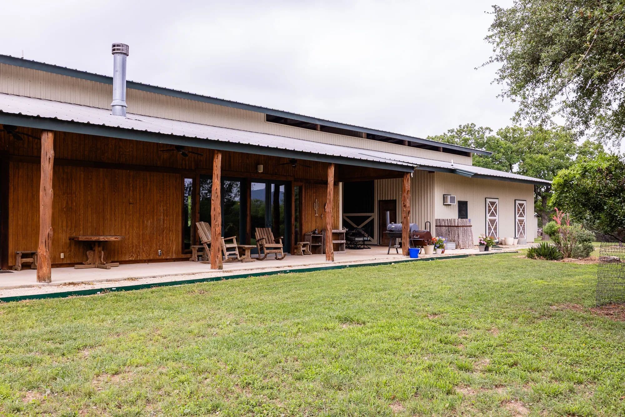 Everyone knows the famous spot on Highway 16 between Bandera and Medina where the huge canopy of Pecan Trees cover the roadway like a warm blanket. Kyle Ranch Road is a premier address in the county at this location. Come escape to this gorgeous 50 acres just two miles south on Kyle Ranch Road. The 2000+ SF home is perched overlooking the beautiful Oak covered countryside. The barndominium is split with a patio in the center for entertaining. The main home is a two bedroom, two bath home with a massive open concept living room, dining room and kitchen. The other section of the barn contains a third bedroom and full bathroom, office/laundry area, heated/cooled storage/workshop and two horse stalls. The covered back porch is 10 feet wide by 40 feet long. The interior of the home has saltillo tile floors, with wood flooring in the primary bedroom. The focal point of this home is the amazing kitchen. The Cypress cabinets and mesquite countertops were handmade by a local artisan who is renown for his woodwork. They are a masterpiece. The wood-burning fireplace was assembled with rock from the property and stands stately in the corner of the living room so as not to obstruct the amazing hill country views. This is truly a home to enjoy indoors and out. The property is divided into numerous pastures. The owners have horses and there is a round pen and sand arena, plus covered sheds in 3 paddocks for shelter. The 10 acre field is across the creek from the improvements and has good native grasses for cattle and horses. Winans Creek runs through the center of the property. It flowed for many, many years until this last drought that we are currently still experiencing. When it is flowing, there are beautiful waterfalls and deep holes along the bluff. For now, the creek bed provides topographical change in the landscape with solid rock bottom areas meandering around to the large bluff and great hardwoods for the turkey to hide in. Other improvements on the property include a 476 deep well with a 1500 gallon storage tank, greenhouse with electric and water, tractor barn with electric and another storage building next to the arena. This is an amazing property in a perfect location in the Hill Country of Bandera. Make your appointment today to come see what you are missing.
