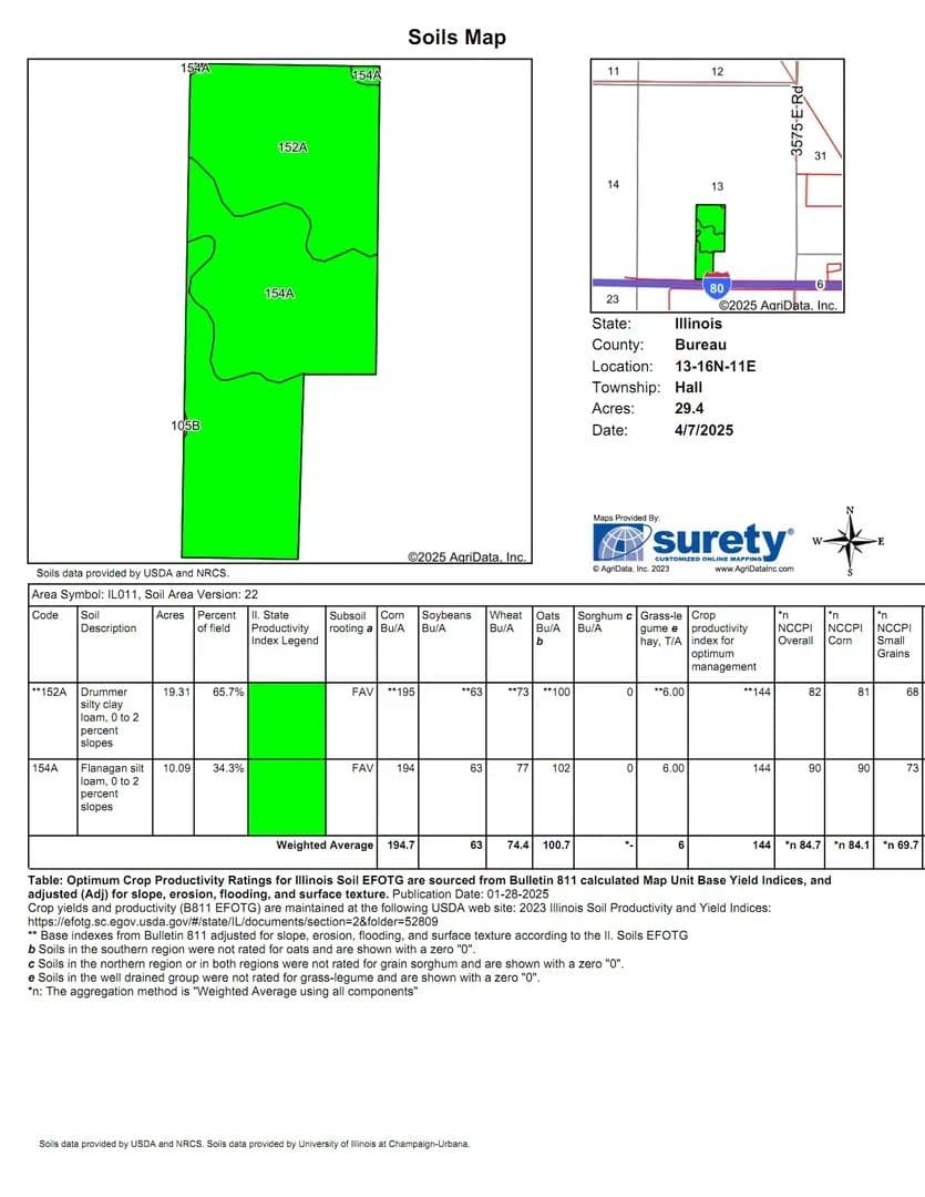 Land This property encompasses approximately +/- 30 acres of flat, contiguous land with a clean rectangular layout, offering maximum efficiency for both agricultural use and future development. The land offers flat topography, well-suited for construction or expansive industrial use. With an average Productivity Index (P.I.) of 144, the soil ranks as Class A farmland, reflecting its high agricultural value. Currently used for row crop production, the property is open and unobstructed by trees, allowing full utilization of the entire acreage. It features good, hard road access directly off 1500 North Avenue, with convenient connections to both Plank Road and Interstate 80—providing excellent transportation and logistical advantages for a variety of uses.