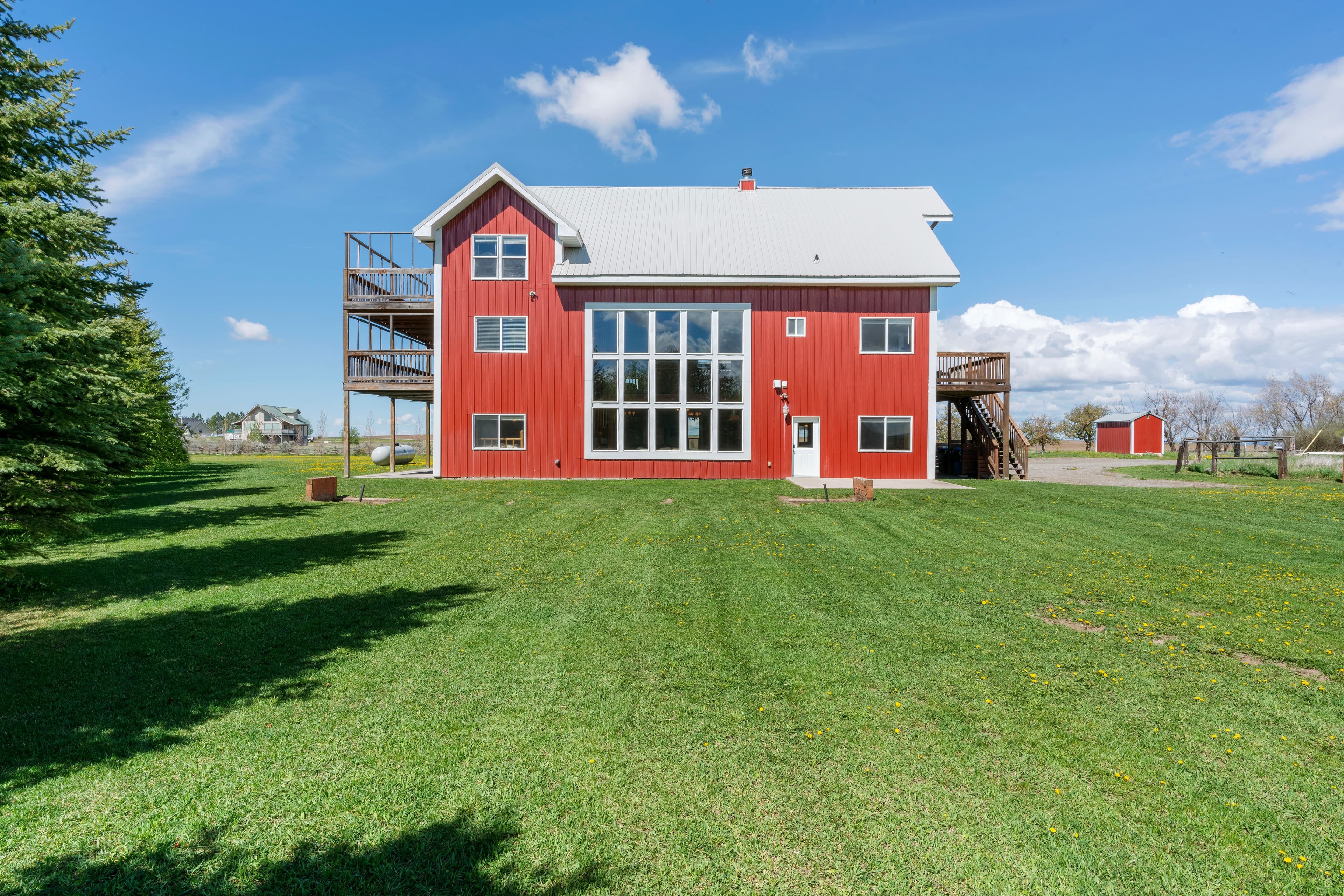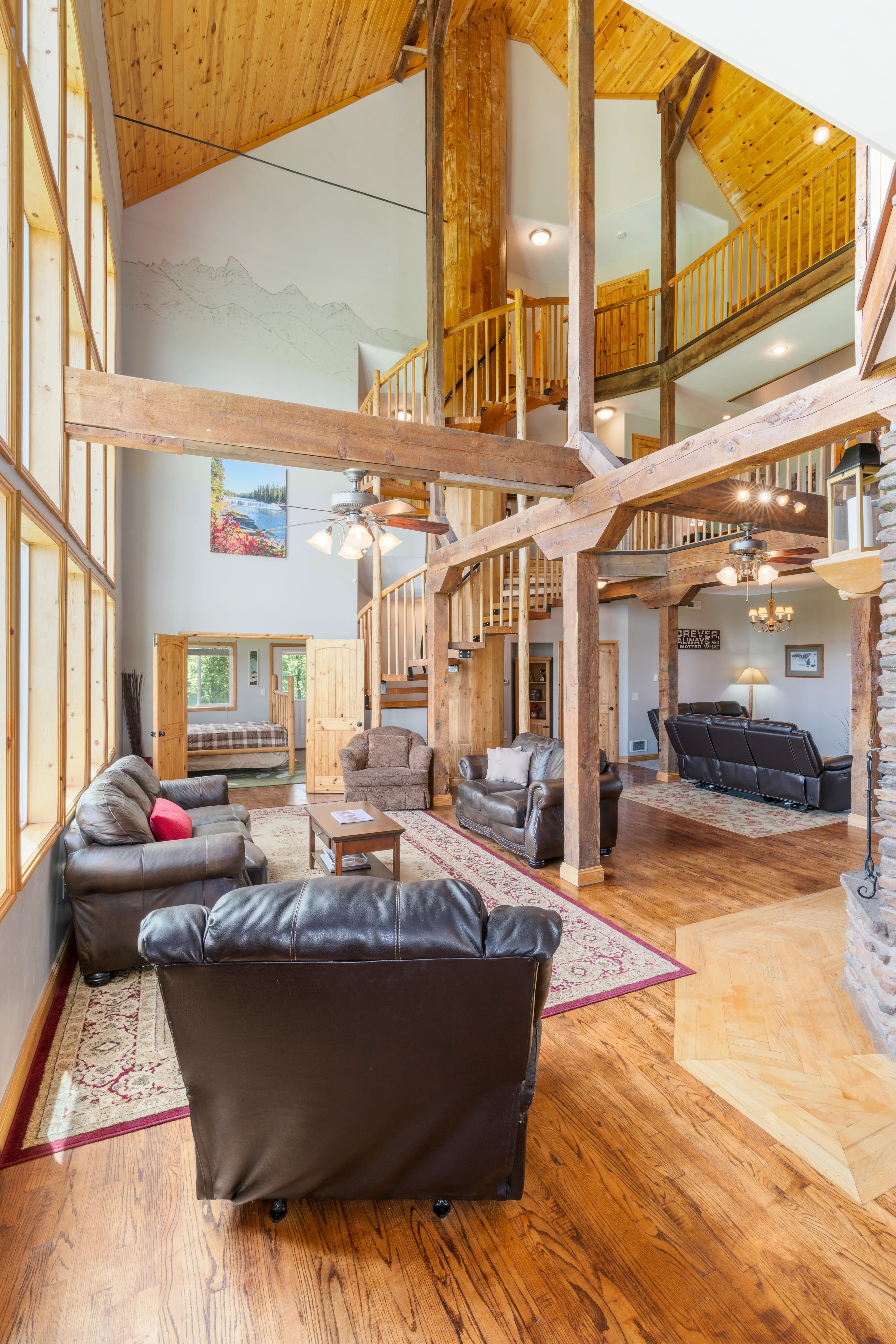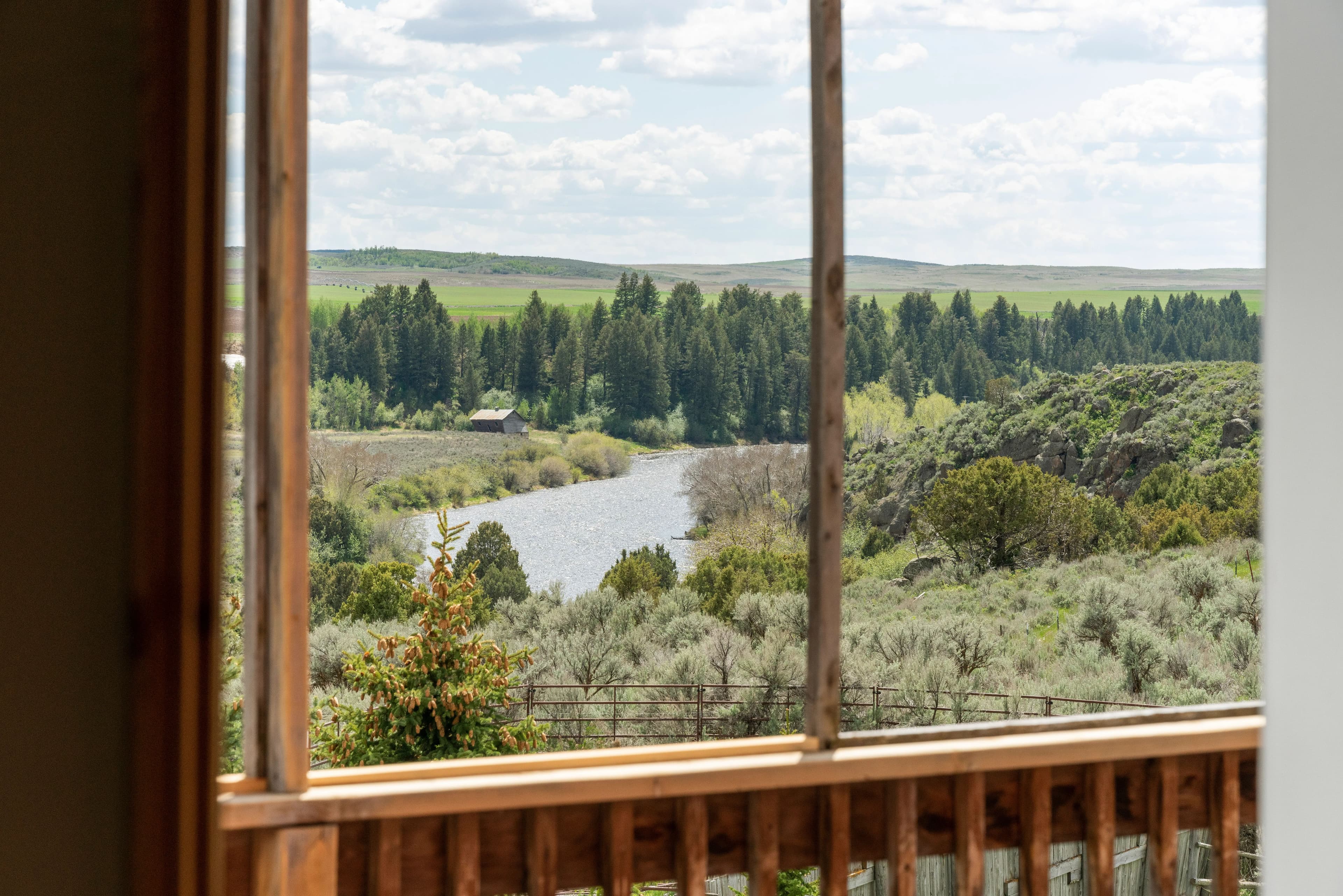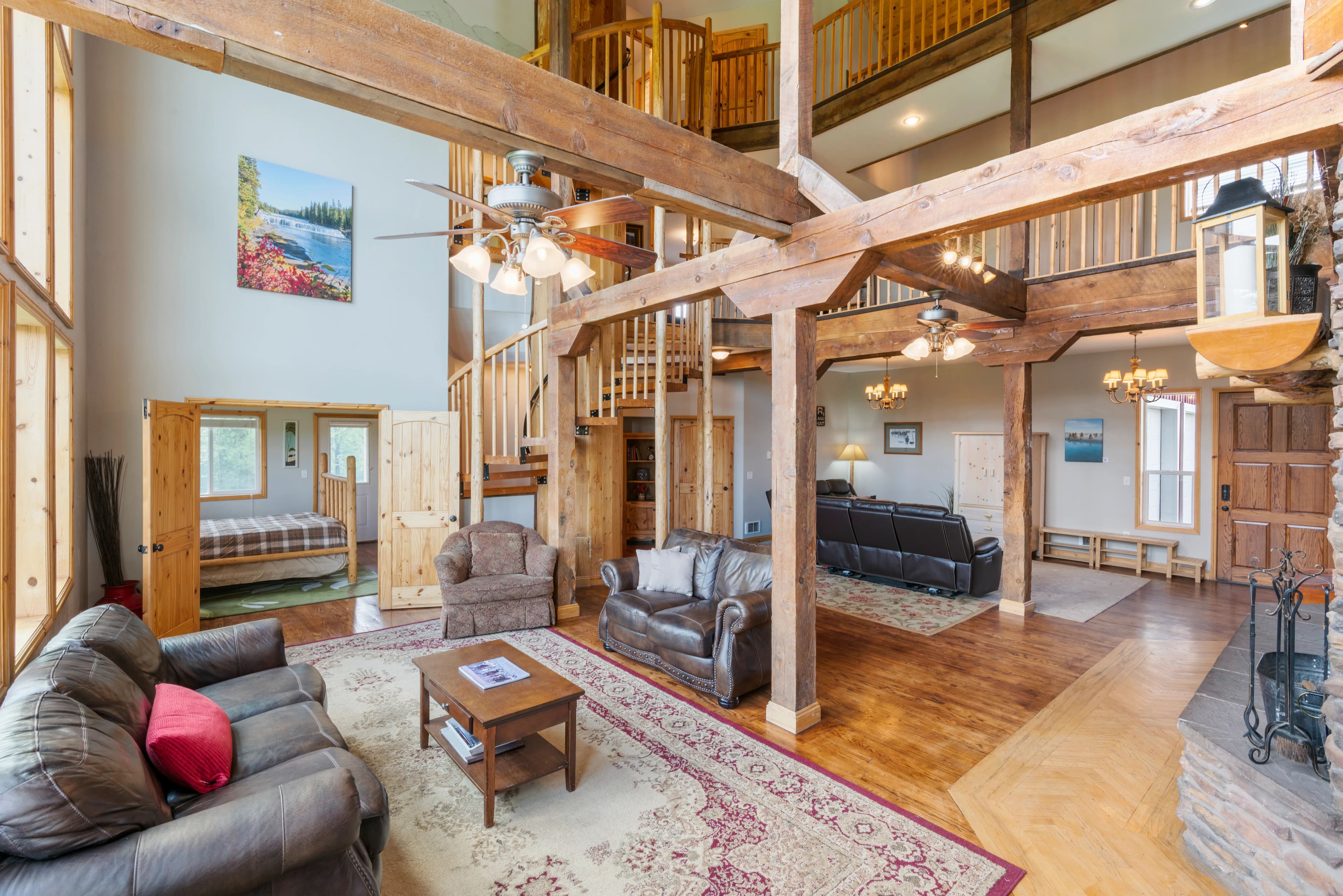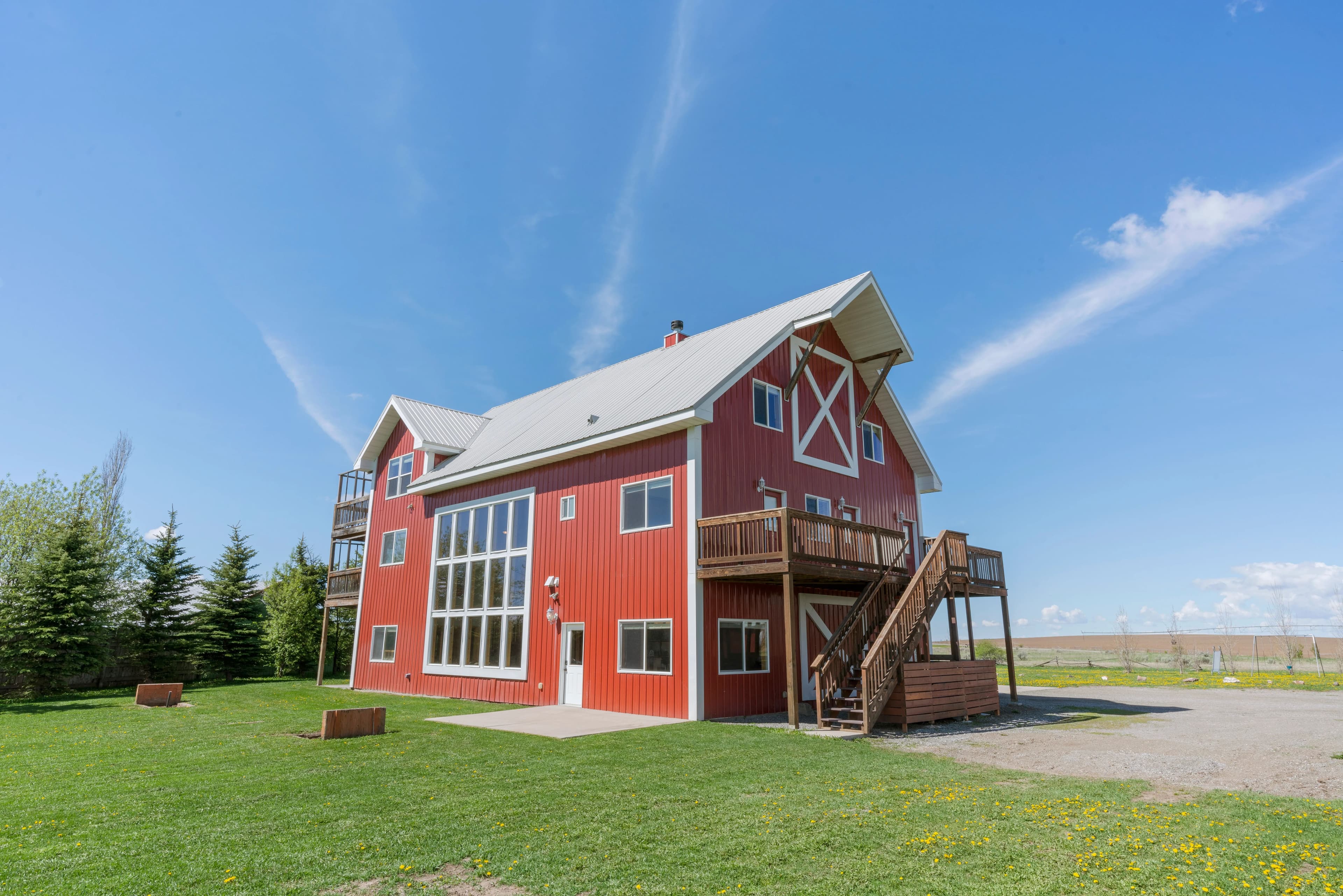 This remarkable property would make an idyllic family retreat, vacation get-away, or vacation rental, averaging $80K in rental revenue per year. Set on a sunny bluff with views of the Tetons as well as the Fall River, this 7-bedroom, 4-bathroom home with over 5400 square feet has plenty of space for hosting and entertaining large groups and for reunions of all kinds. The custom woodwork throughout the home is a must-see, including a 3-story spiral staircase and hand-finished original wood from a 1920 barn from this very site. The ceilings in the living room are 40 feet tall. The voluminous interior and abundance of natural light give the home a truly grand feel. There are decks on each floor as well as an irrigated lawn, providing copious outdoor space.