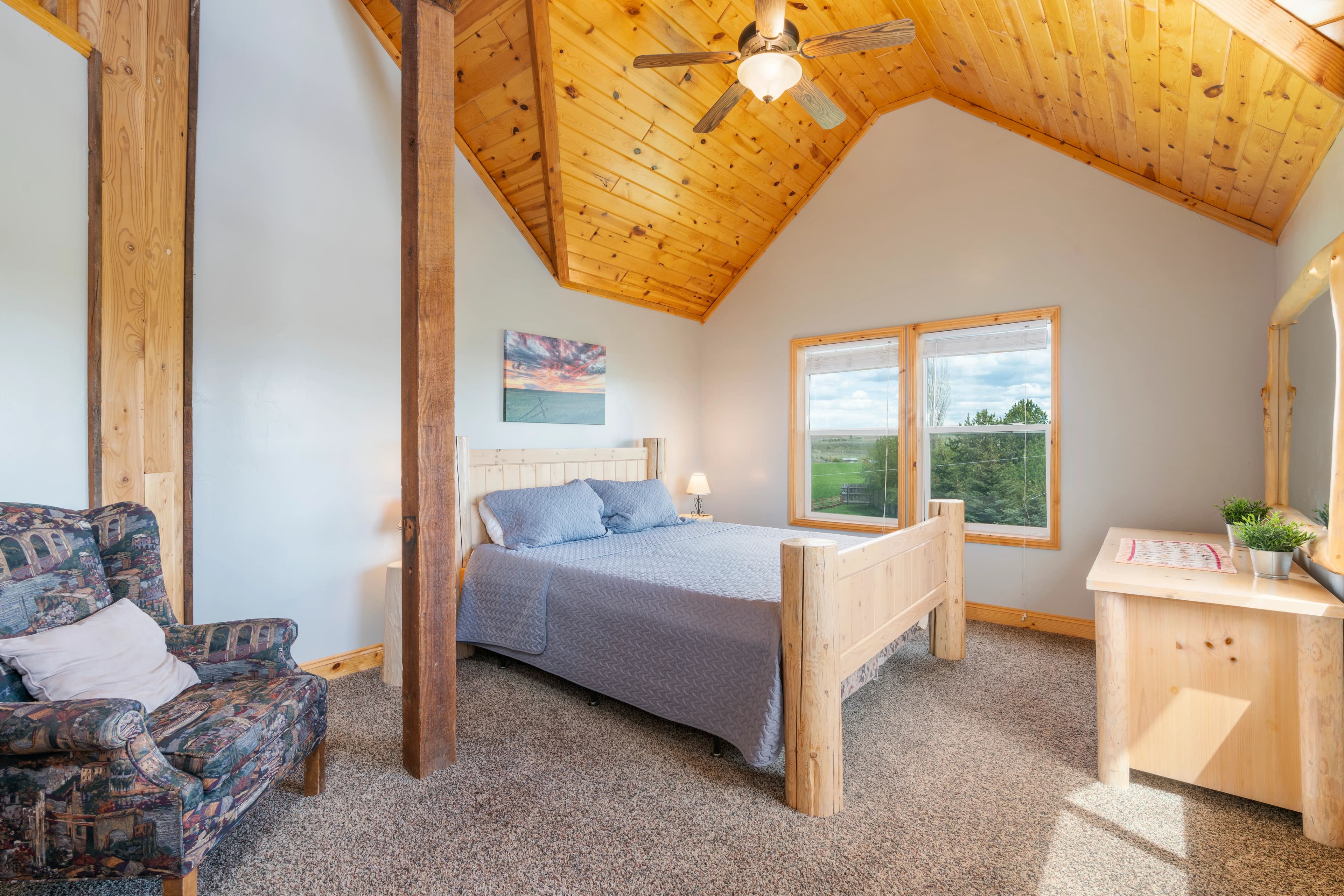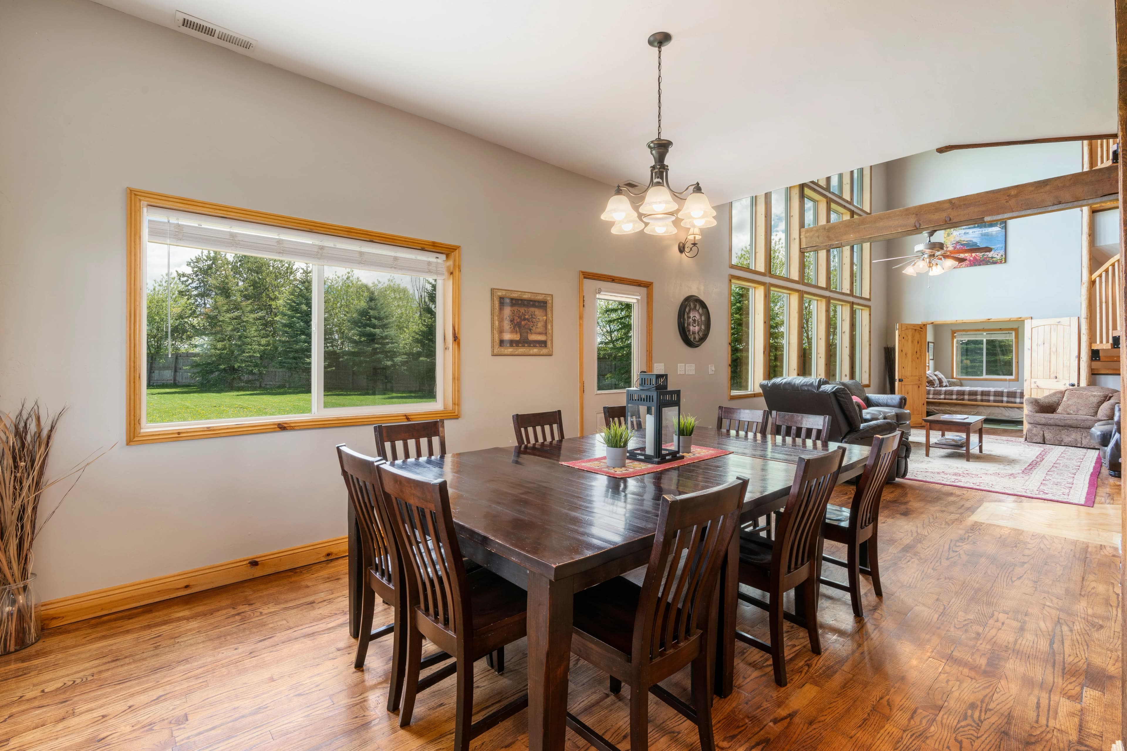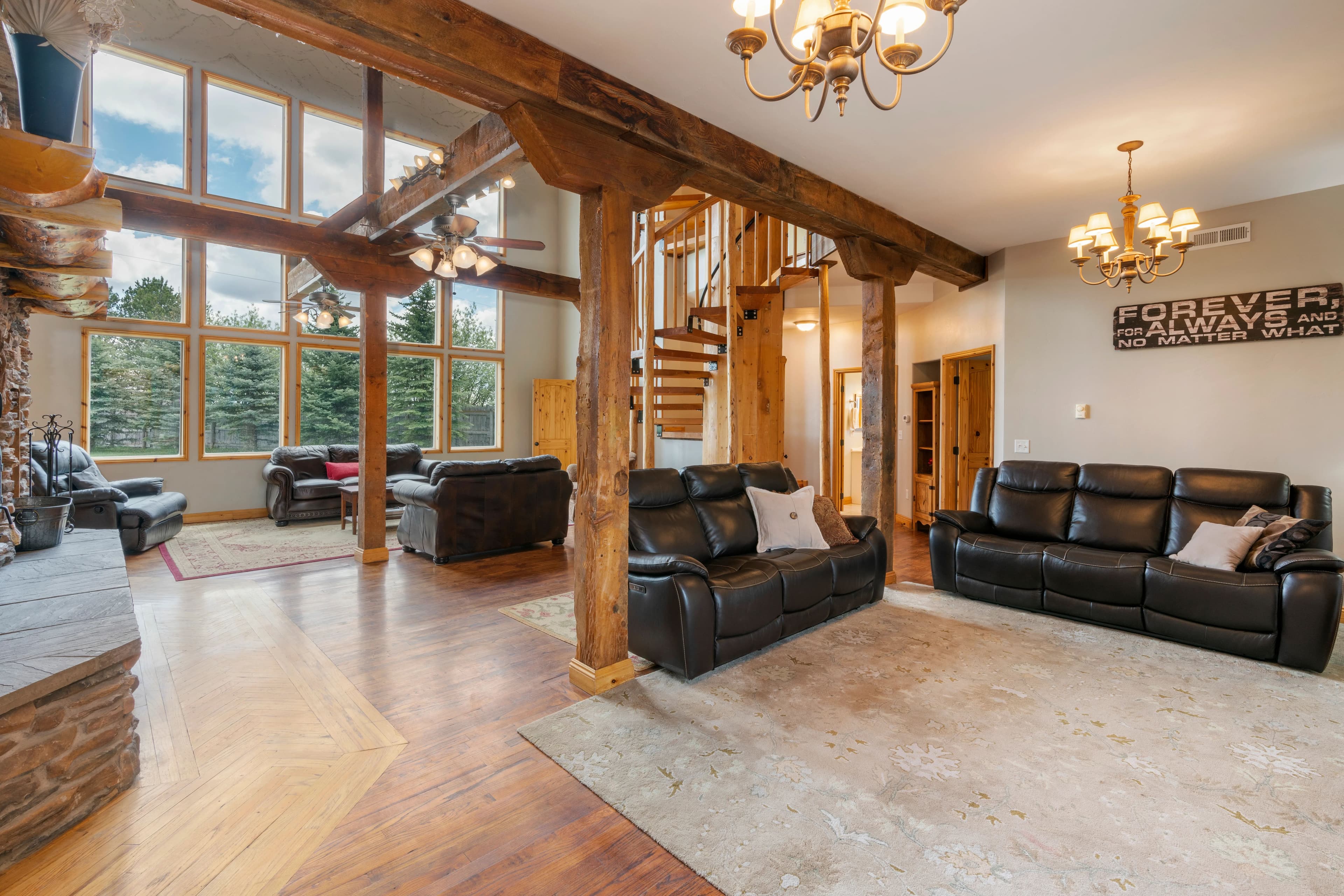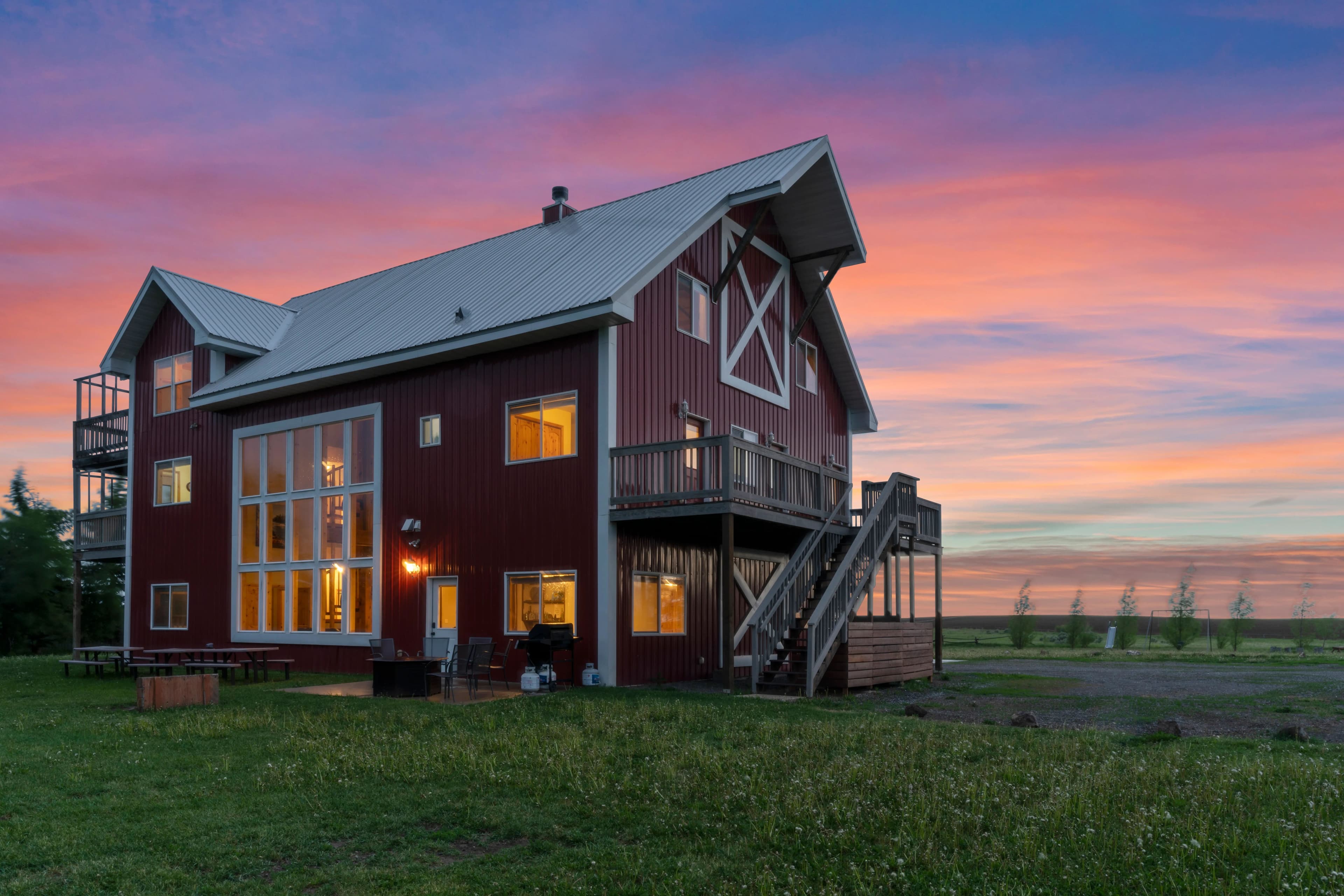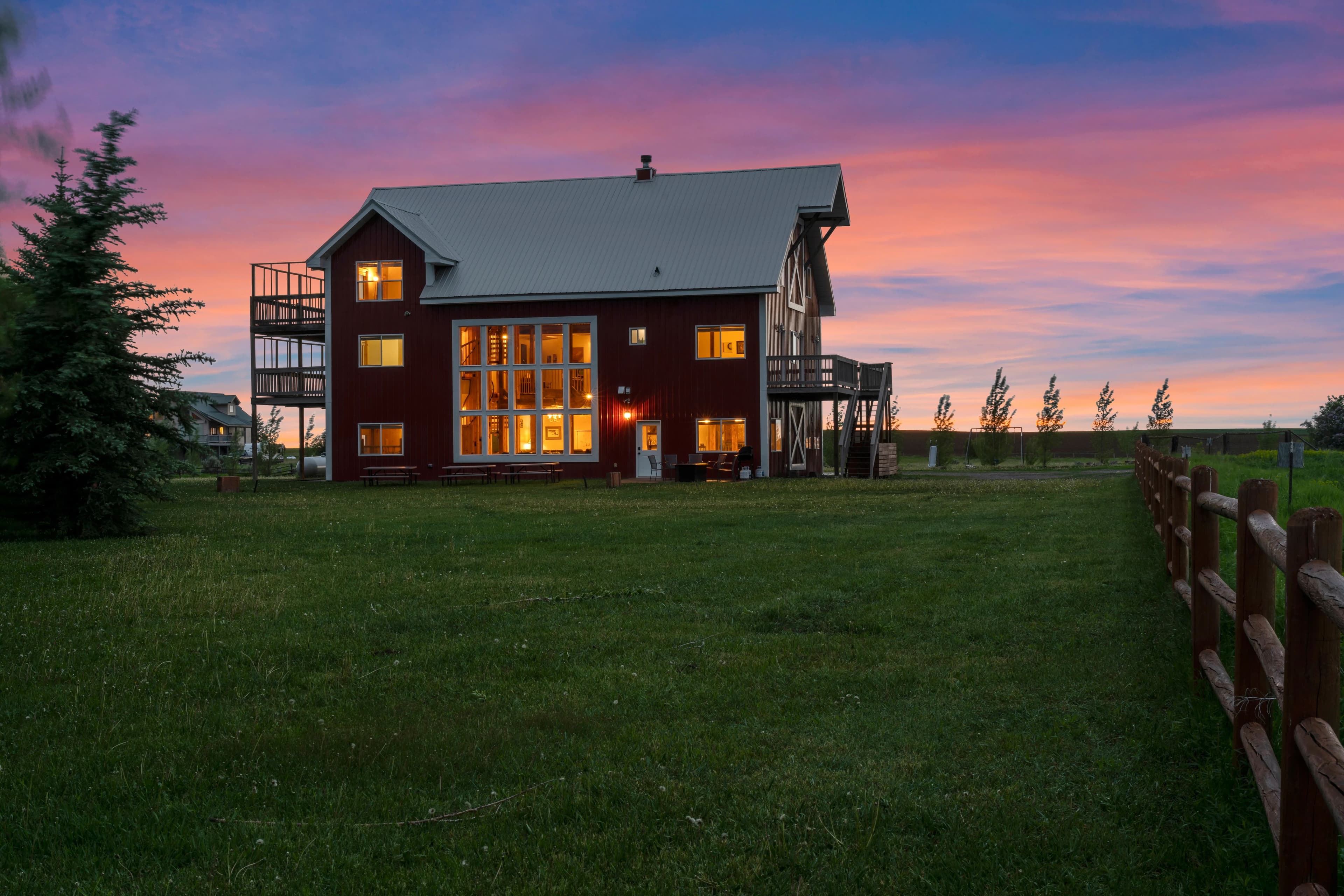 This remarkable property would make an idyllic family retreat, vacation get-away, or vacation rental, averaging $80K in rental revenue per year. Set on a sunny bluff with views of the Tetons as well as the Fall River, this 7-bedroom, 4-bathroom home with over 5400 square feet has plenty of space for hosting and entertaining large groups and for reunions of all kinds. The custom woodwork throughout the home is a must-see, including a 3-story spiral staircase and hand-finished original wood from a 1920 barn from this very site. The ceilings in the living room are 40 feet tall. The voluminous interior and abundance of natural light give the home a truly grand feel. There are decks on each floor as well as an irrigated lawn, providing copious outdoor space.