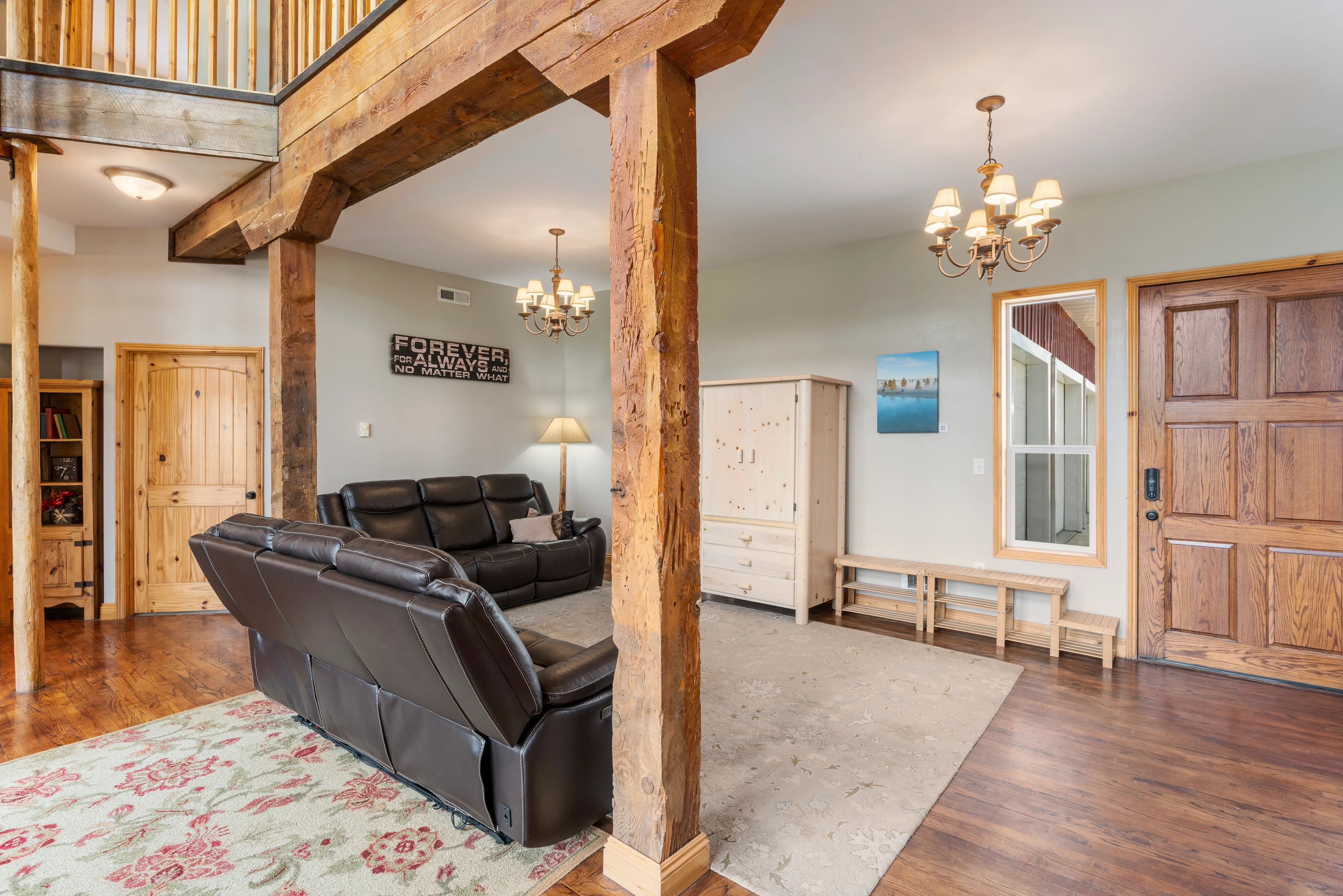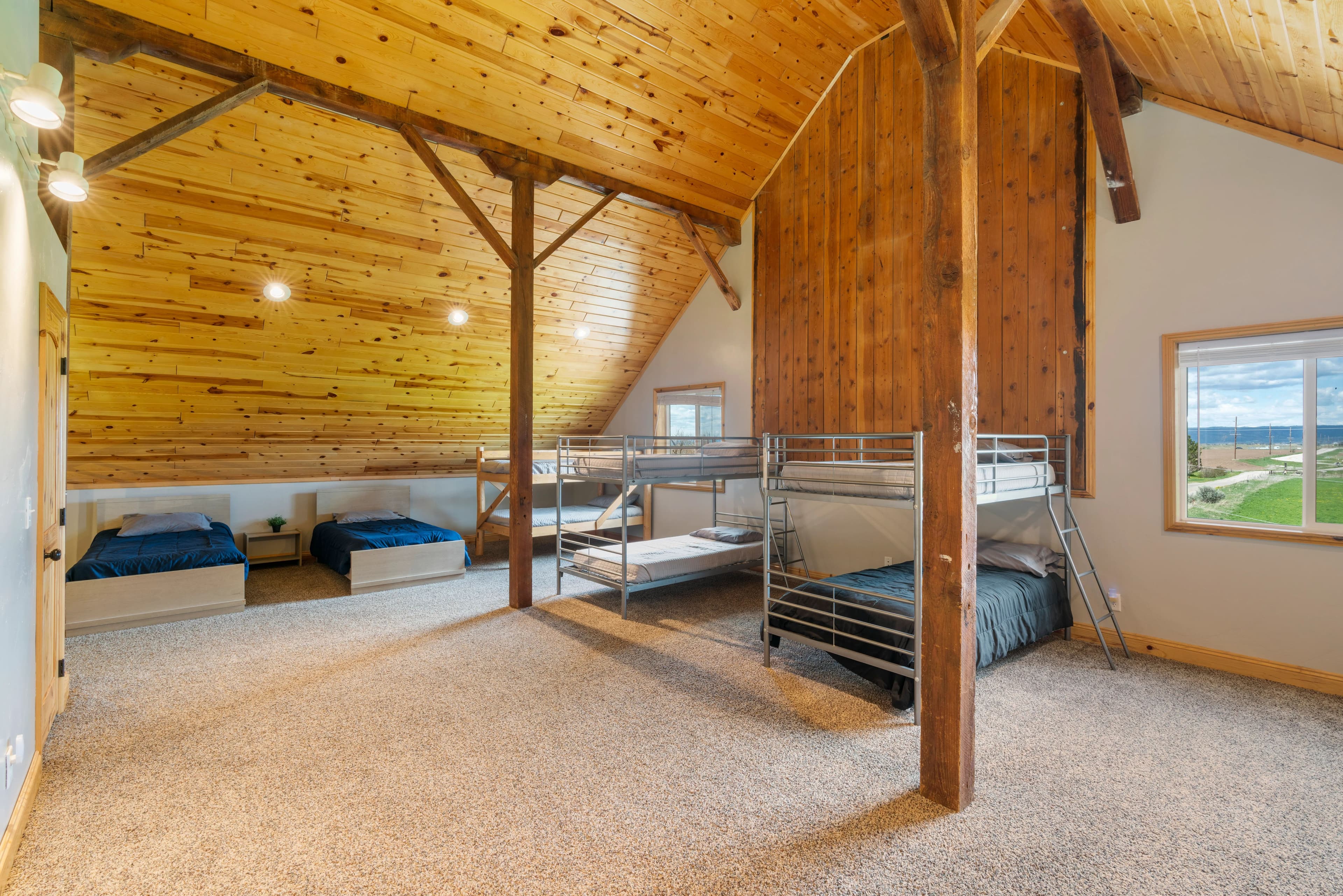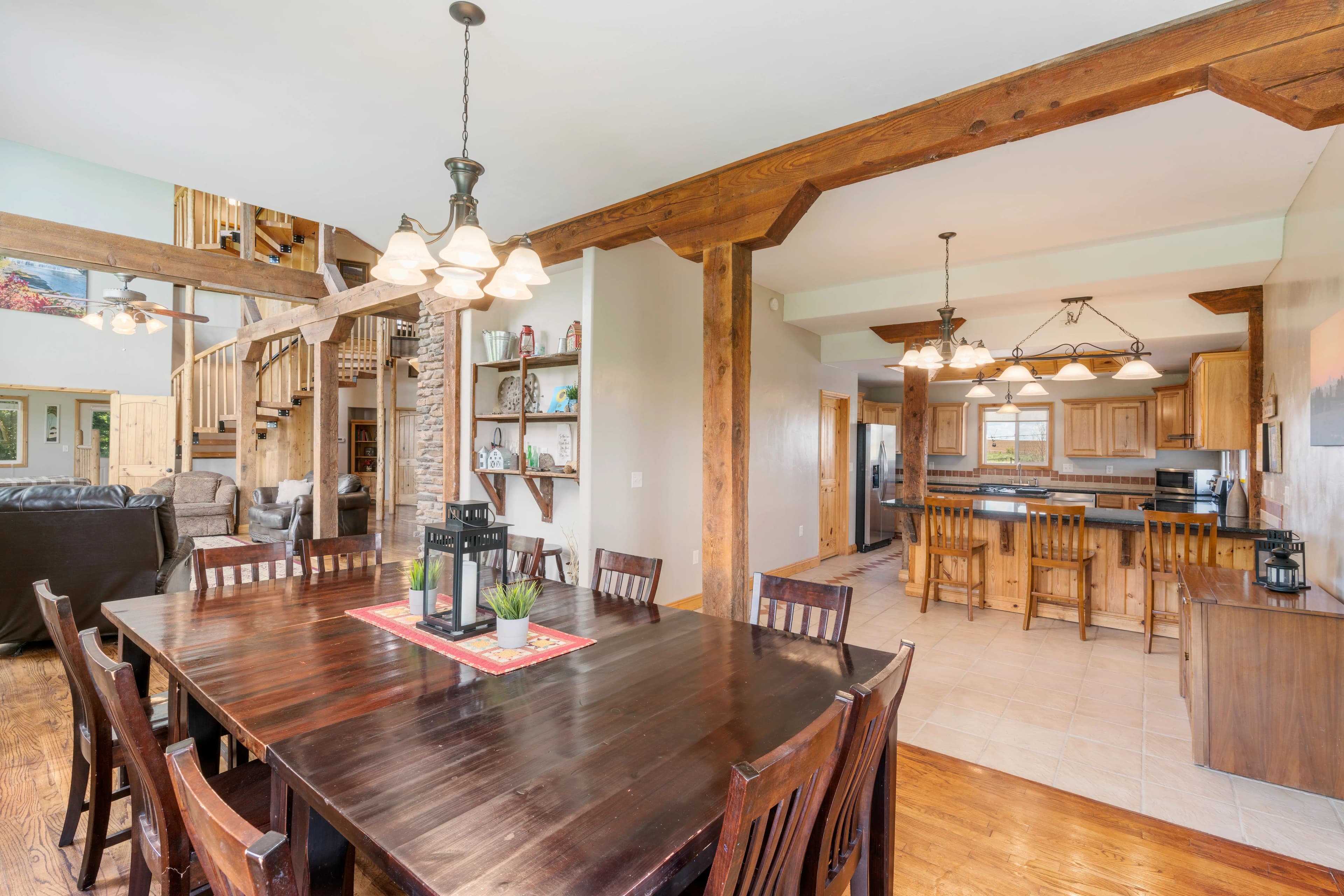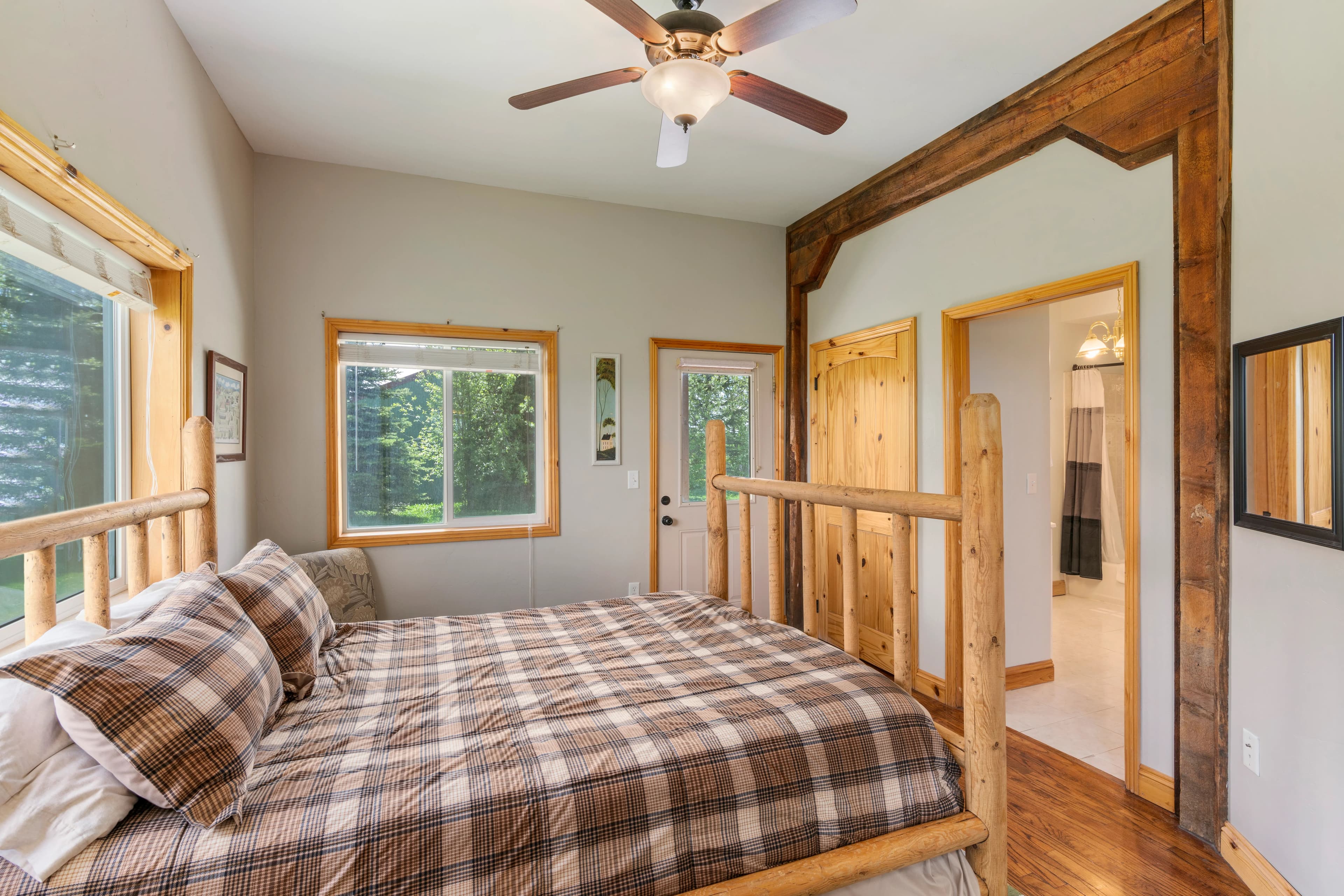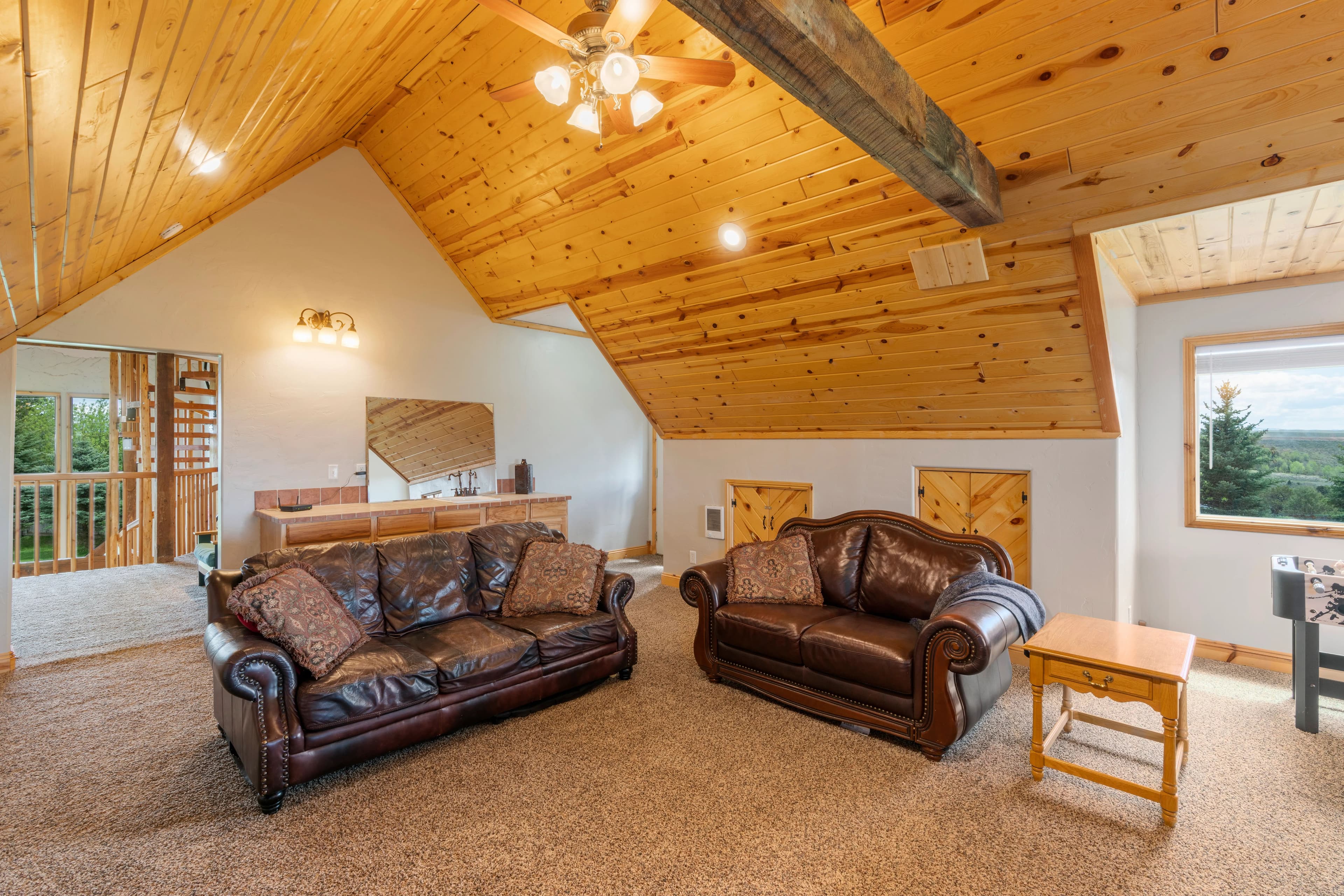 This remarkable property would make an idyllic family retreat, vacation get-away, or vacation rental, averaging $80K in rental revenue per year. Set on a sunny bluff with views of the Tetons as well as the Fall River, this 7-bedroom, 4-bathroom home with over 5400 square feet has plenty of space for hosting and entertaining large groups and for reunions of all kinds. The custom woodwork throughout the home is a must-see, including a 3-story spiral staircase and hand-finished original wood from a 1920 barn from this very site. The ceilings in the living room are 40 feet tall. The voluminous interior and abundance of natural light give the home a truly grand feel. There are decks on each floor as well as an irrigated lawn, providing copious outdoor space.
