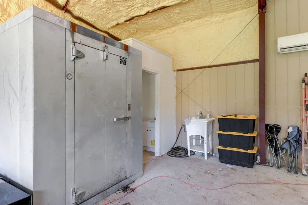 The property features a variety of well-maintained improvements ideal for both full-time living and recreational use. The main home offers approximately 1,900 square feet of living space, including three bedrooms, two bathrooms, a living room, family room, kitchen, dining area, and an oversized laundry room. A 280± square-foot bunkhouse provides comfortable accommodations for guests, family, or hunters. Nearby, a 625± square-foot workshop is equipped with two roll-up doors, a restroom, a cooler, and a game cleaning station. Several additional storage sheds are available, offering ample space for tools, equipment, and supplies. For shooting enthusiasts, the property also includes a private gun range near the living quarters, complete with covered shooting tables and well-constructed berms.