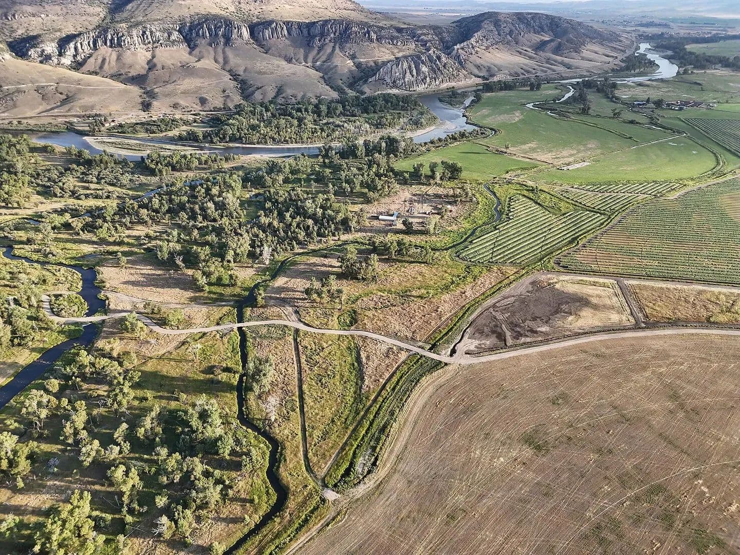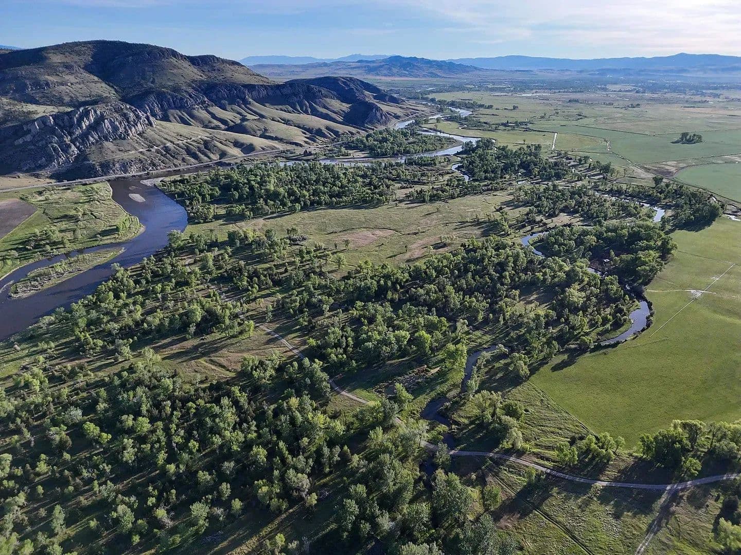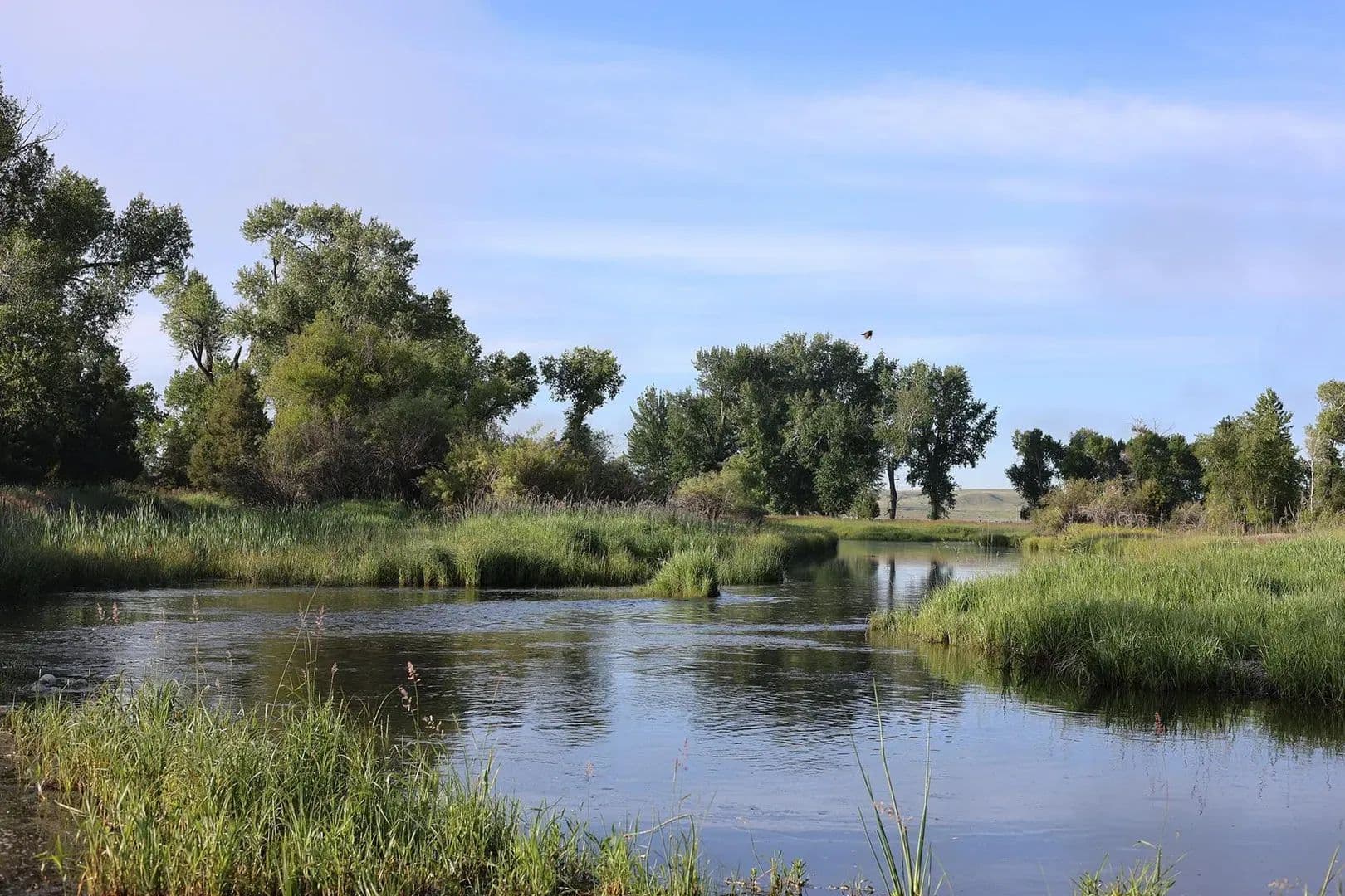 Perhaps the most unique aspect of the ranch is the lush, spring-laden bottomland along the Jefferson River. Here, springs, wetland complexes, and remnant river sloughs intertwine among hundred-year-old cottonwoods. The wildlife is prolific. A wide variety of waterfowl, including ducks (mallards, widgeon, blue-winged teal, cinnamon teal), Canada geese, and tundra swans, as well as geese, turkey, pheasant, eagles, sandhill cranes, and songbirds, are perpetually present. Big game, including whitetail deer, moose, and occasionally elk also call the ranch home.