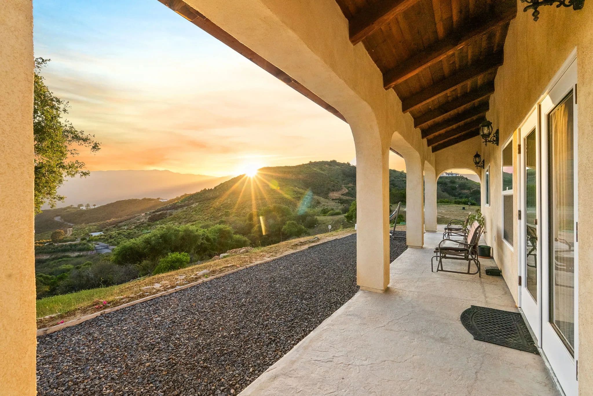 Tucked in the scenic hills of the desirable area of De Luz Heights in Fallbrook, awaits Hacienda del Sol, a stunning estate home situated on 10.09+/- acres. Inspired by the timeless elegance of Spanish Colonial architecture and effortlessly blending indoor and outdoor living, this custom-built 3-bedroom, 2½-bathroom home offers an exceptional lifestyle. The name, Hacienda del Sol, perfectly reflects the sun-soaked beauty and expansive vistas that grace this remarkable property. From breathtaking Easterly sunrises to spectacular Westerly sunsets, the home provides a serene sanctuary where you can enjoy peace, privacy, and endless natural beauty.