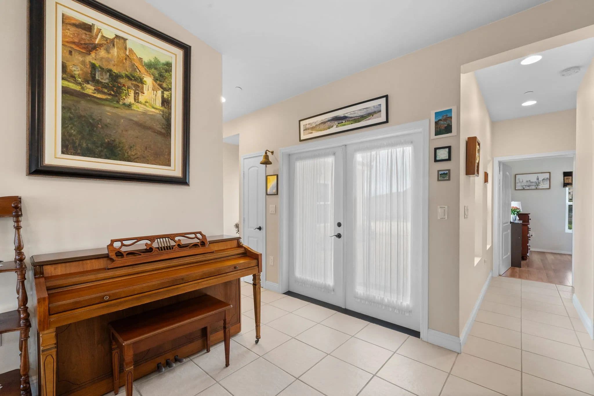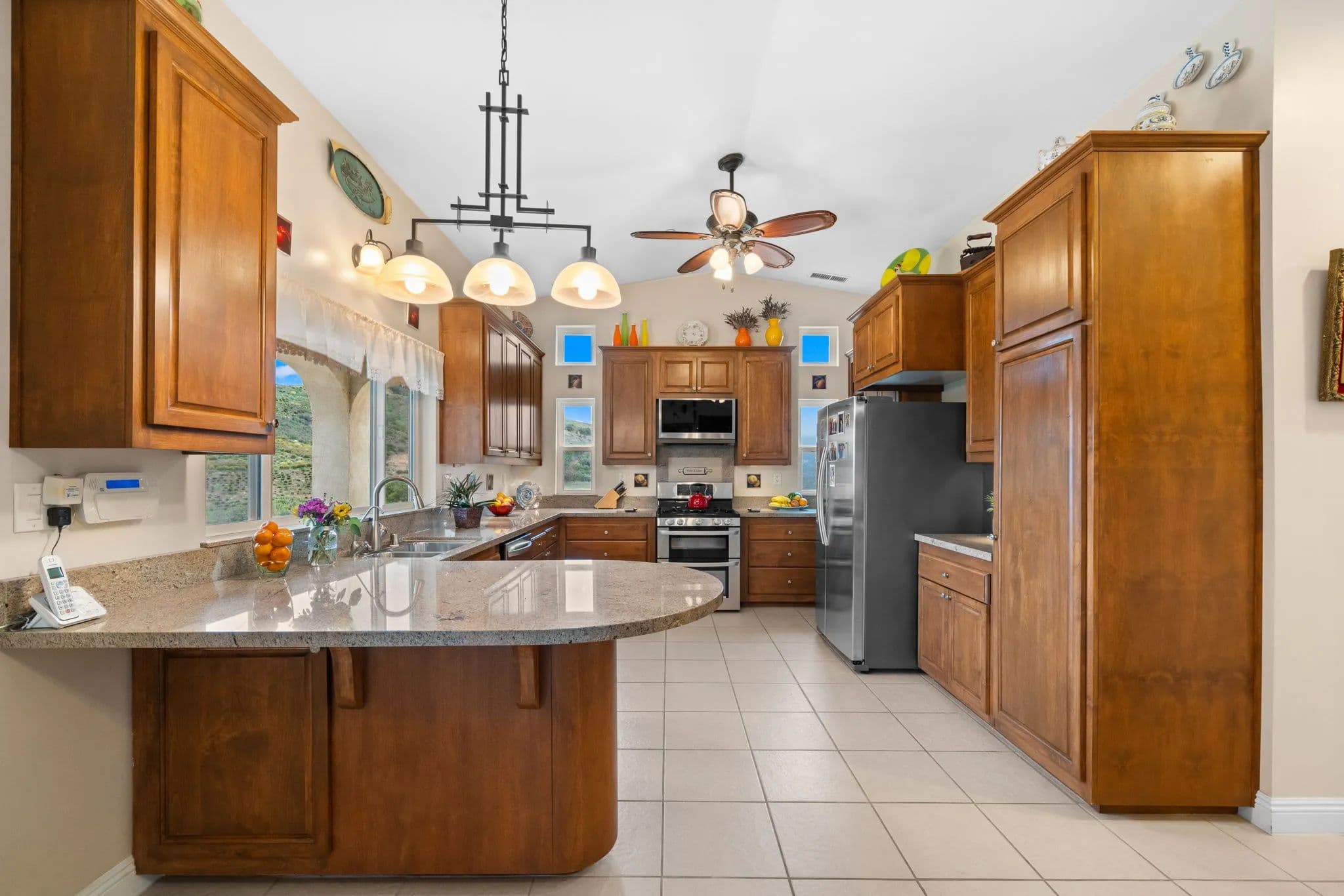 As you enter the home, the spacious foyer welcomes you with soaring ceilings and an abundance of natural light. The open concept living and kitchen areas flow seamlessly, providing a perfect setting for relaxation and entertaining. Large windows and doors frame the stunning views from every direction. The chef’s kitchen is an entertainer’s dream, with expansive granite countertops, beautiful wood cabinetry, a breakfast bar, and a large walk-in pantry.