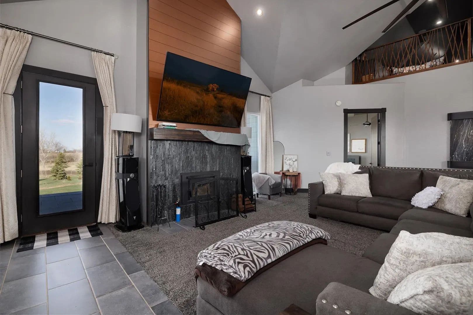 An open-concept living space features artistic metal railings, soaring ceilings, and a dramatic loft overlooking the main floor, creating architectural interest and a sense of grandeur throughout. The primary suite is a luxurious retreat, complete with a steam shower room, soaking tub, and custom closet organization. Wake up to breathtaking sunrise views to the east, enjoyed right from your bed or bath.