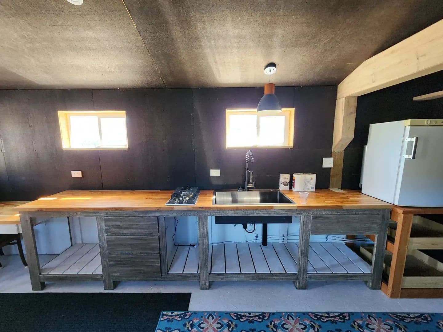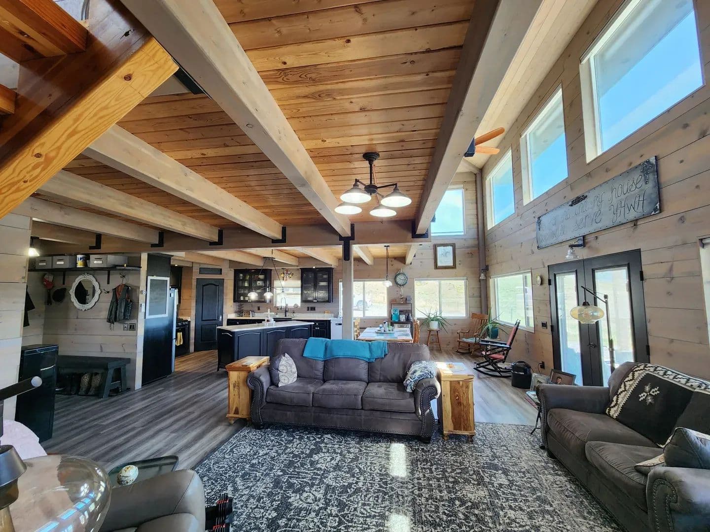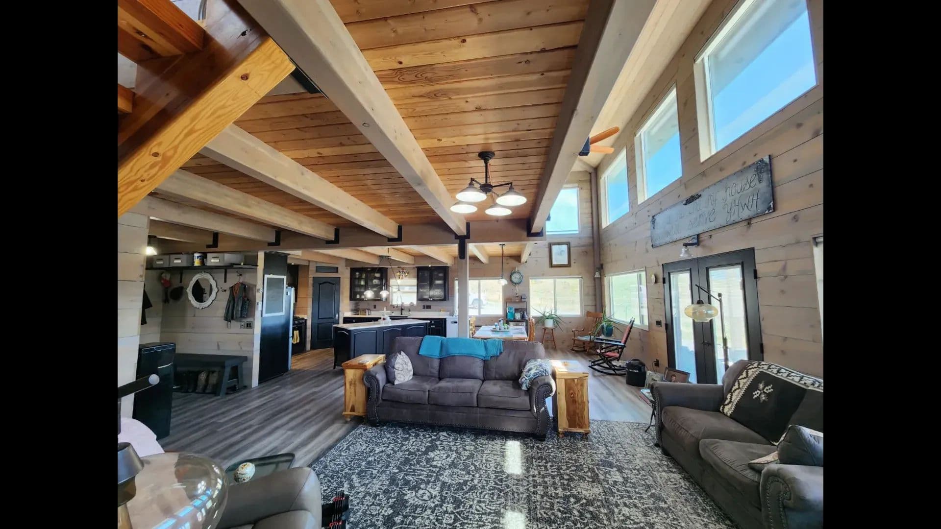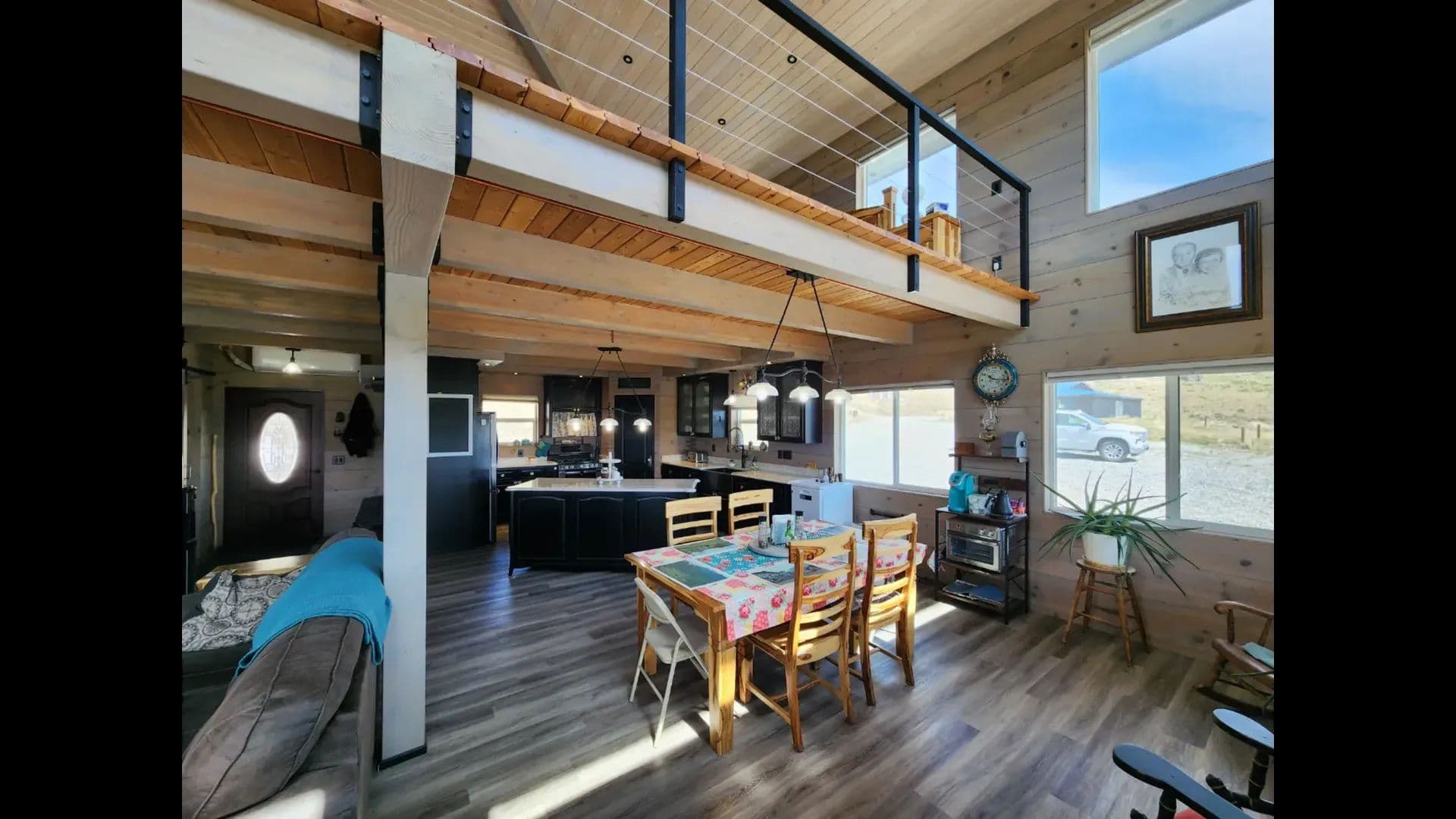 The main custom home features over 1,700 square feet with open-beam ceilings, a cozy pellet stove, and a large kitchen with granite countertops. A spacious loft offers an additional sleeping area and a bathroom with rustic charm.