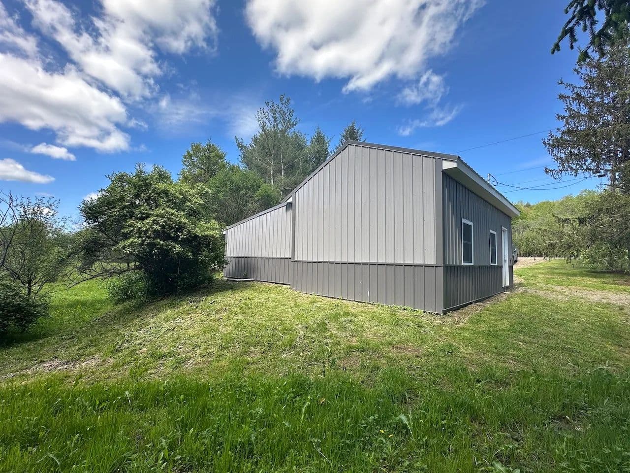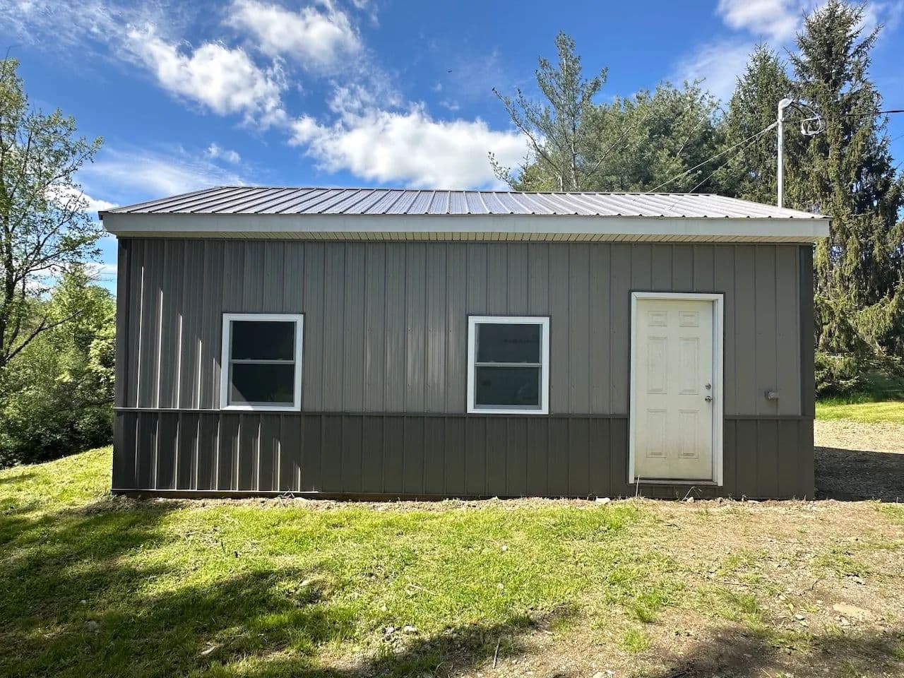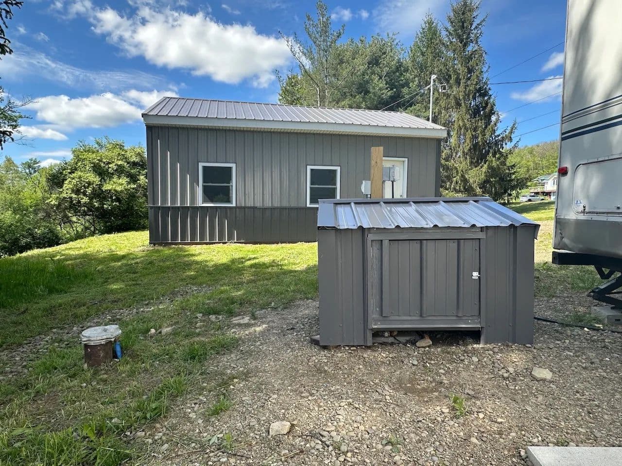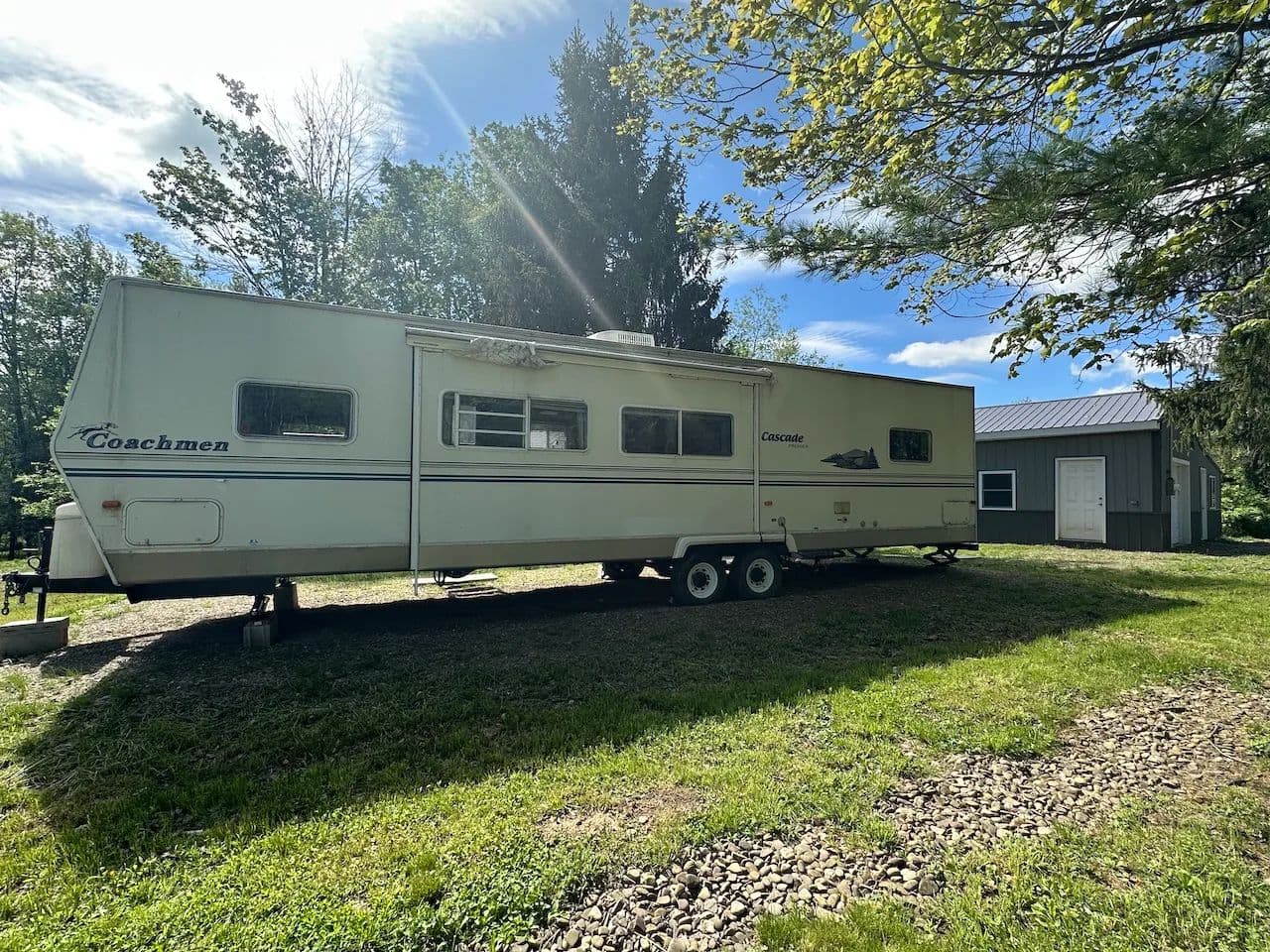 This hunting property includes a travel trailer, new garage, pond, and creek located near State Land in Birdsall NY, Allegany County.