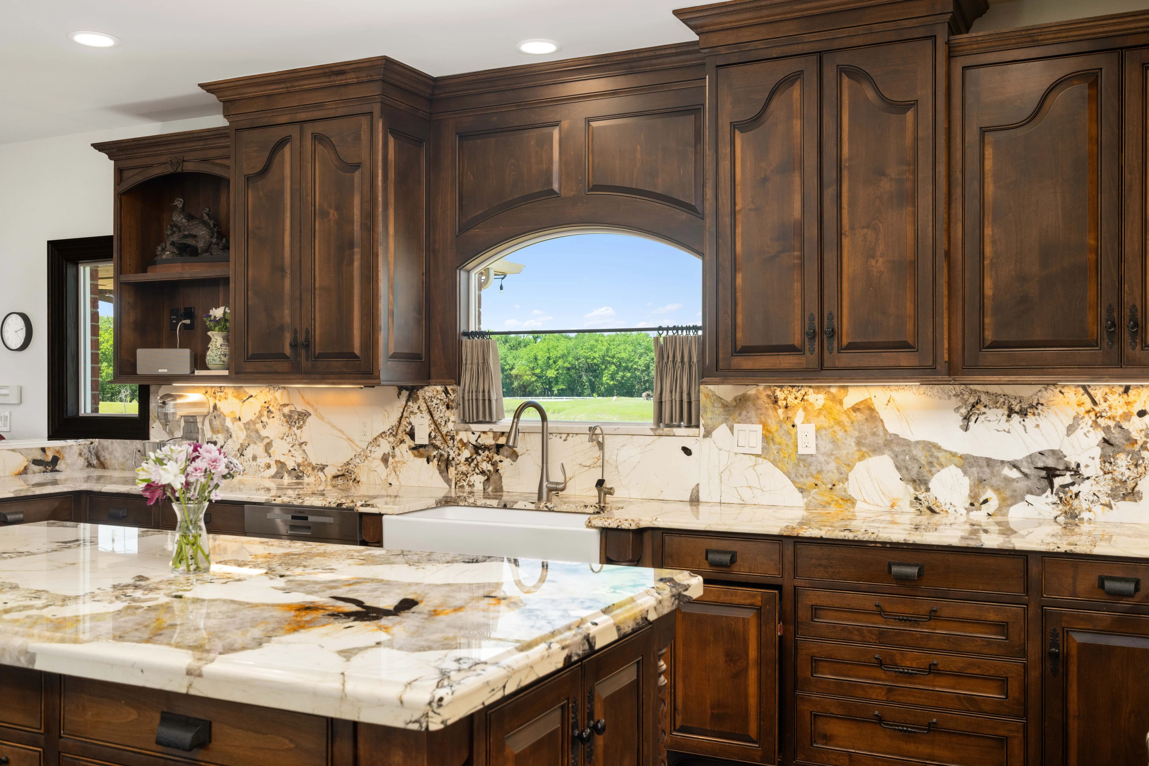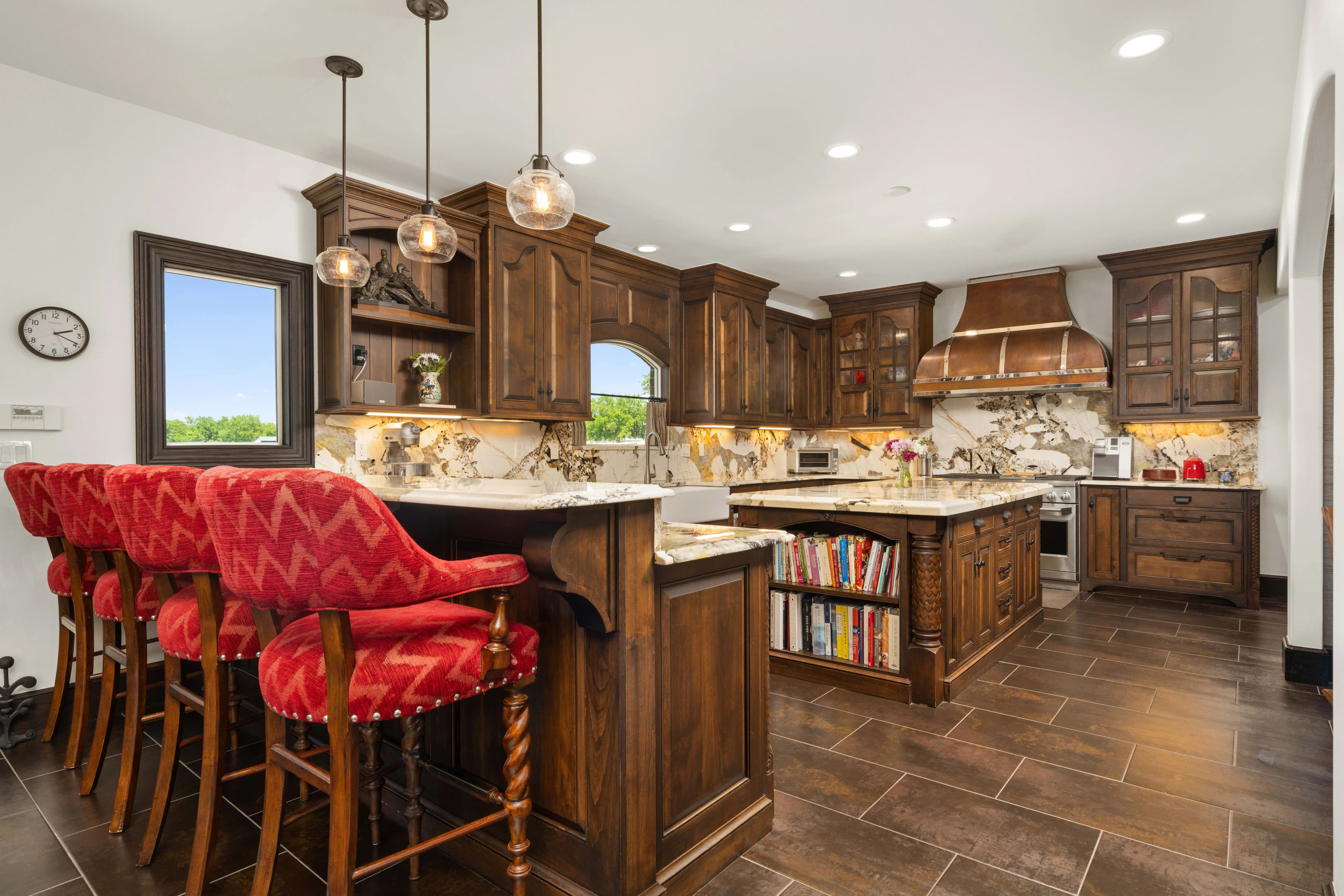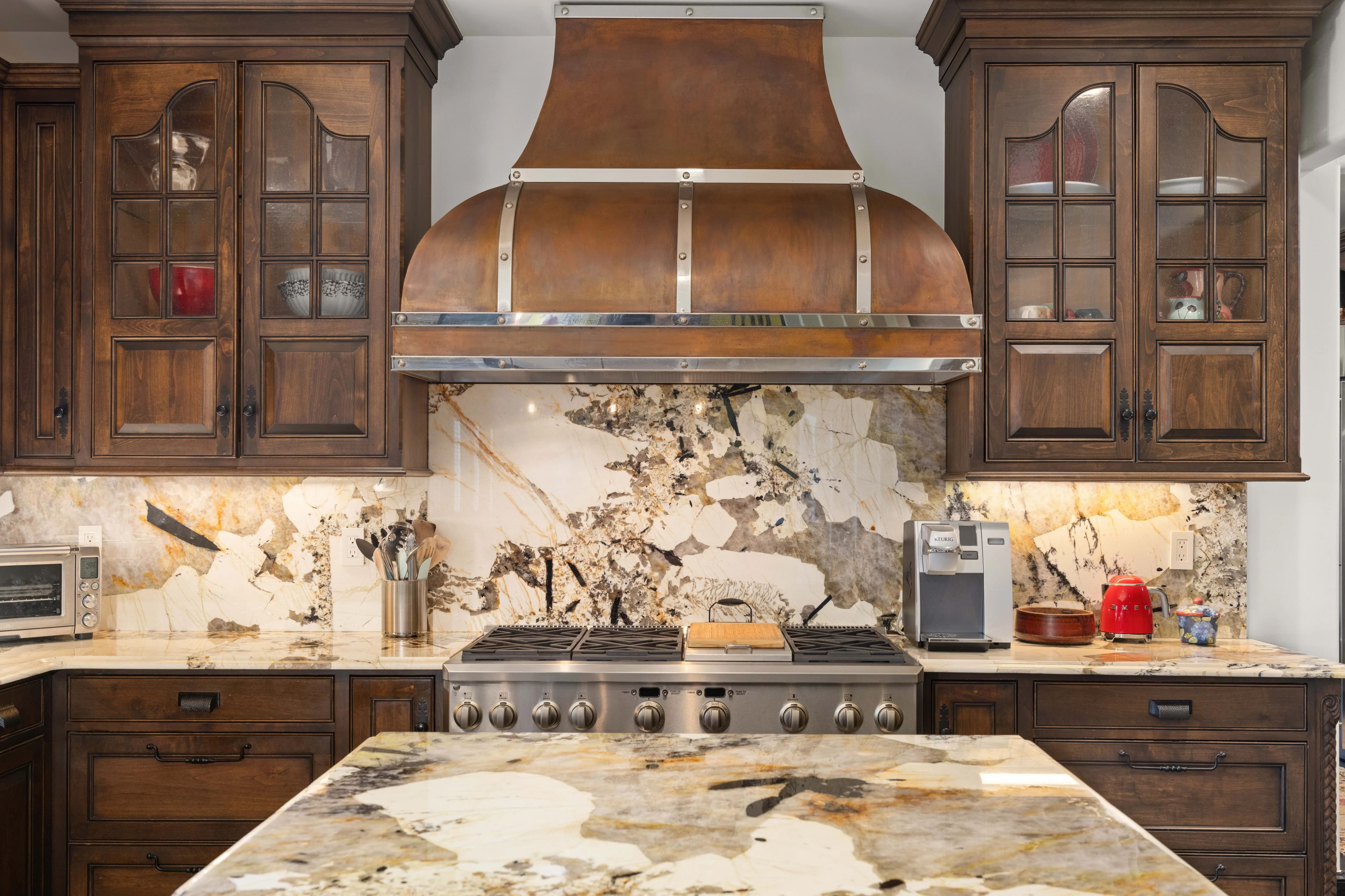 Originally built with quality and extensively remodeled in 2018, the home features high-efficiency gas conversion, rich oak and alder custom cabinetry, Carrera marble floors, and striking crystal granite countertops. The gourmet kitchen is a showpiece with GE Monogram appliances, handmade copper/stainless vent hood, beamed ceilings, and an oversized island — perfect for everyday living or hosting in style. Every room, from the reimagined laundry and pantry to the formal foyer and office, reflects thoughtful design and top-tier finishes.