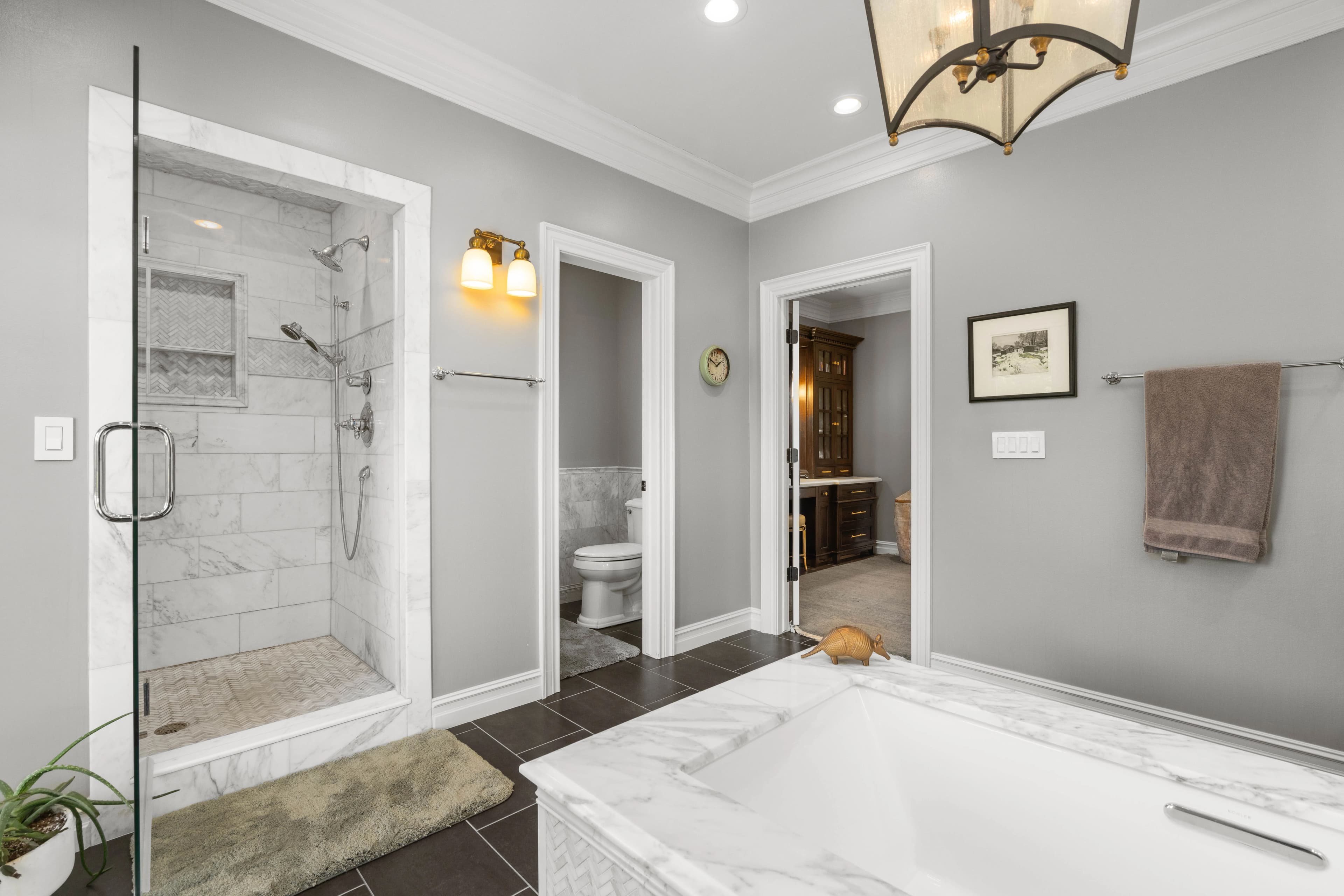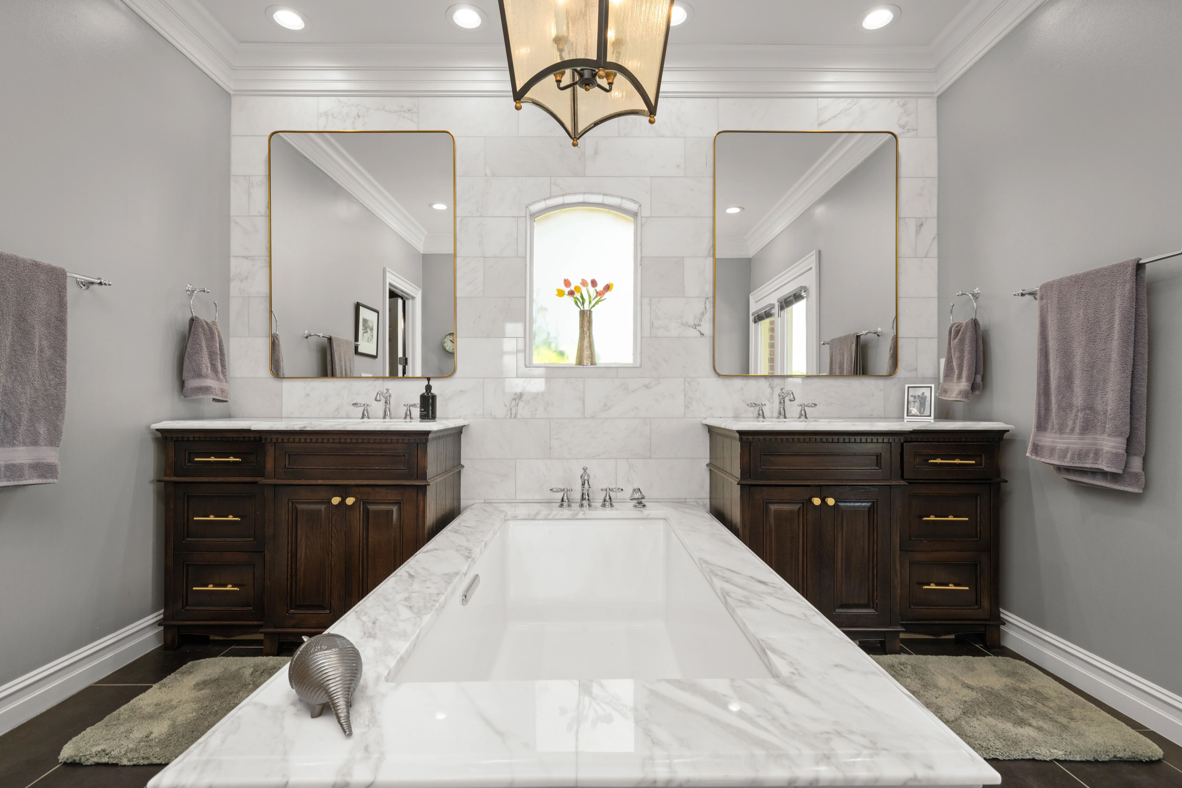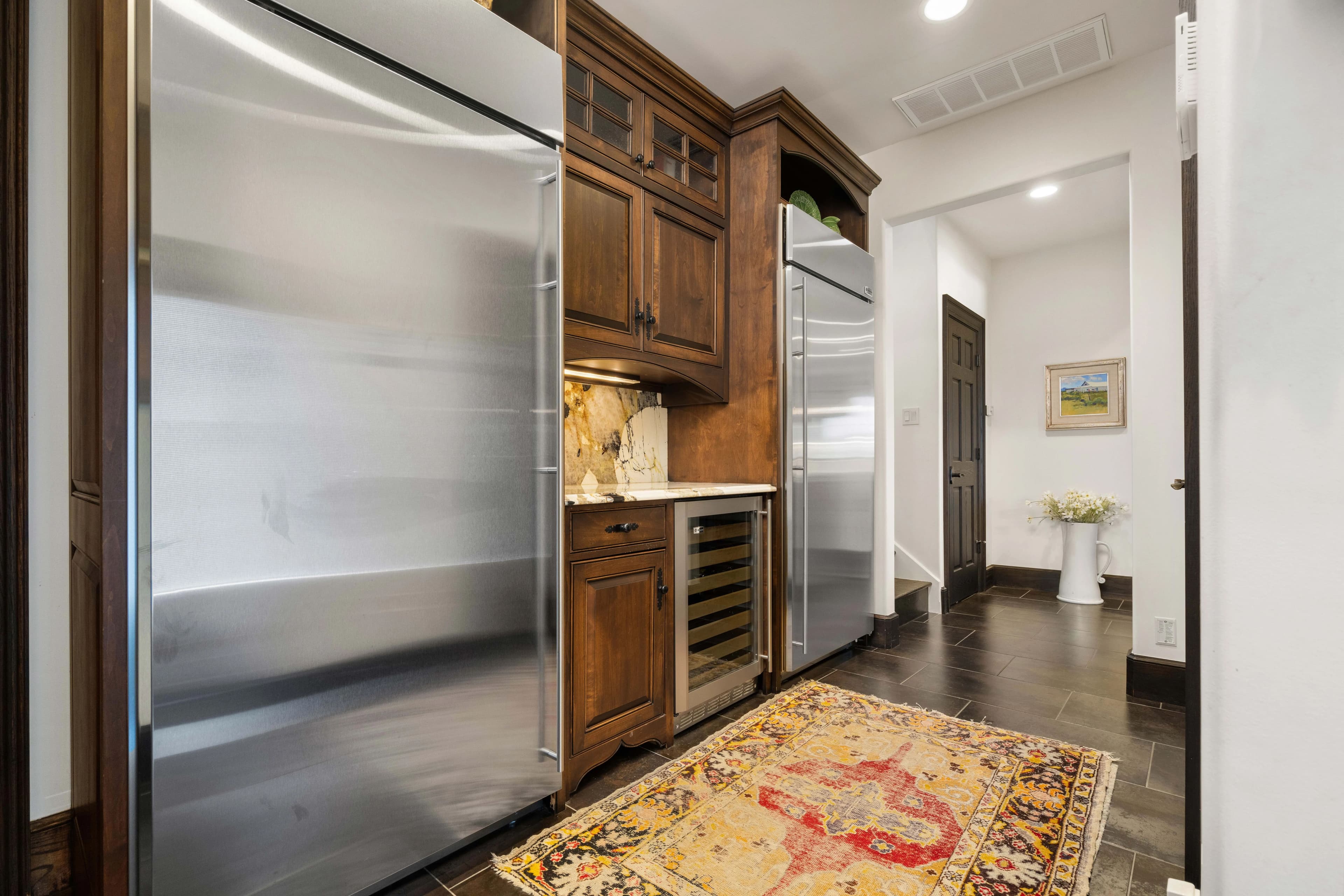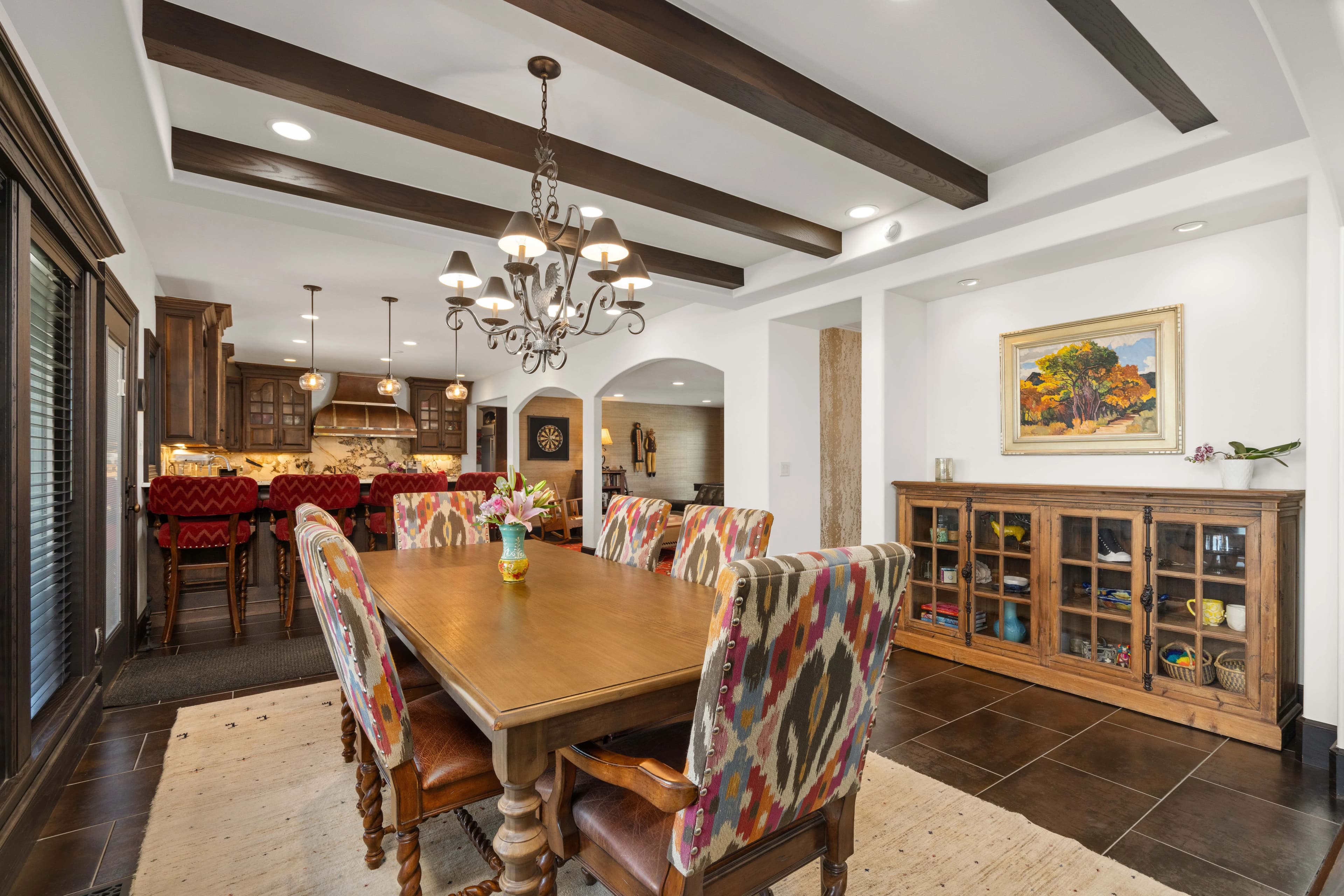 Originally built with quality and extensively remodeled in 2018, the home features high-efficiency gas conversion, rich oak and alder custom cabinetry, Carrera marble floors, and striking crystal granite countertops. The gourmet kitchen is a showpiece with GE Monogram appliances, handmade copper/stainless vent hood, beamed ceilings, and an oversized island — perfect for everyday living or hosting in style. Every room, from the reimagined laundry and pantry to the formal foyer and office, reflects thoughtful design and top-tier finishes.
