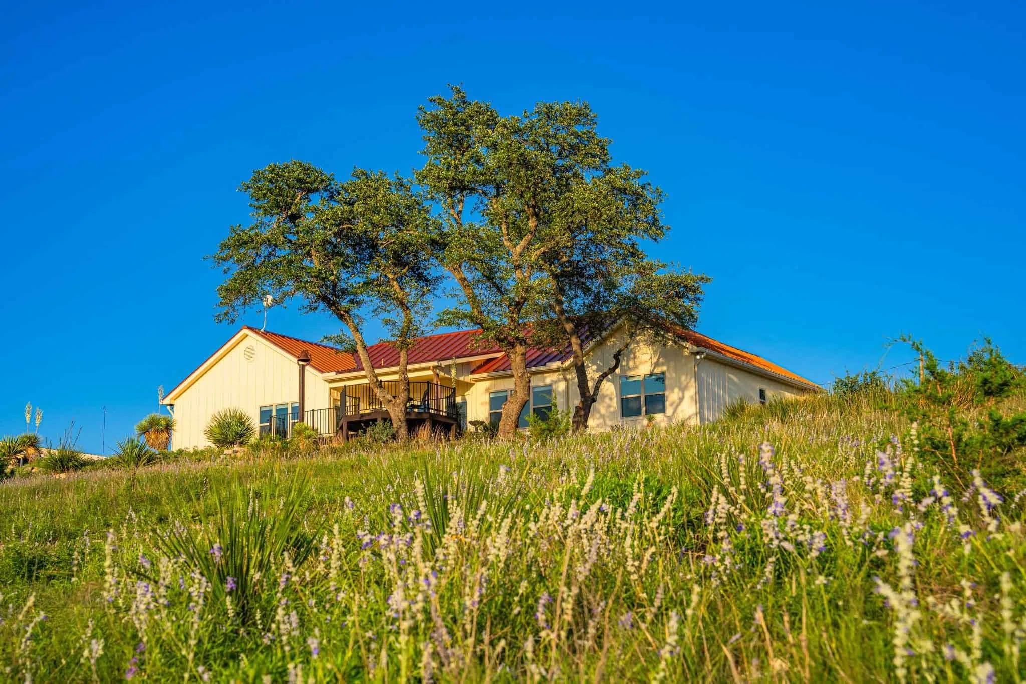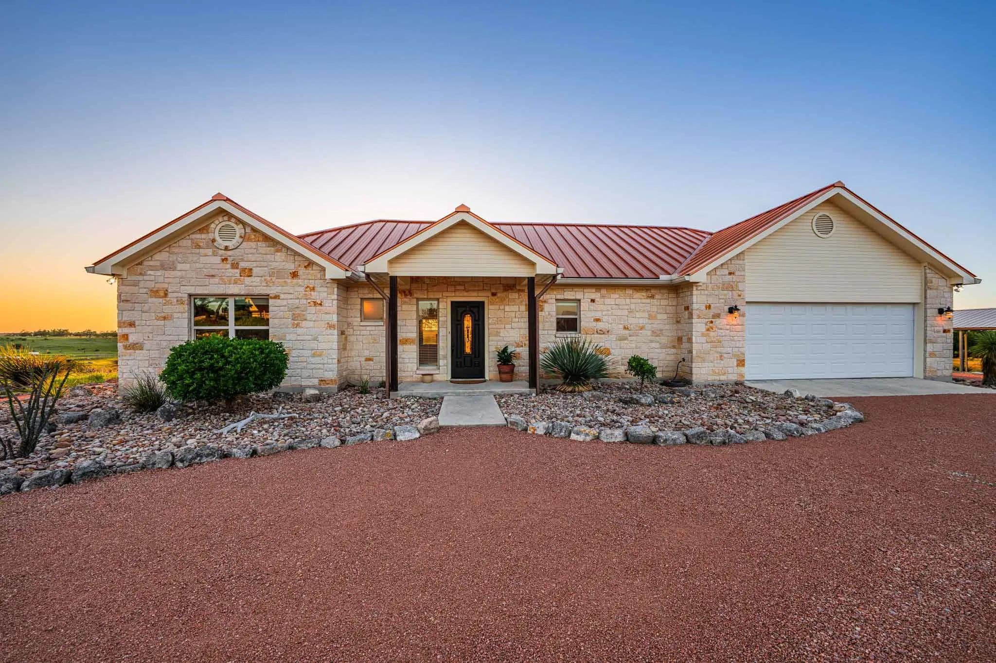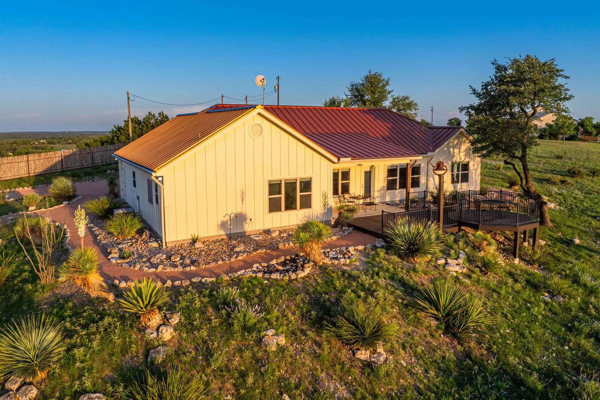 Welcome to your private retreat—Scenic Trail Retreat is an 8± acre Hill Country property that offers an ideal blend of privacy, functionality, and stunning natural beauty. Perched on a hilltop, the three-bedroom, two-and-a-half-bathroom rock home features vaulted ceilings, concrete floors, and a chef-style kitchen with granite counters and custom cabinetry. Expansive windows and a back deck showcase the sweeping views and colorful sunsets. The land rolls gently from hilltop to valley, where a large solar-powered barn provides ample storage, workspace, and covered equipment areas. Whether enjoying the comfort of the home or exploring the peaceful acreage, this property delivers a true Hill Country lifestyle.
