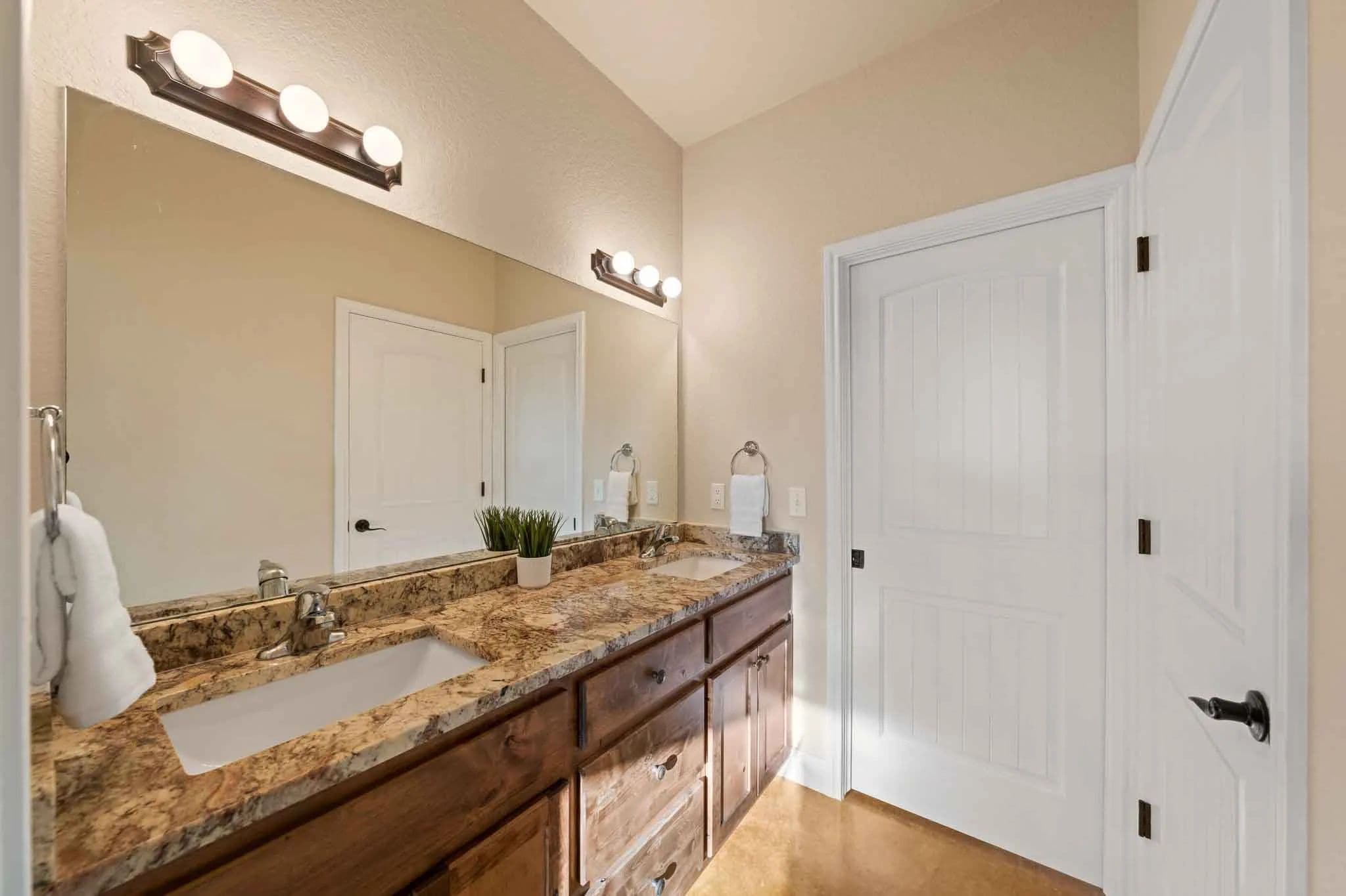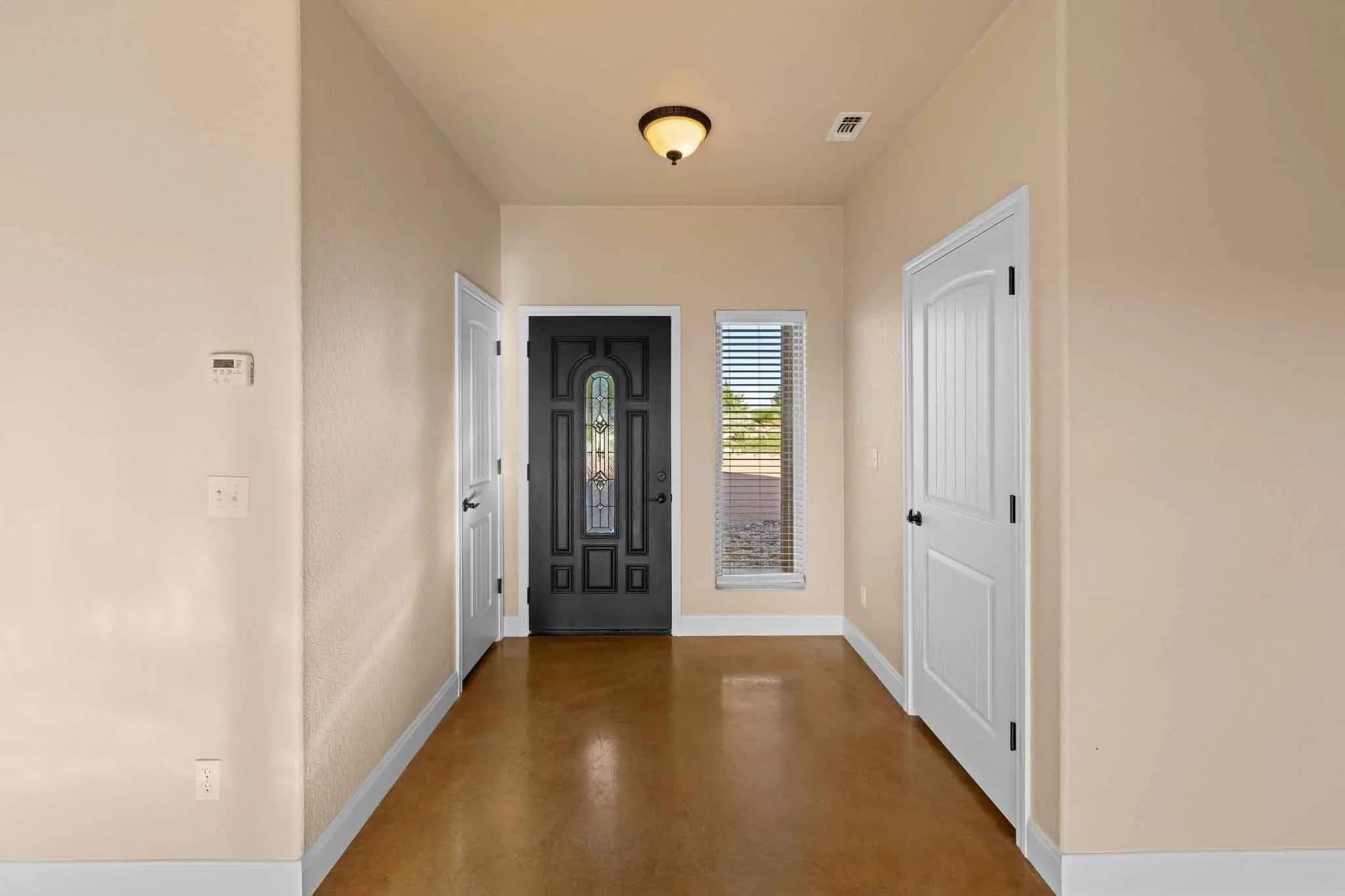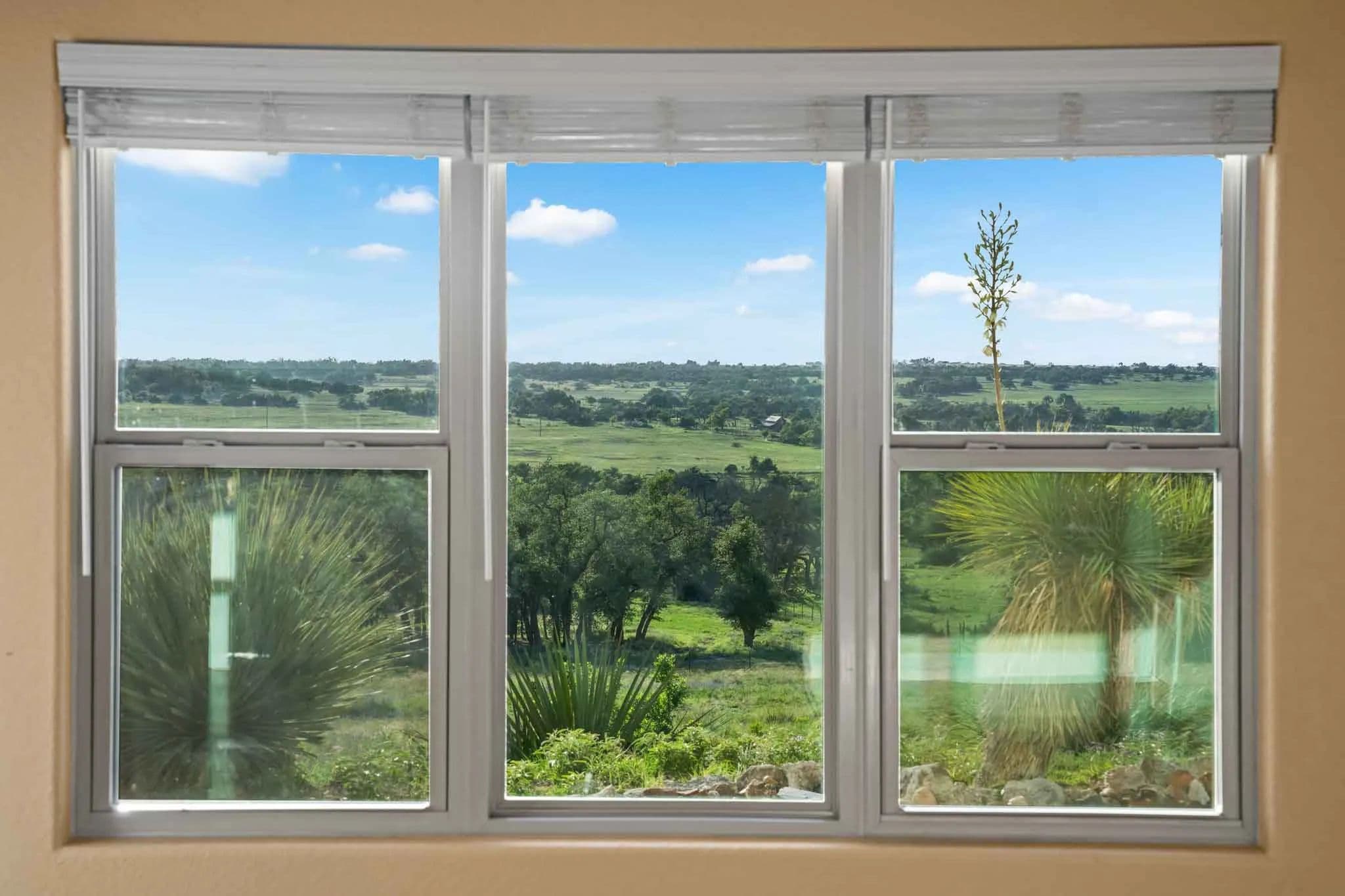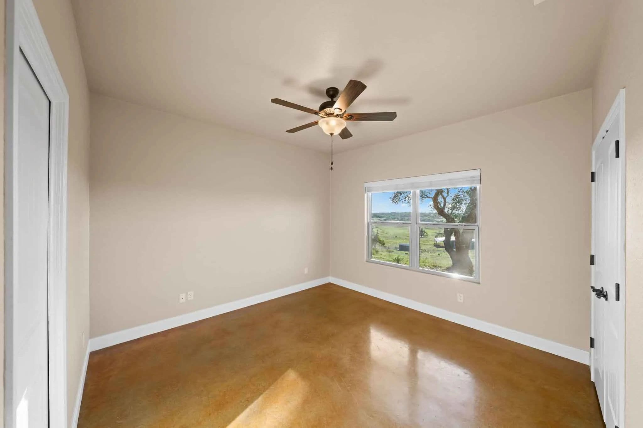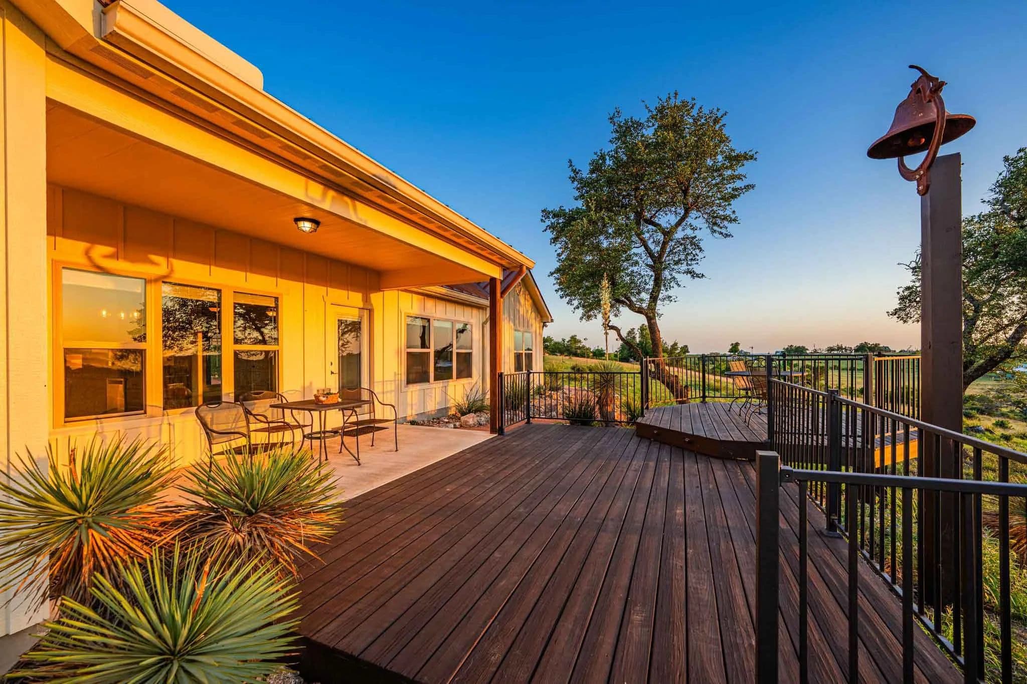 Scenic Trail Retreat features 8± acres and showcases a custom home with a split floor plan, soaring vaulted ceilings, and polished concrete floors. At its heart is a well-appointed kitchen with wood cabinetry, granite countertops, a center island, and an eat-in breakfast bar—perfect for cooking, gathering, and entertaining. Large windows frame panoramic hilltop views, and a back deck offers the ideal spot to relax and enjoy colorful Hill Country sunsets.