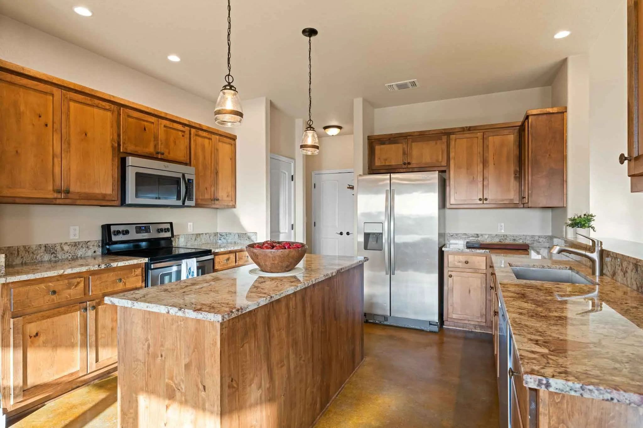 The centerpiece of the property is a beautifully designed three-bedroom, two-and-a-half-bathroom rock home featuring 1,895± sf with a split floor plan ideal for privacy and comfort. The home was built in 2014 and offers soaring vaulted ceilings and stained concrete floors, creating a spacious and durable living environment. The chef-inspired kitchen includes custom wood cabinetry, granite countertops, a center island, and an eat-in breakfast bar, making it both functional and welcoming for everyday living or entertaining. The living and dining areas are filled with natural light and flow seamlessly to the back deck, where you can relax and enjoy sweeping hilltop views and stunning sunsets. The home also offers a two-car garage. Next to the home is a metal carport for additional covered parking.