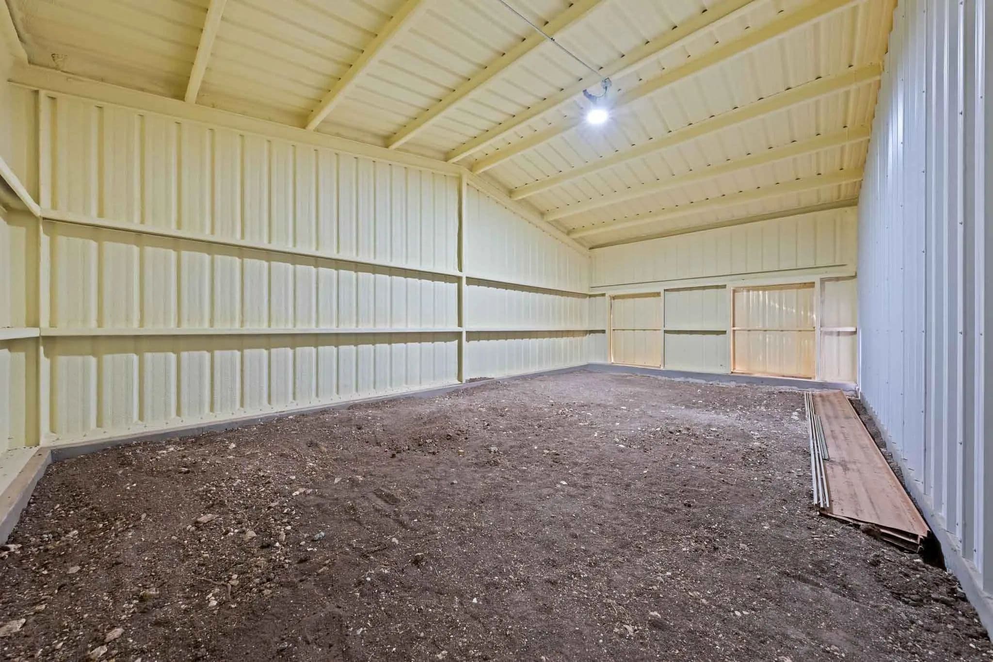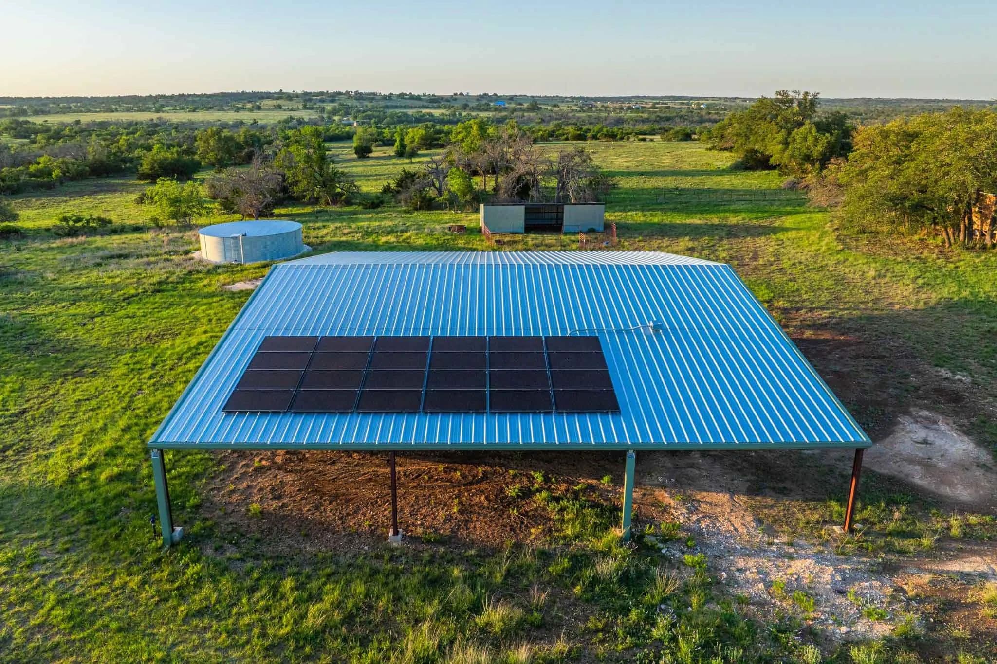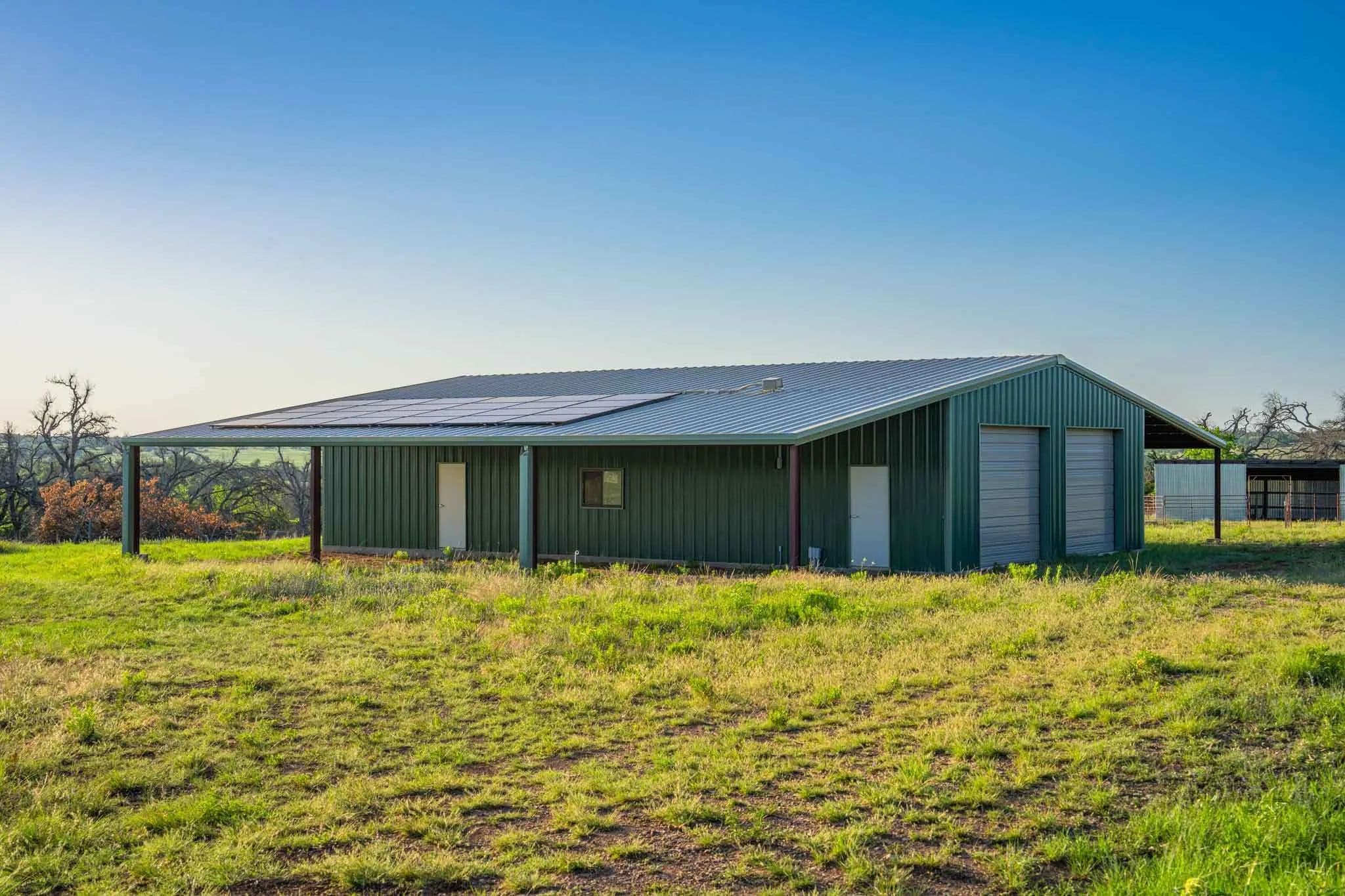 Just below the home, tucked into a private valley, is a 2,160± sf metal barn offering excellent utility and flexibility. The barn includes general storage, a climate-controlled storage room, and a workshop area with two large roll-up garage doors. Two 20'± x 60'± wings on either side provide additional covered space, perfect for equipment, trailers, or projects. The barn is powered by its own solar panel system, enhancing the property’s off-grid capabilities.
