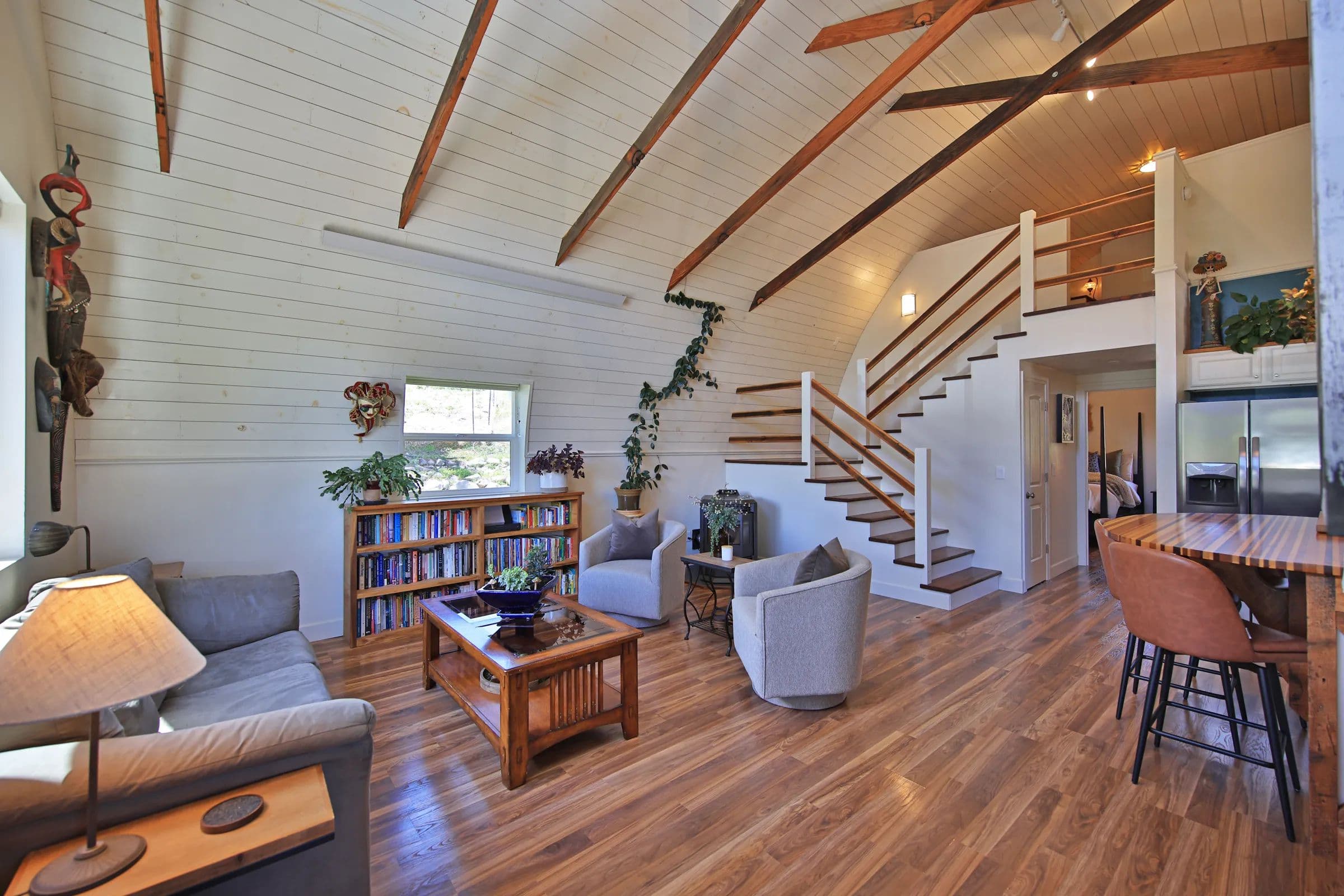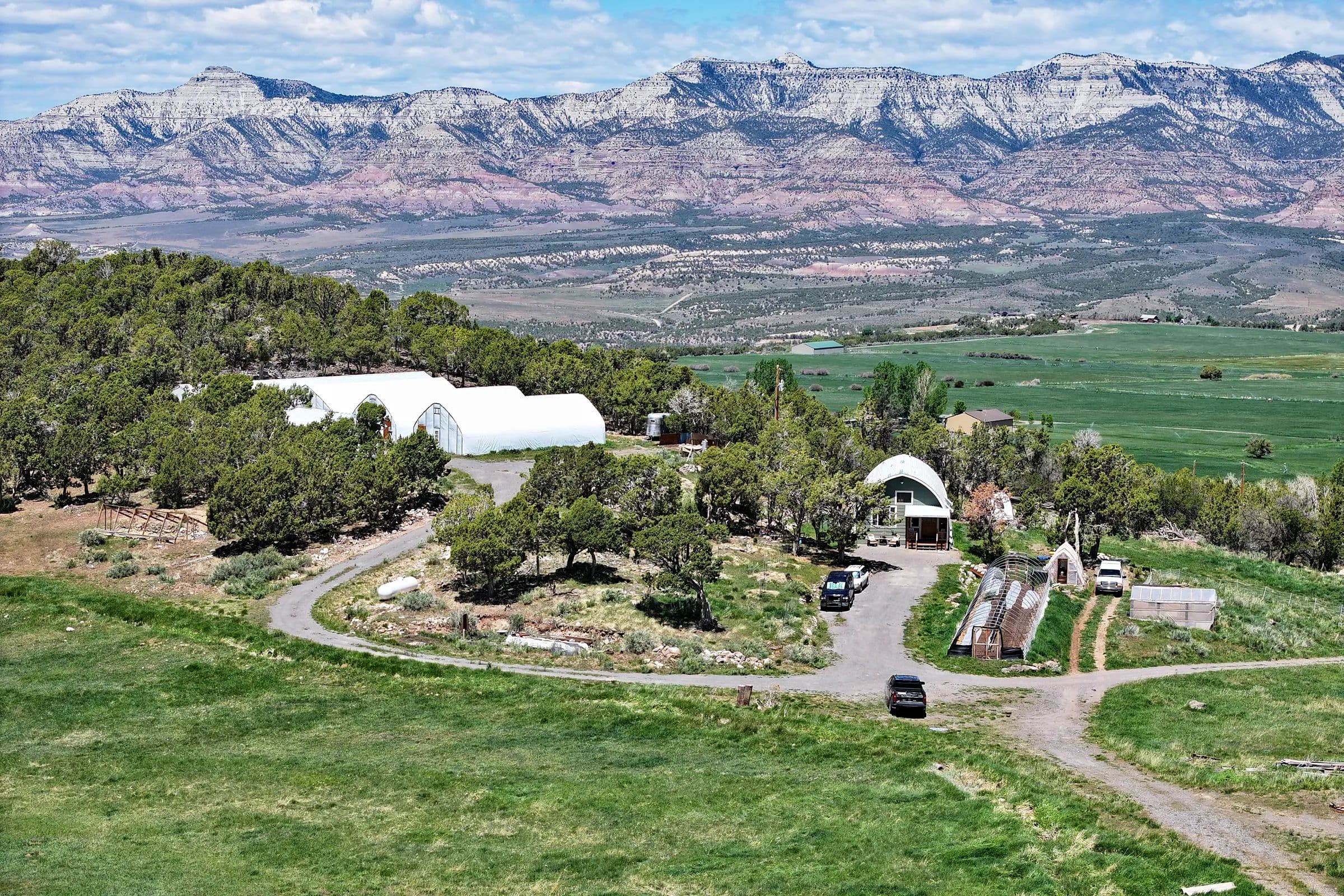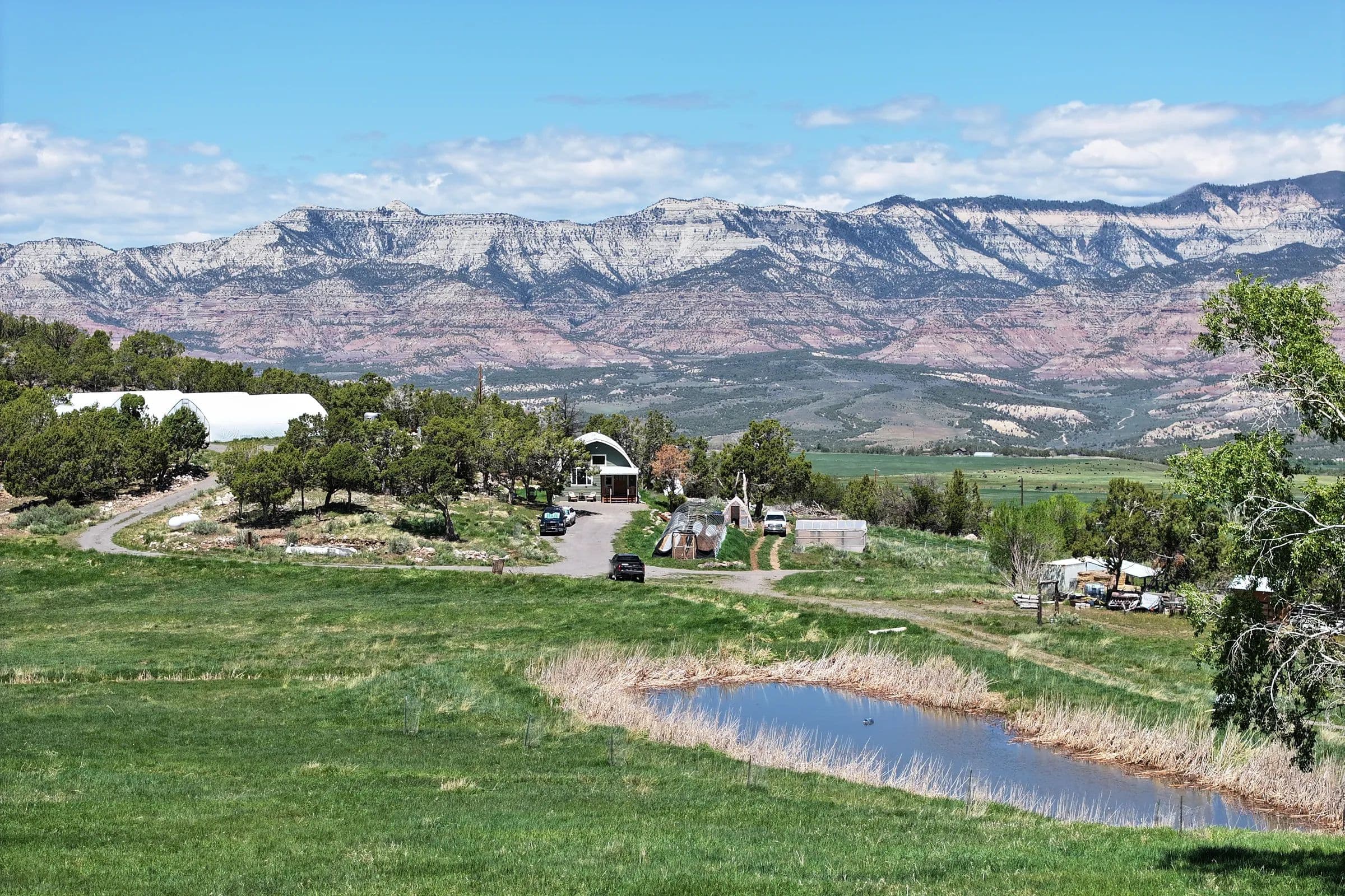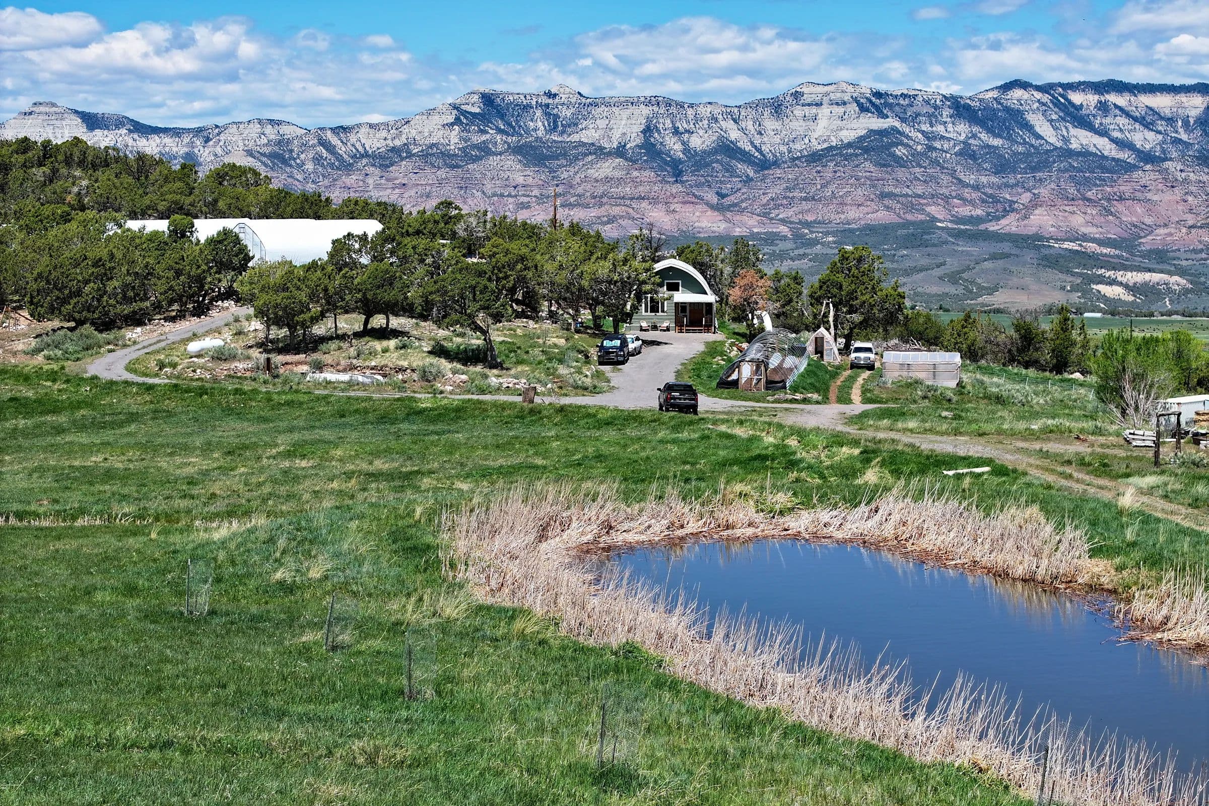 Western Colorado mountain home with custom features on 35 fully fenced acres, with irrigation, and a professional setup for specialty crops. Enjoy quiet and privacy on this rural property yet remain just minutes from the historic western town of Collbran and a short drive to the I-70 corridor for travel, adventure, or residential needs. From I-70, drive Highways 65 and 330 through scenic canyons, along creeks, with frequent wildlife sightings, mountain valleys, and peaceful country roads to reach this home surrounded by pastures with stunning mountain and valley views. This 960 sq ft, 1-bedroom with a spacious loft and ¾ bath offers a well-designed floor plan enhanced by custom craftsmanship—perfect for efficiency in a Colorado country lifestyle. Enter the home through a covered Trex deck porch and a beautiful arched wood door with embellished glass. Step into a welcoming foyer with a built-in wood bench and continue into the open concept living and kitchen areas, framed by custom crafted vaulted wood cross-beamed ceilings. Shiplap walls with an attractive color scheme, decorative lighting, and a pellet stove bring warmth to the home during chilly Colorado seasons. The kitchen features stunning handcrafted hardwood counters with a spacious breakfast bar, stainless steel double-door refrigerator, dishwasher, electric range with vented hood, deep farmhouse sink with arched extended spray faucet, garbage disposal, and under-counter microwave. Custom wood cabinets with shelving nooks and under-stairway storage offer functionality and charm. The large bathroom includes a walk-in tiled shower, vanity, and floor-to-ceiling storage unit. The laundry area includes a Direct Drive Hydroshield efficiency washer and dryer. The main bedroom is conveniently located on the main level. A pine wood stairway leads to a roomy loft featuring a wood ceiling and stained-glass light fixture overlooking the living area. Additional comfort features include a tankless eco-friendly electric hot water heater, large double-paned windows for abundant natural light, window coverings, spray foam insulation, wood laminate flooring, and convection electric wall-mounted heat units. Landline, cell, and internet service are available. UPS and FedEx delivery services are also accessible. Natural terrain landscaping creates ideal outdoor spaces for family activities, entertaining, or simply enjoying the views and frequent wildlife sightings. Stone and wood steps lead to multiple areas including a covered chicken coop and an organic caterpillar-style greenhouse. An underground water system is supplied by a year-round pond. This custom property offers year-round agricultural production and peaceful country living under Colorado blue skies and star-studded nights.