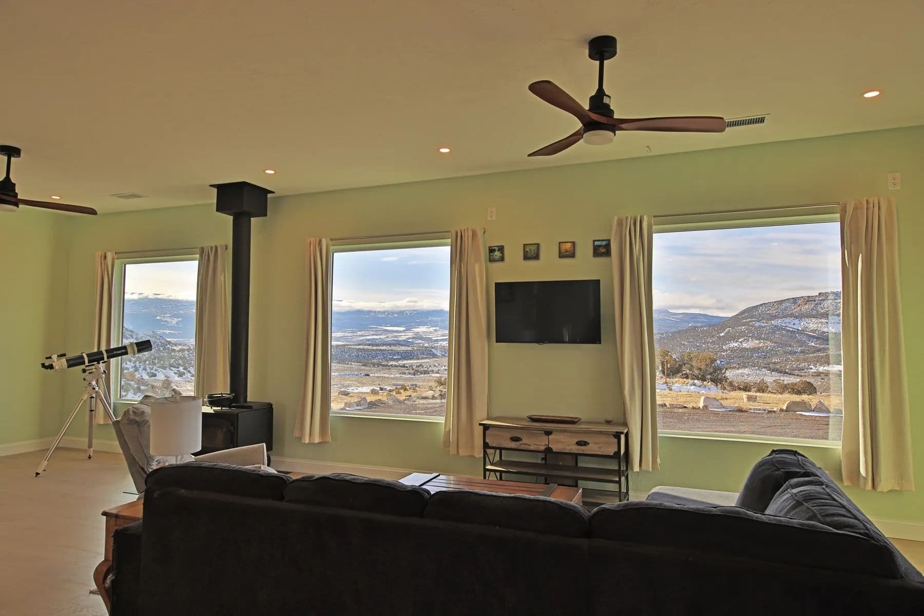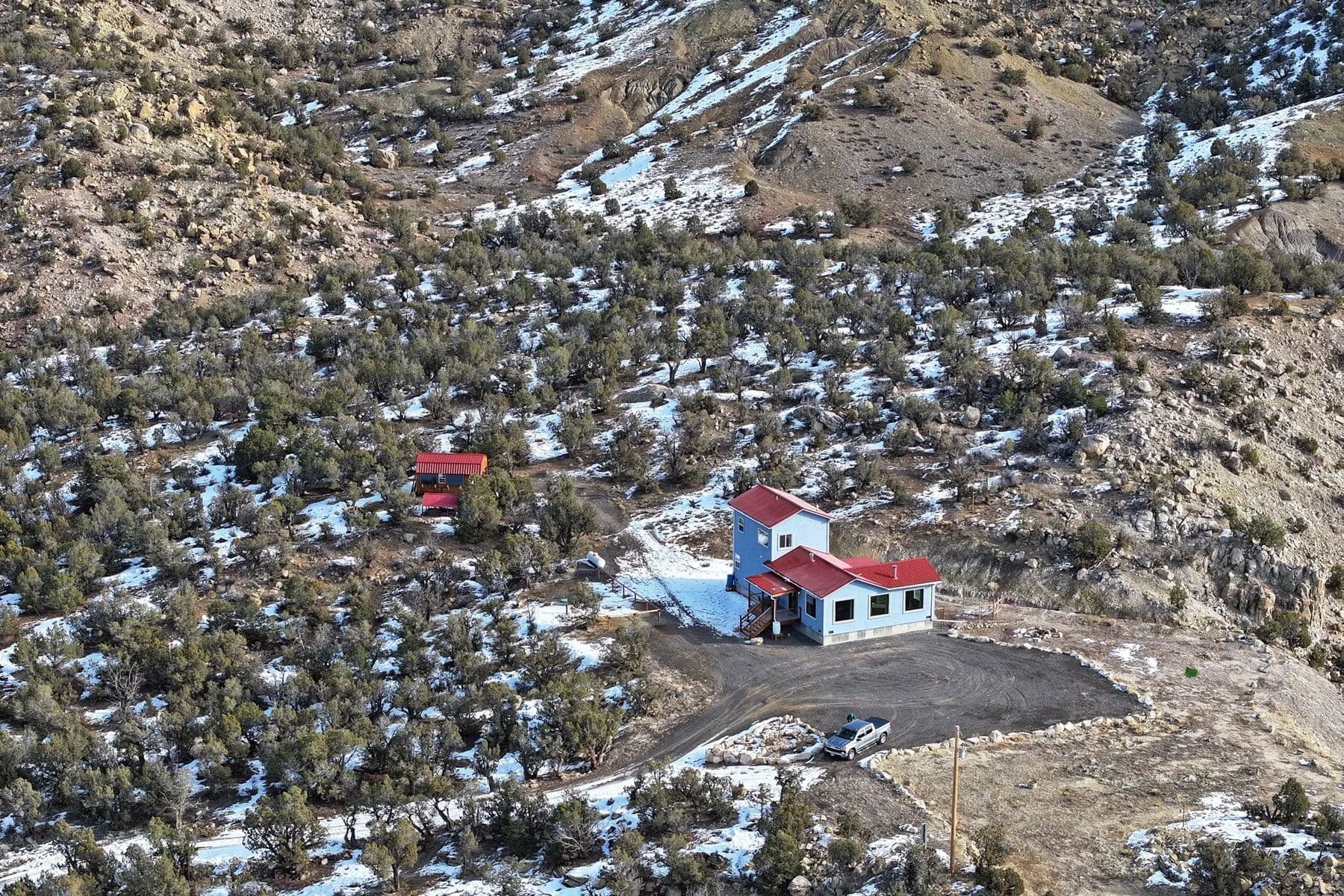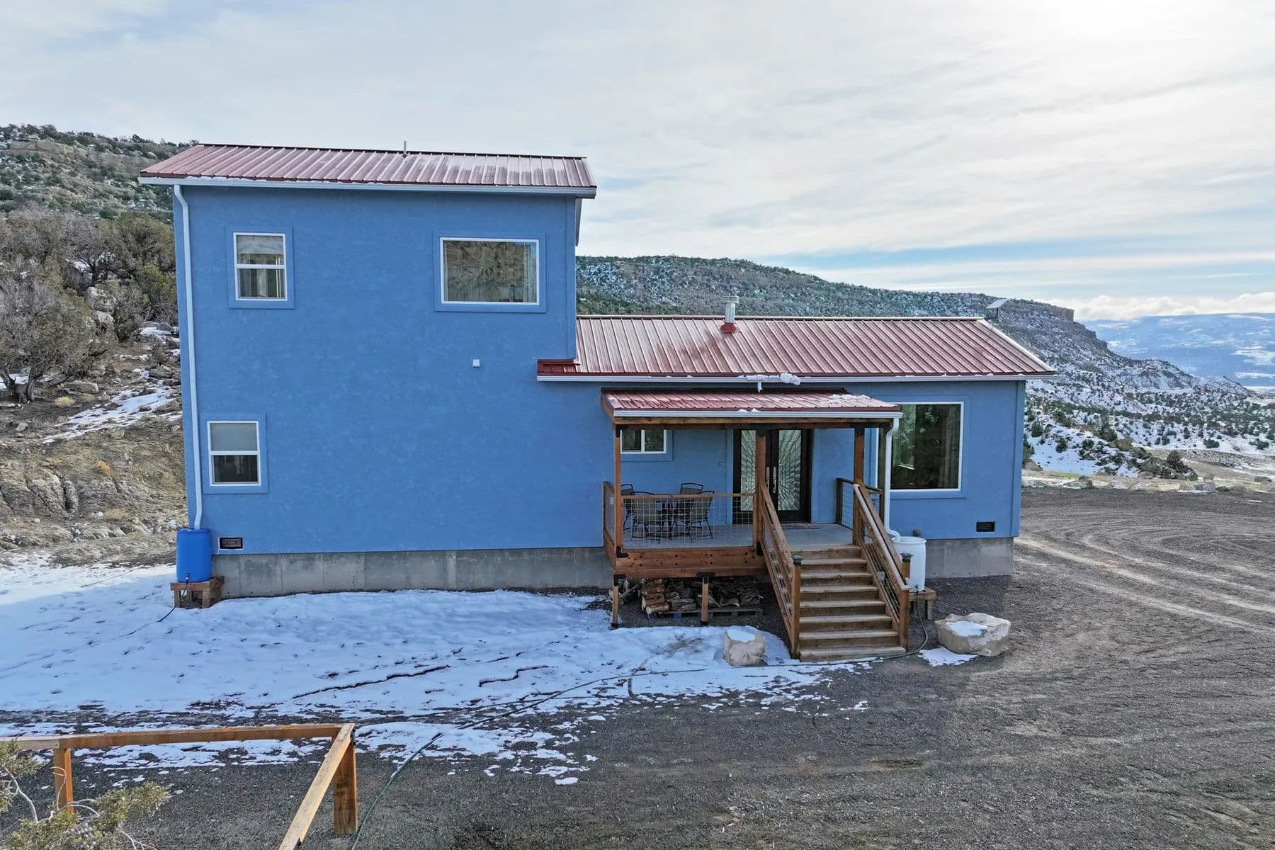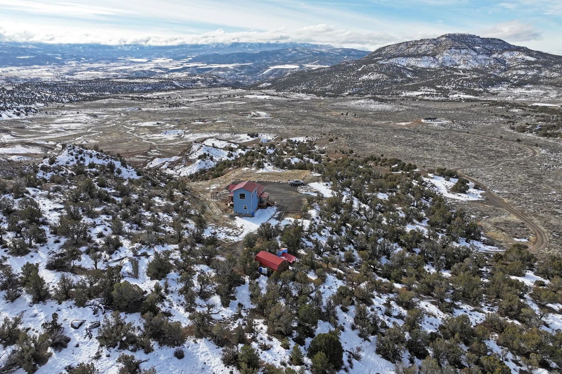 Stunning 2173 sq ft home built in 2020 on 40.16 acres bordering BLM (3,000 acres of public land) on the north and east side for sale in Mesa. This beautiful home is surrounded by vast mountain and valley views in quiet privacy and Colorado outdoor recreation in every direction. Leave 45 ½ rd and travel a winding graveled lane with scenic views, along the cedar tree lined circle drive to this gorgeous 2 story, 2 bedroom, 1 bath home amid natural terrain grasses, rock and cedar trees. Wildlife of all kinds can be spotted on or near the property and the views are unsurpassed. Covered deck entryway leads to the gorgeous lead embellished french doors with ornate fixtures. Step into the open concept area with vaulted ceilings, engineered hardwood floors, large windows with natural light and magnificent views of Powderhorn Ski Resort and Grand Mesa National Forest. Remote controlled ceiling fans, energy efficient recessed lighting, and wood stove all add to the cozy atmosphere giving a spacious feel and plenty of room to entertain or relax in. Fix a meal or snack in the state-of-the-art Chef’s kitchen with stainless steel updated appliances-gas range with hooded vent, split door refrigerator, dishwasher, deep farm style sink with racks and retractable spray faucet. Also included is a microwave, wood cabinets, pantry, maple butcher block countertops with breakfast bar seating. After a long day at work or mountain play enjoy the enclosed massage steam whirlpool bath/shower with computer- controlled program settings for a luxurious experience in selfcare complete with bluetooth availability. Laundry room with stackable stainless steel GE power steam washer/dryer are included. Spacious guest bedroom with carpet, ceiling fan and walk in closet with shelving and racks are on the main floor. The master bedroom retreat is on the upper level with carpet, large windows to enjoy the glorious views and includes a small sitting area for an office or any other need. Large walk-in closet with shelving and racks. Two sets of glass doors lead to the back covered deck with fenced area and fire pit. Other home features include programable thermostat, central a/c, reverse osmosis system, tankless hot water heater, starlink internet, crawl space, attic access, propane forced air heat and woodburning stove create a comfortable and cozy atmosphere in the country lifestyle. Spacious workshop with solar and chicken coop are included. Easy, year-round access and all the recreation Colorado provides is right out your door (GMU 421).