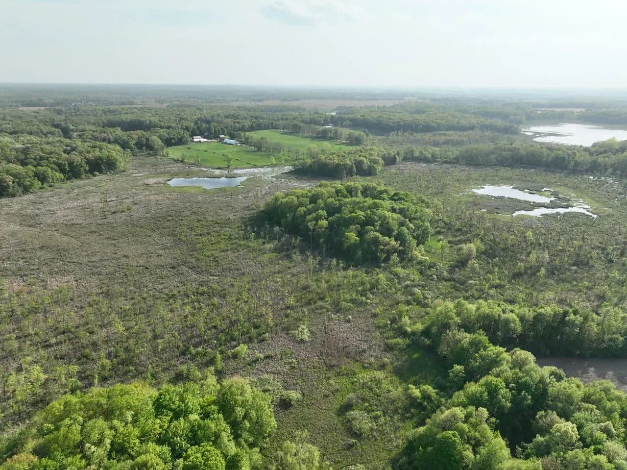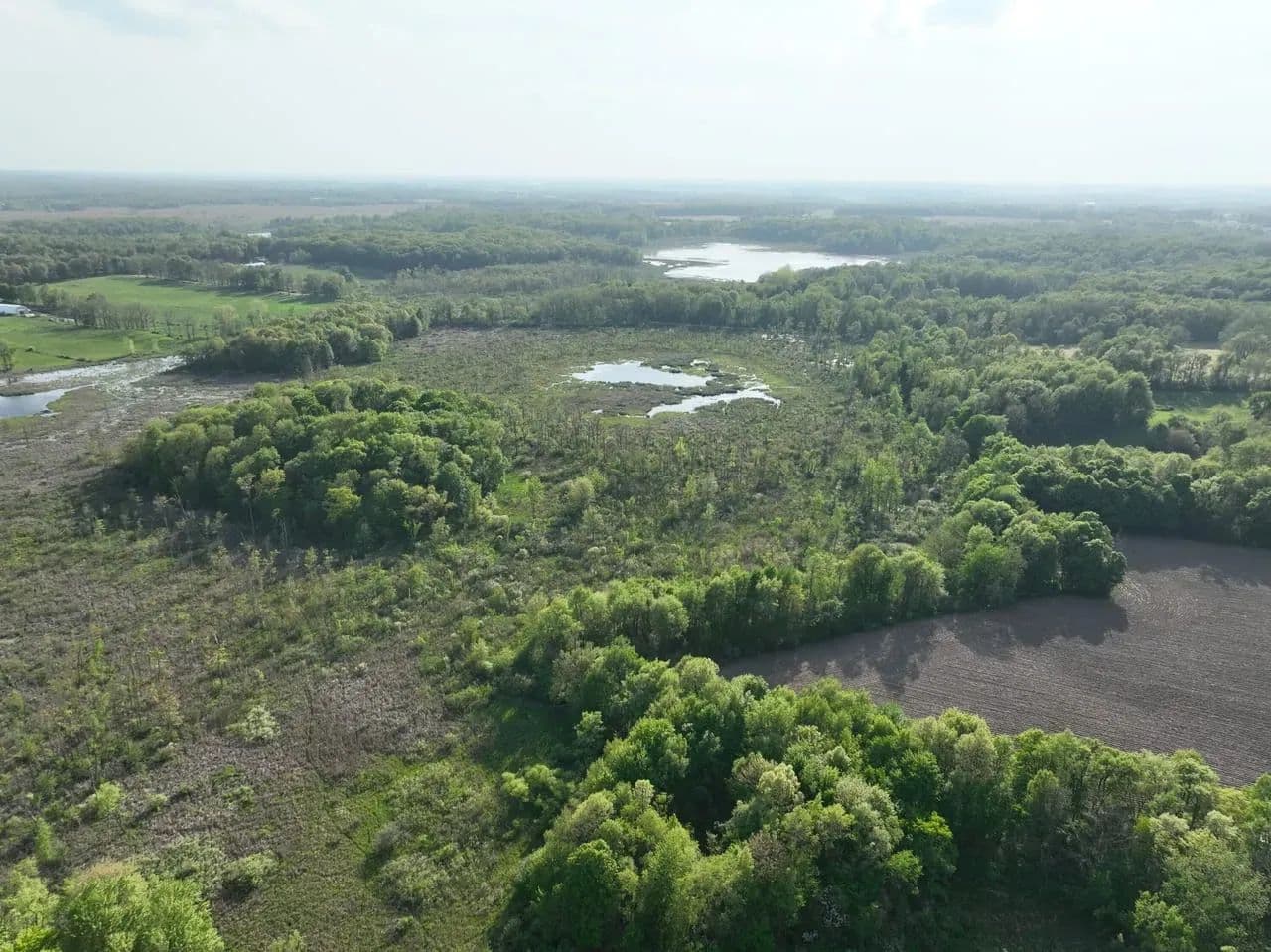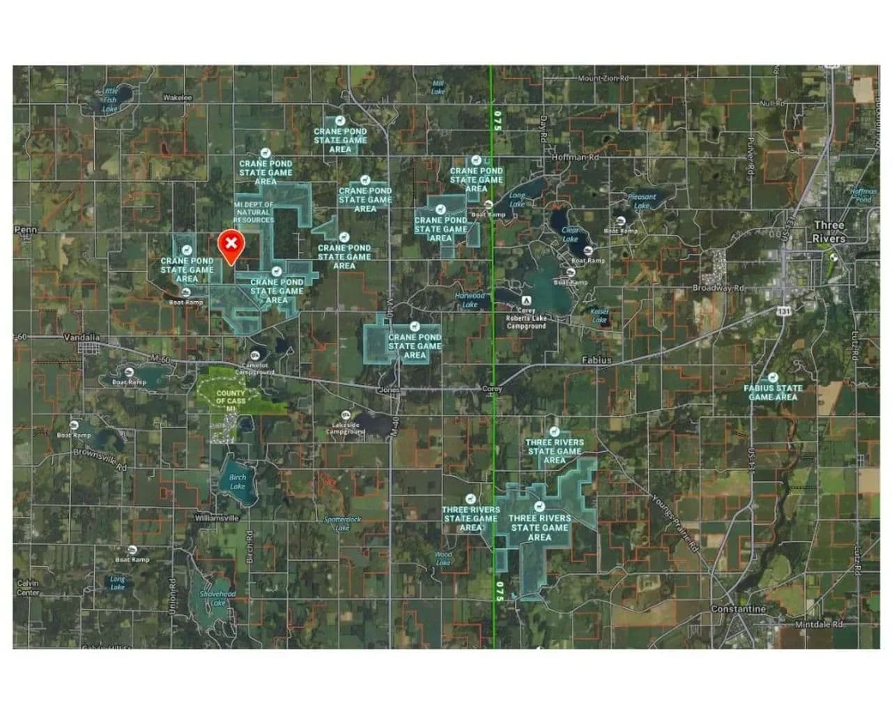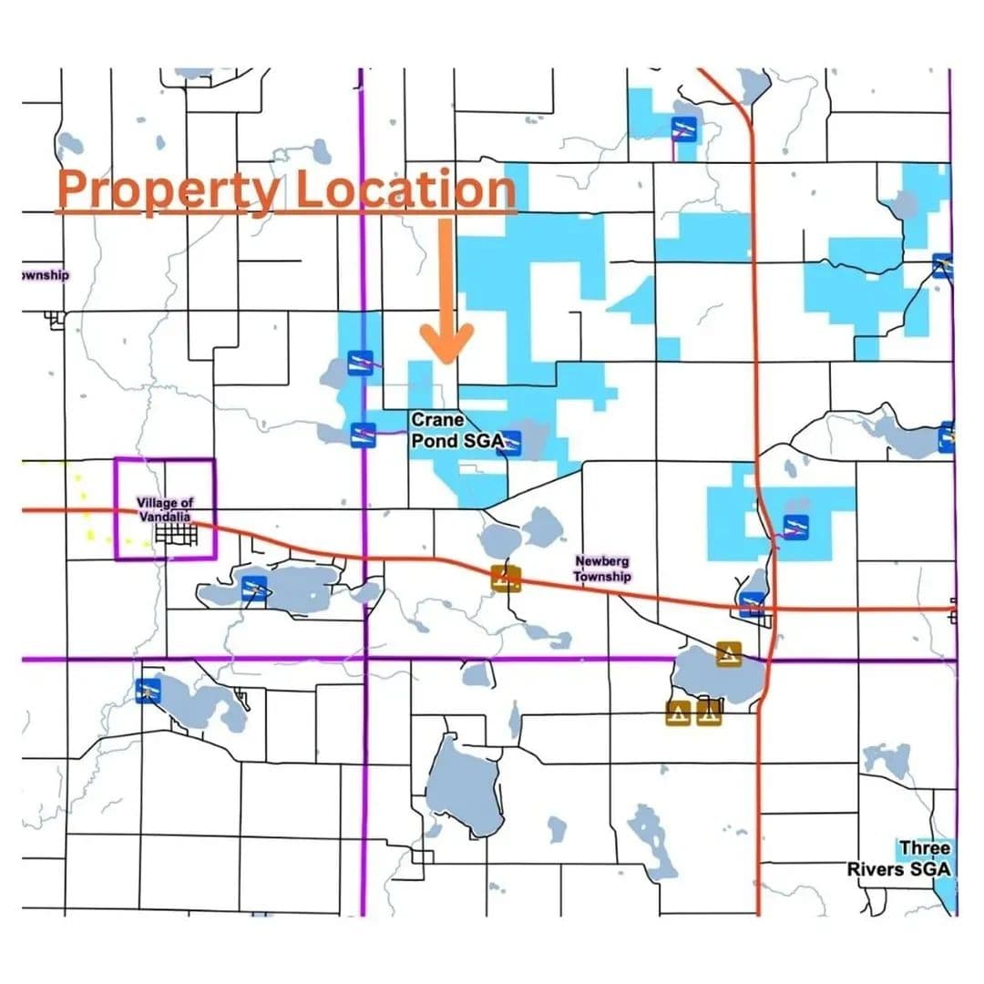 The Crane Pond State Game Area in Cass County, Michigan, encompasses approximately 4,218 acres. This area offers a diverse mix of habitats, including upland mixed deciduous forests, lowland hardwoods, wetlands, and prairie restoration zones. Topography is rolling, with mesic, sandy loam soils, and features a 150-acre prairie unit along with numerous forest openings.