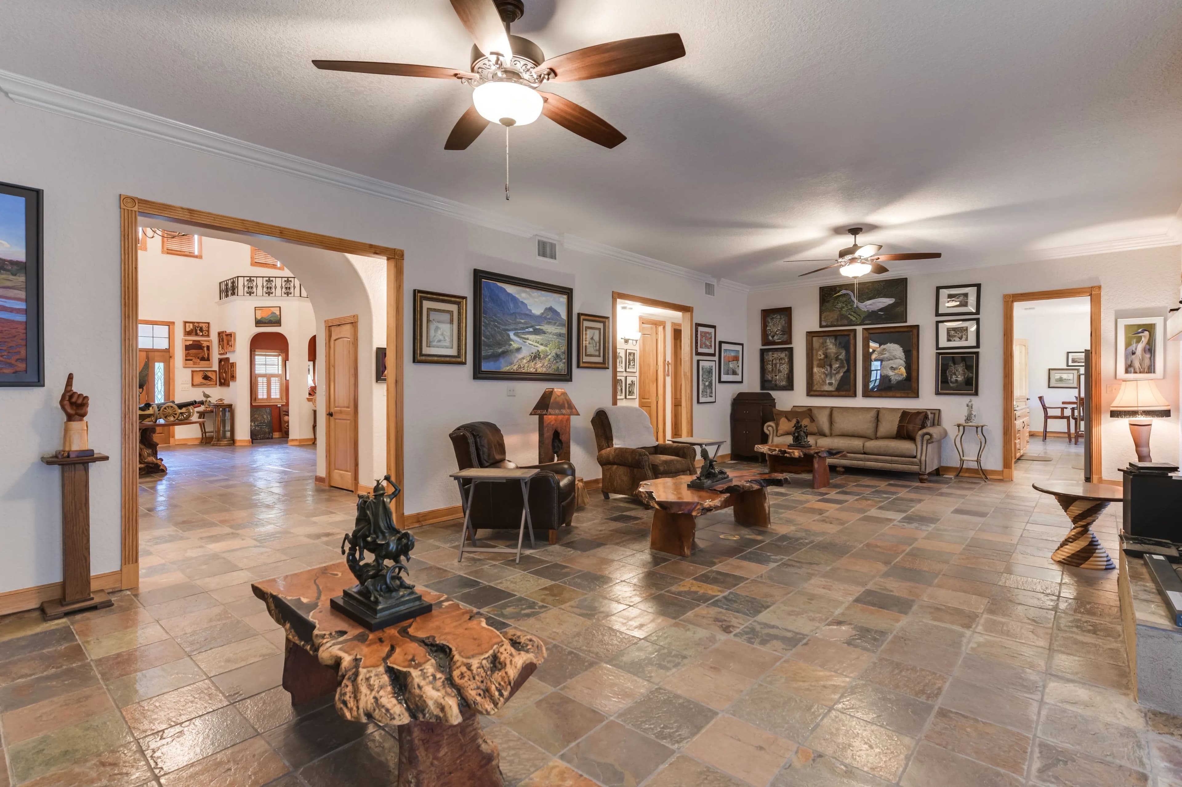 The main residence is a spacious custom-built, two-story home featuring seven bedrooms, multiple fireplaces, a basement and a three-car garage.